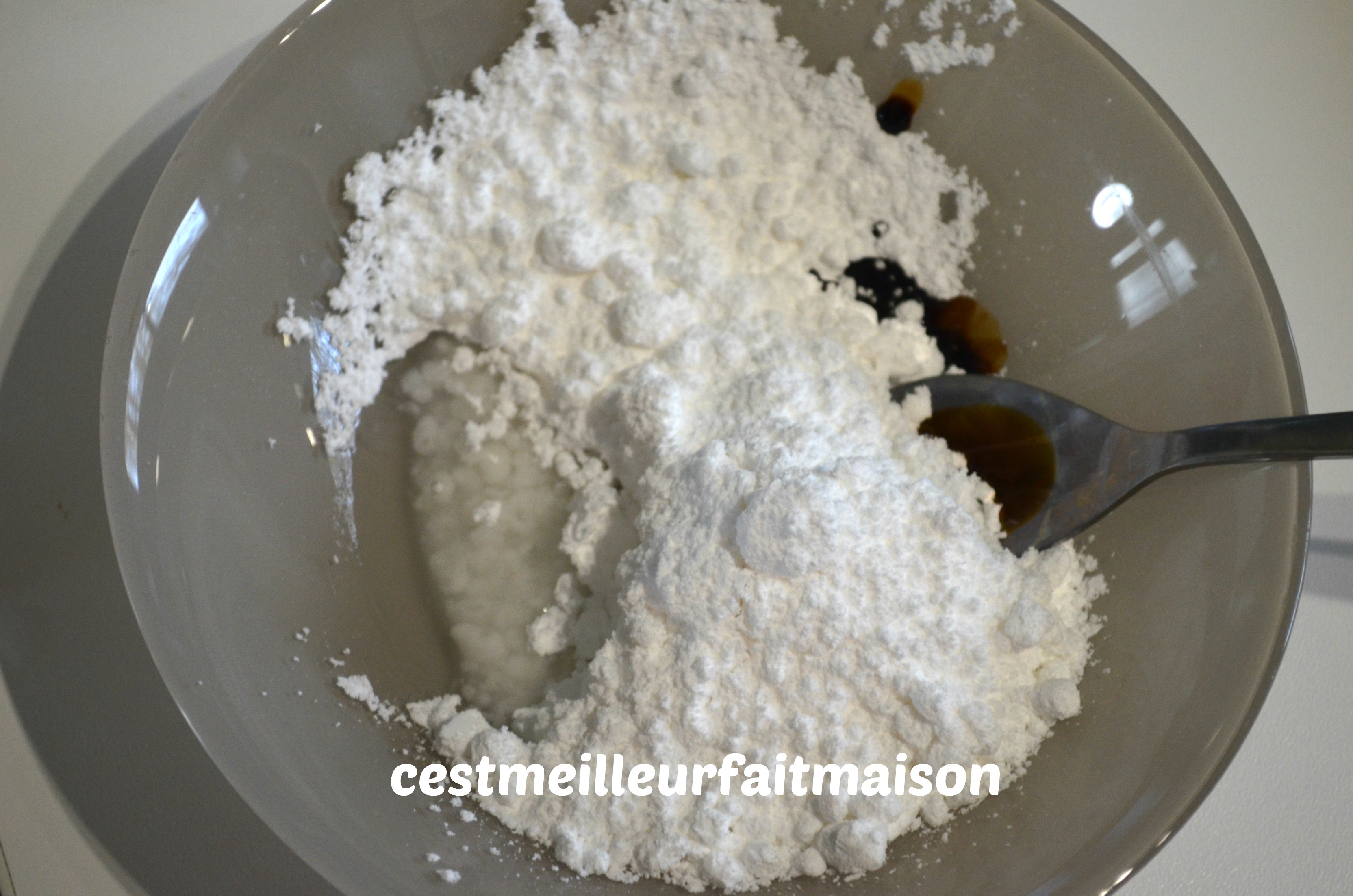 Mélanger le sucre glace avec la 1/2 cc d’extrait de café et un peu d’eau. Le mélange doit être lisse mais pas liquide.