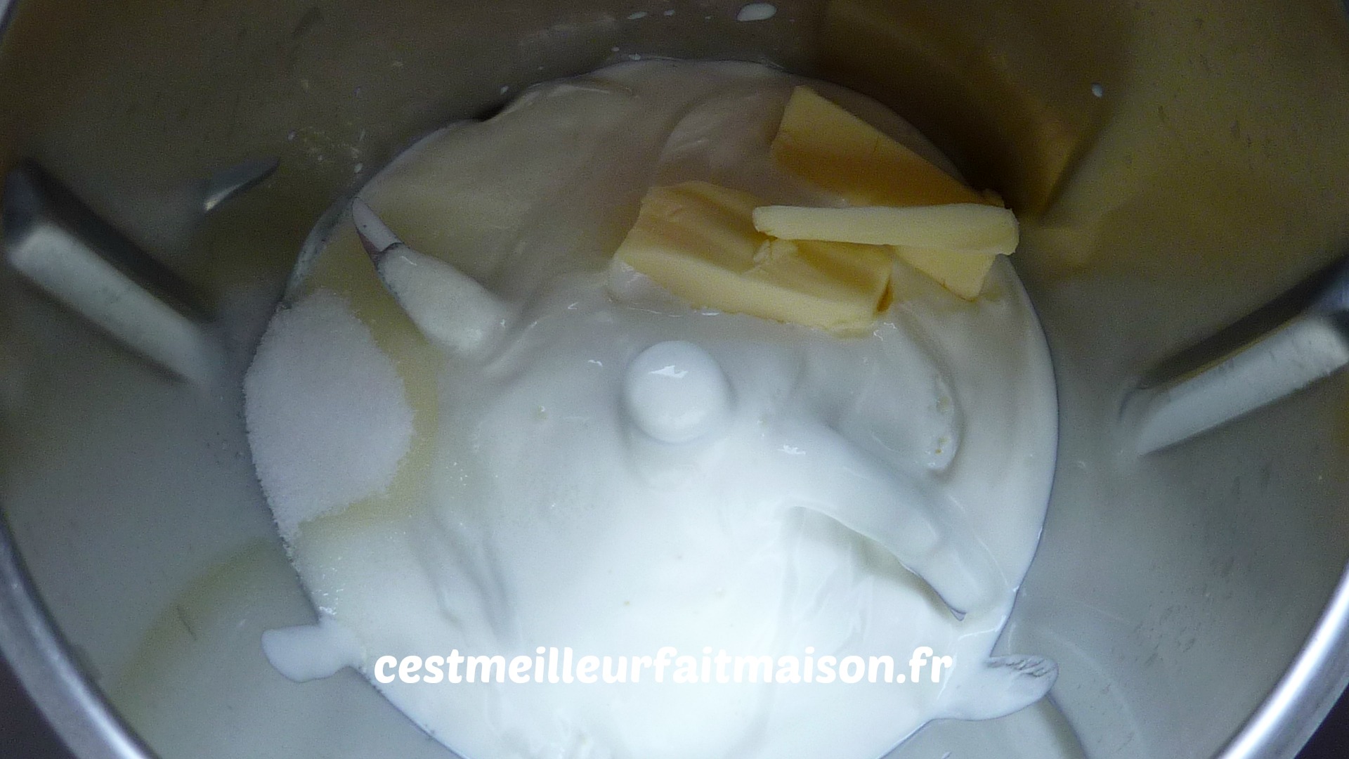 1- Dans le bol du Thermomix, verser les pots de Fjord, le beurre et le sucre. Chauffer 2,30 min/50°C/Vit 1. Laisser tiédir.