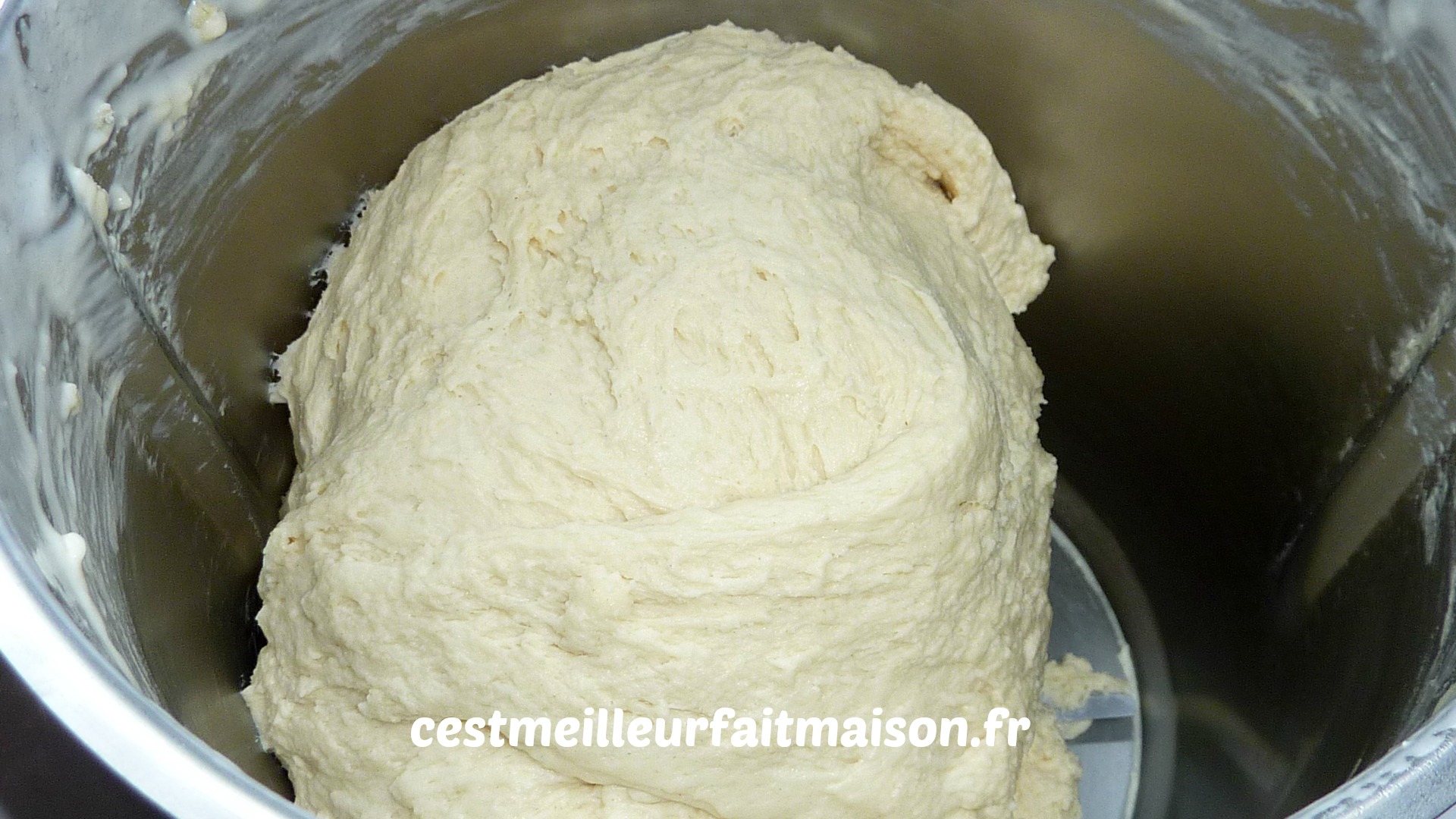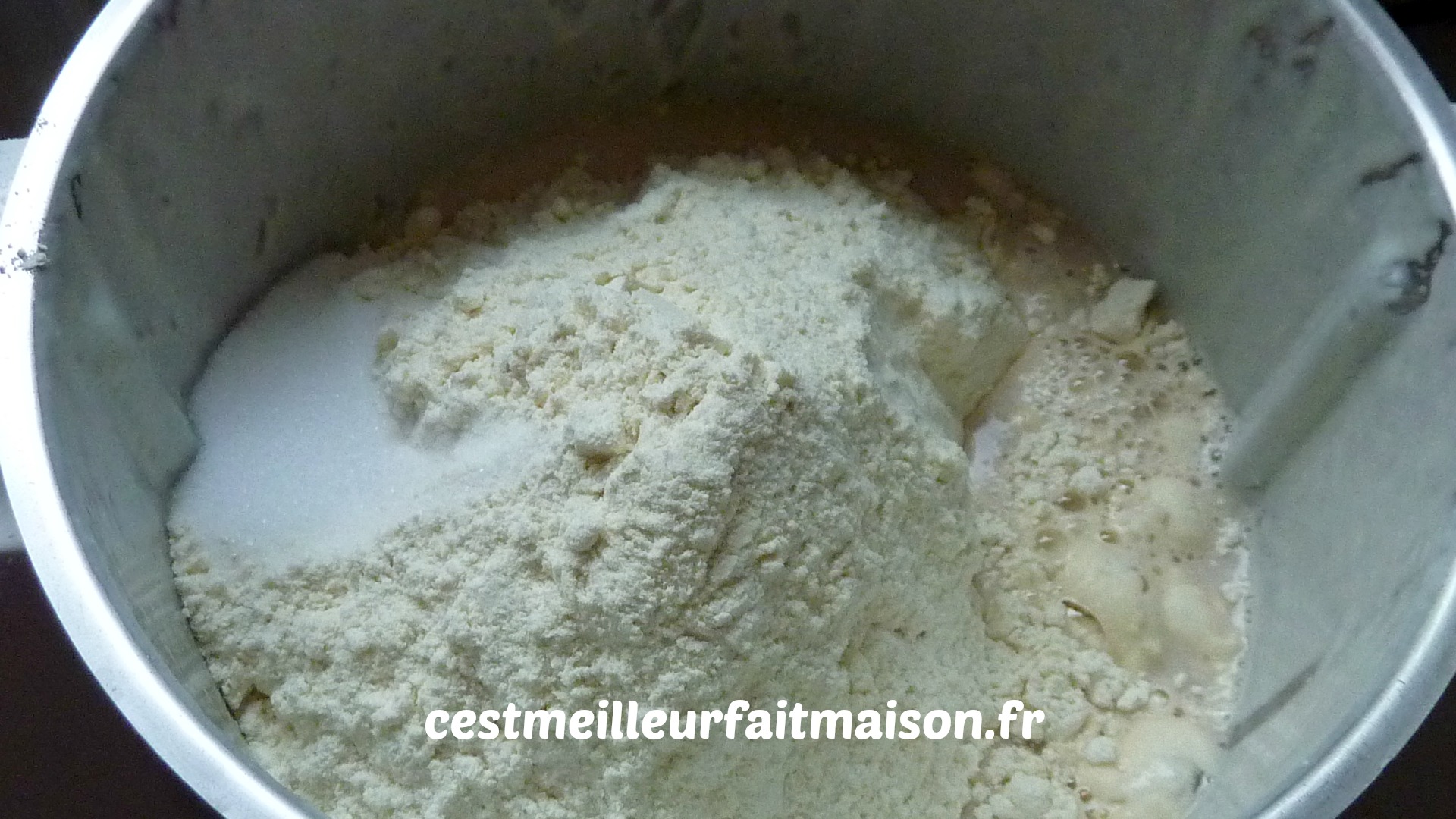 4- Verser la levure diluée dans l’eau, la farine et le sel. Pétrir 3 min.
