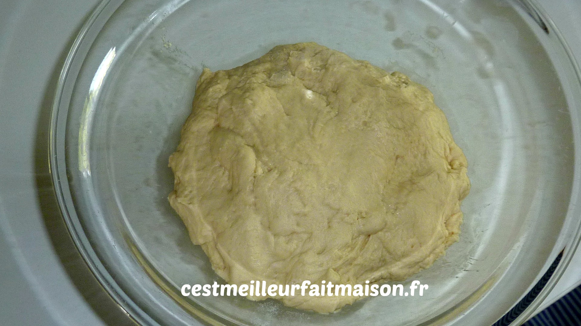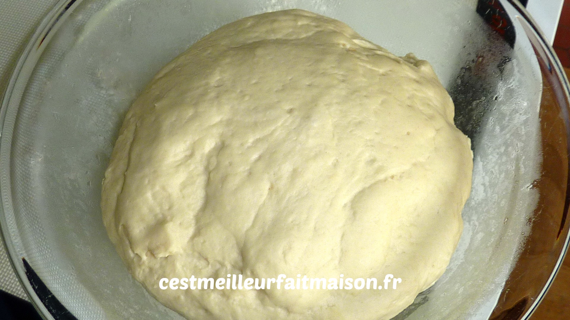 5- Débarrasser la pâte dans un saladier et laisser pousser 2 heures à température ambiante. Recouvrir le saladier d’un film alimentaire. La pâte va doubler de volume.