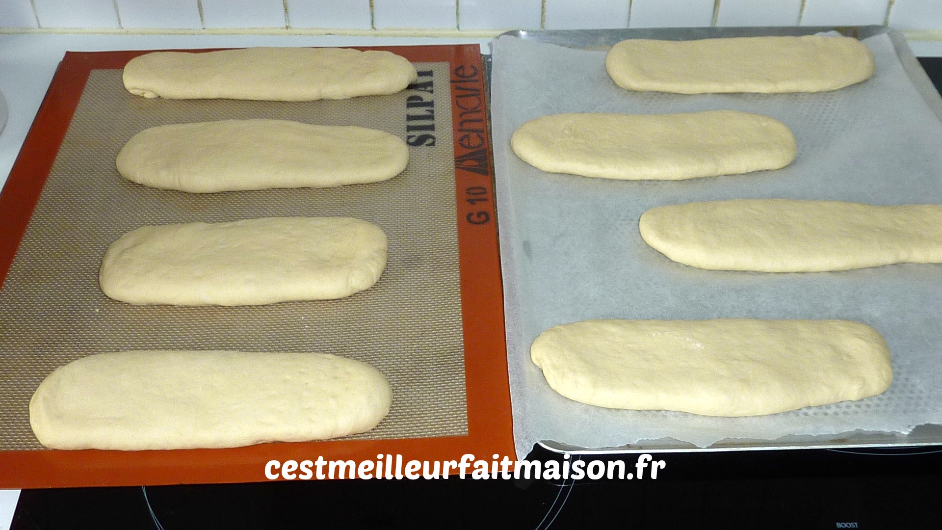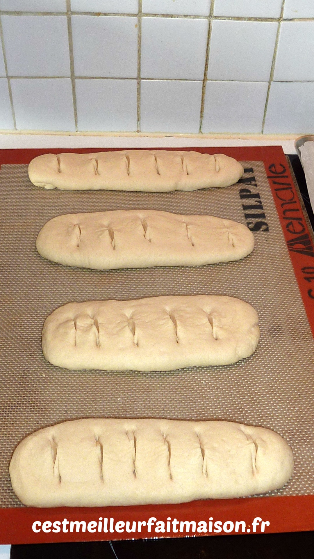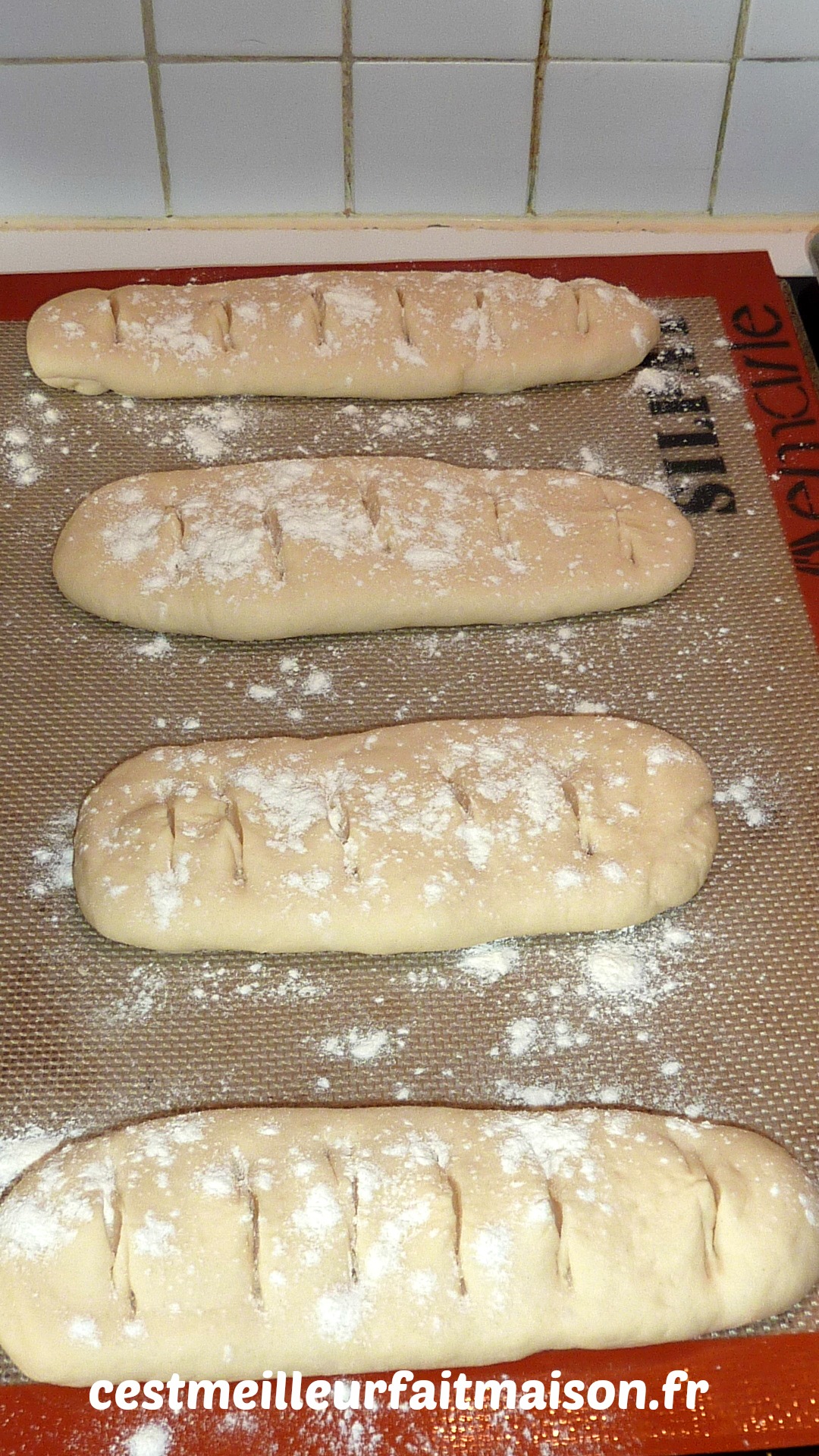 6- A la fin de la pousse, fariner un plan de travail et dégazer la pâte. Former les pains selon la forme choisie, les entailler avec des ciseaux, les fariner et les laisser lever sur une plaque recouverte de papier cuisson, sur une toile Silpat ou sur une empreinte Silpain de Guy Demarle pendant environ 1h.