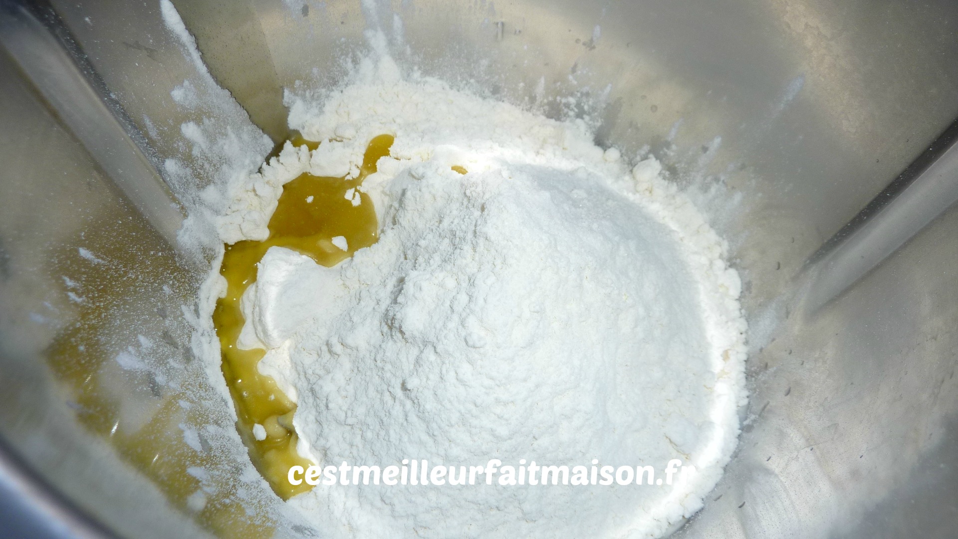 2- Ajouter la farine, l’huile et le sel. Pétrir 1 min.