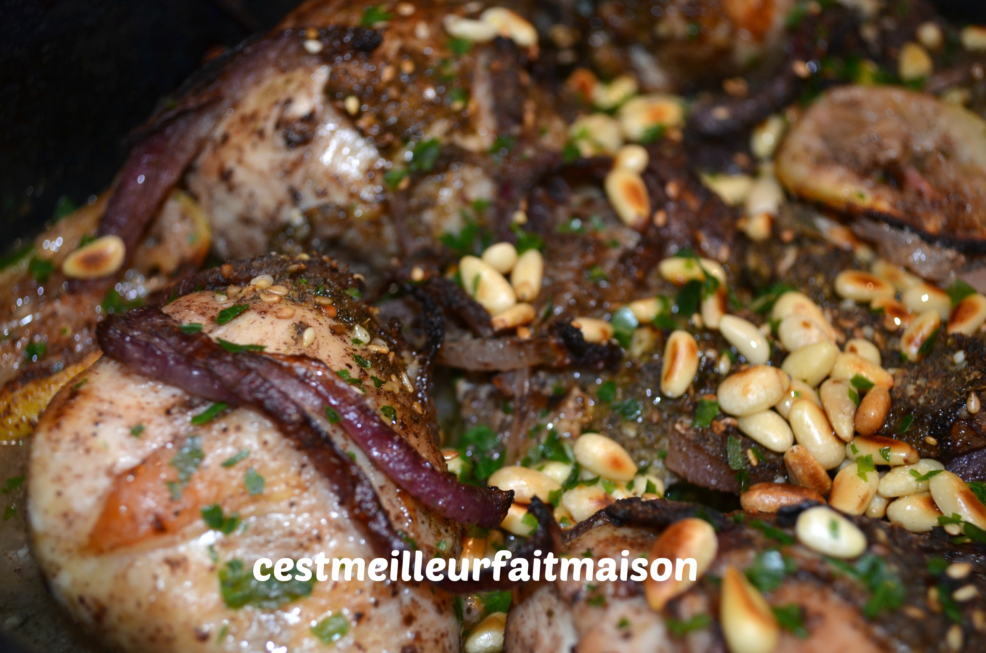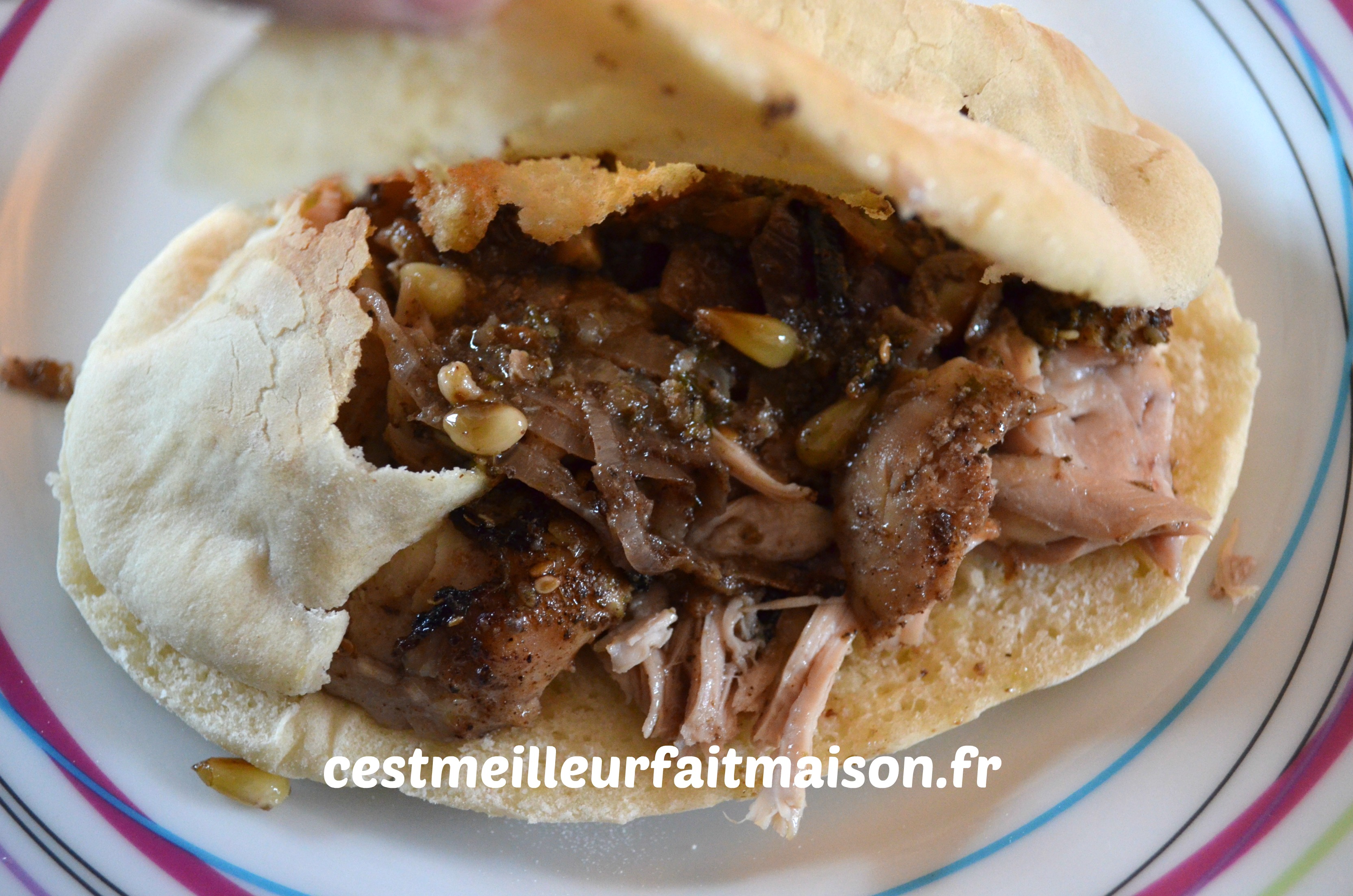 4- A la fin de la cuisson, ajouter les pignons de pin et parsemer de persil. Servir à l’assiette ou dans des pitas après avoir désossée le poulet.