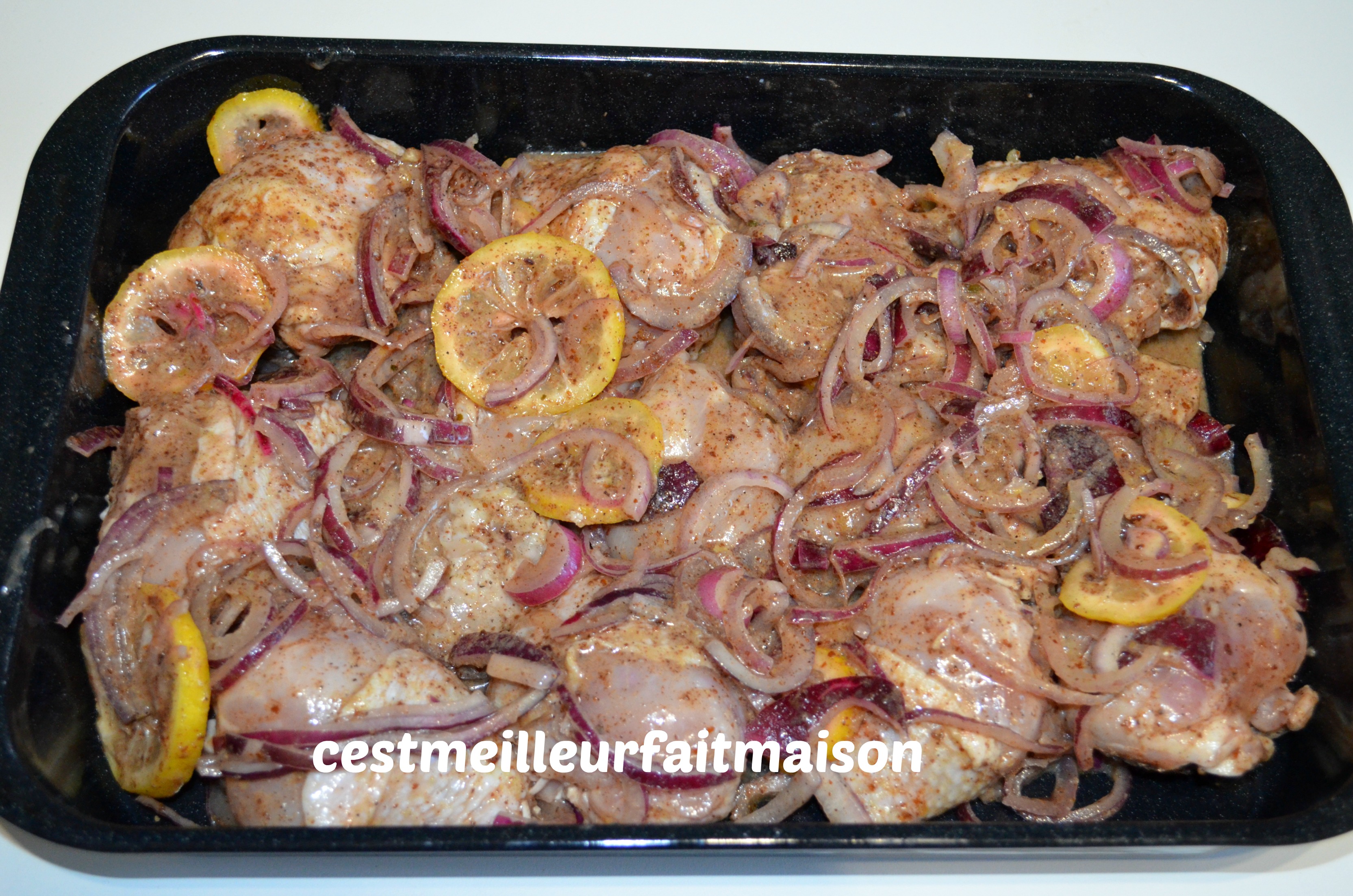 1- Dans un grand saladier, mélanger le poulet avec les oignons, l’ail, l’huile d’olive, les épices, le citron, le bouillon, le sel et poivre. Laisser mariner toute la nuit au réfrigérateur.