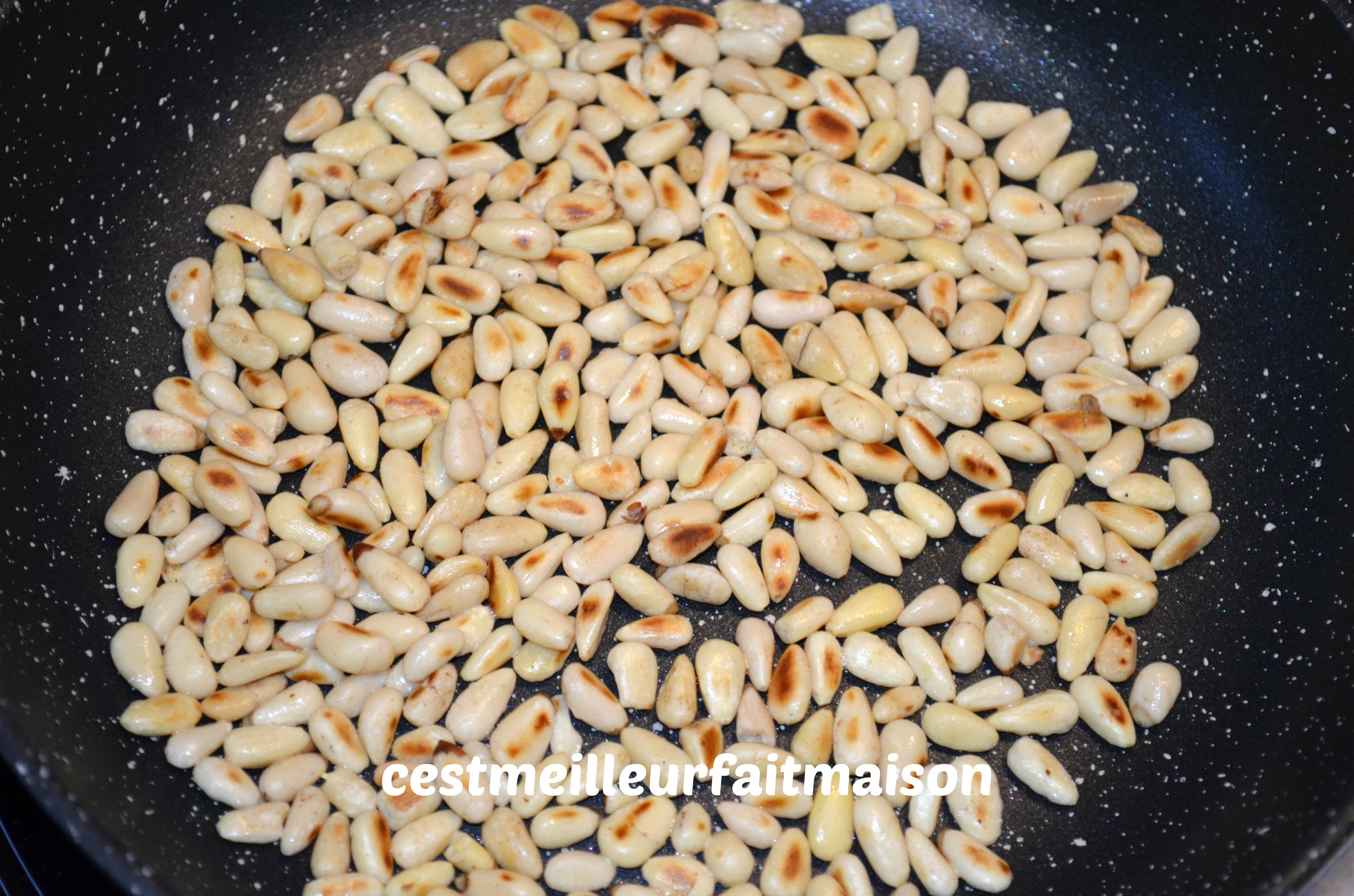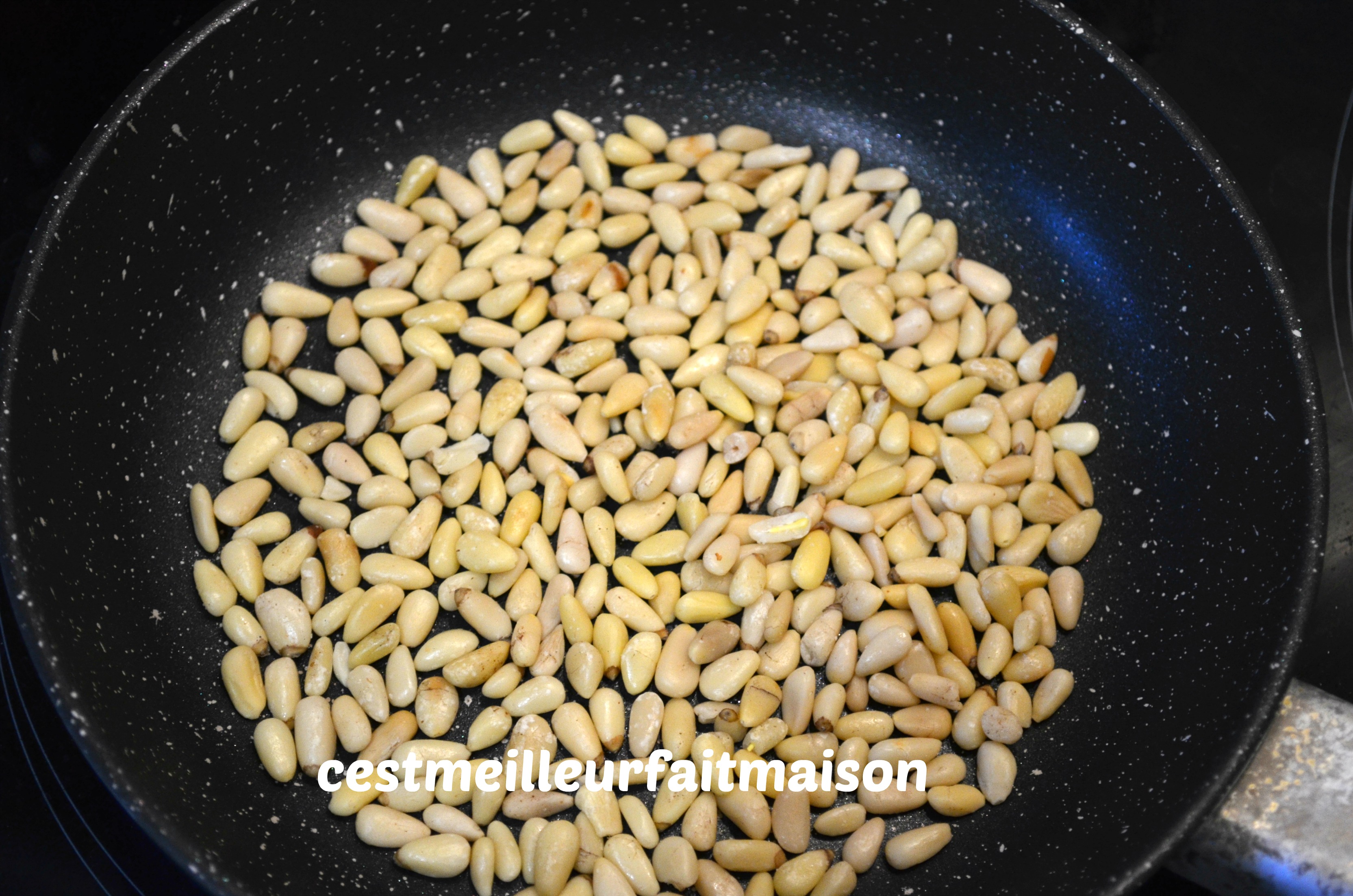 3- Pendant la cuisson, faire dorer les pignons de pin. J’ai choisi de les dorer dans une poêle à sec. Dans le livre, il faut le faire avec 20 g de beurre.