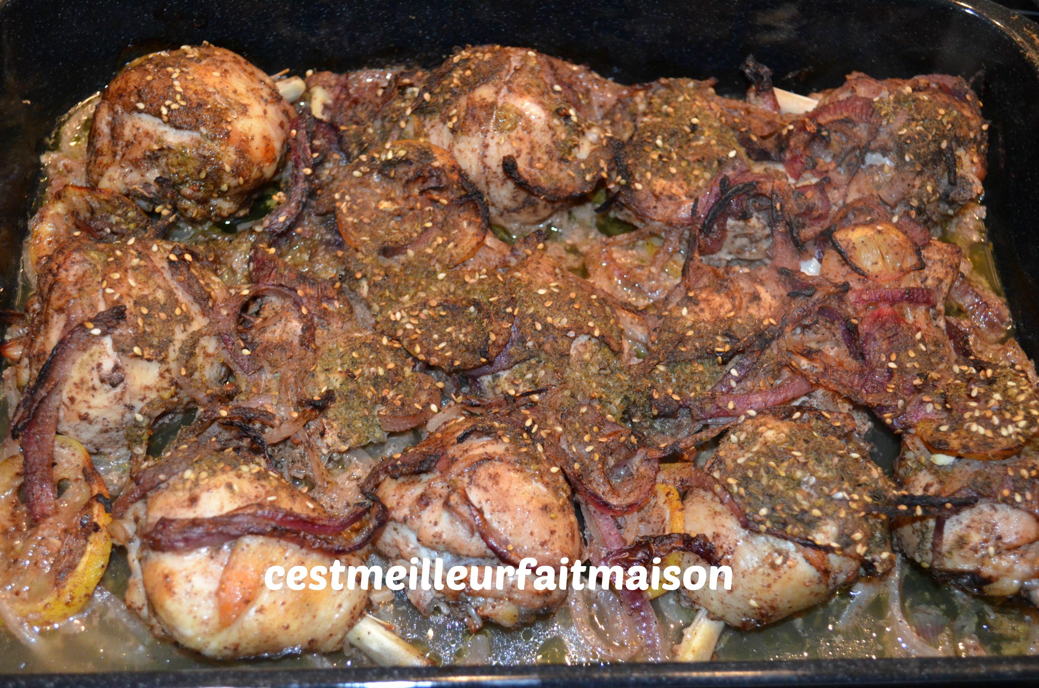 2- Préchauffer le four à 200°C. Mettre le poulet et la marinade dans un plat allant au four. Placer le poulet côté peau vers le haut. Parsemez de zaatar et enfourner pour 30 à 40 min.