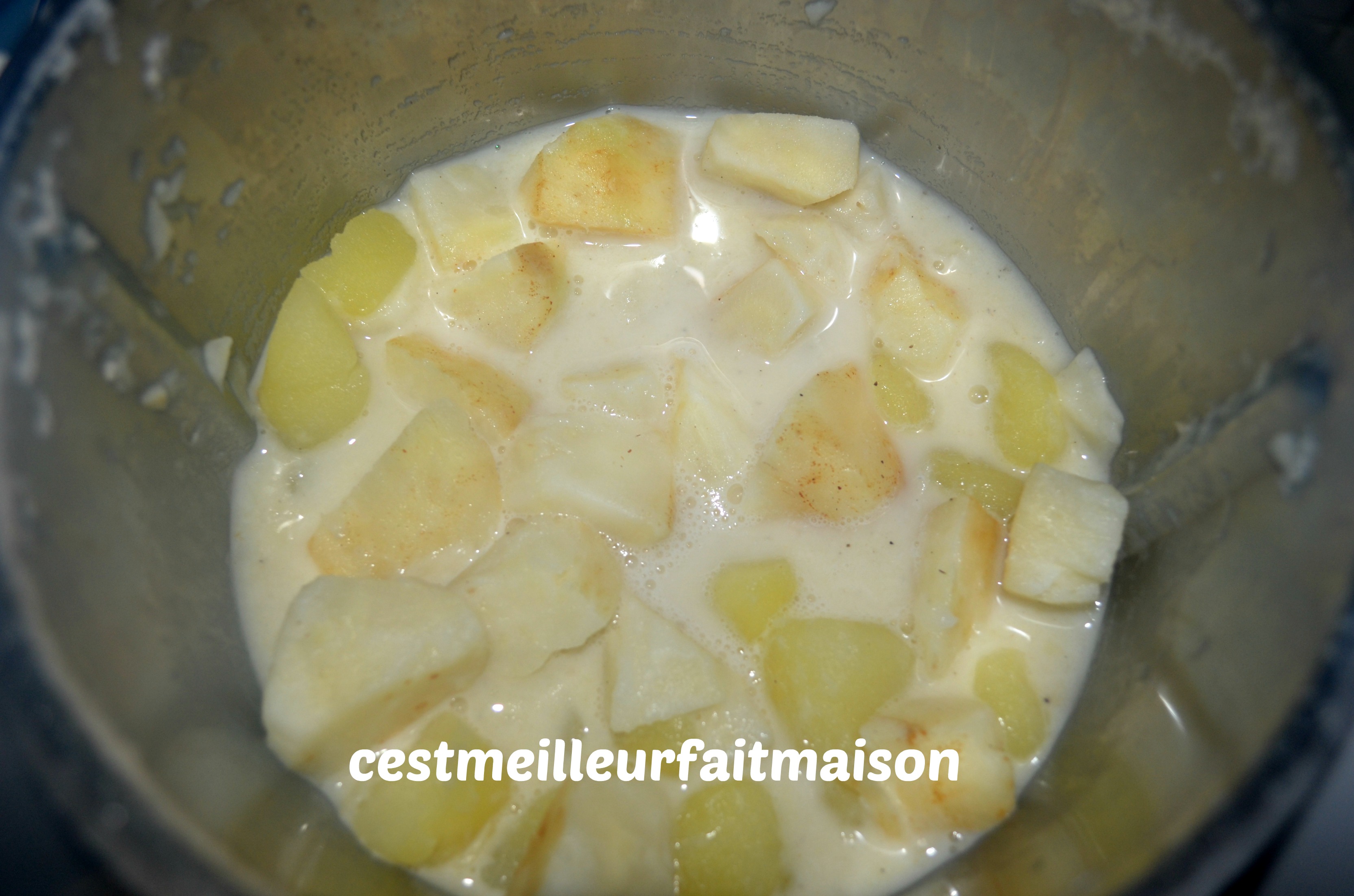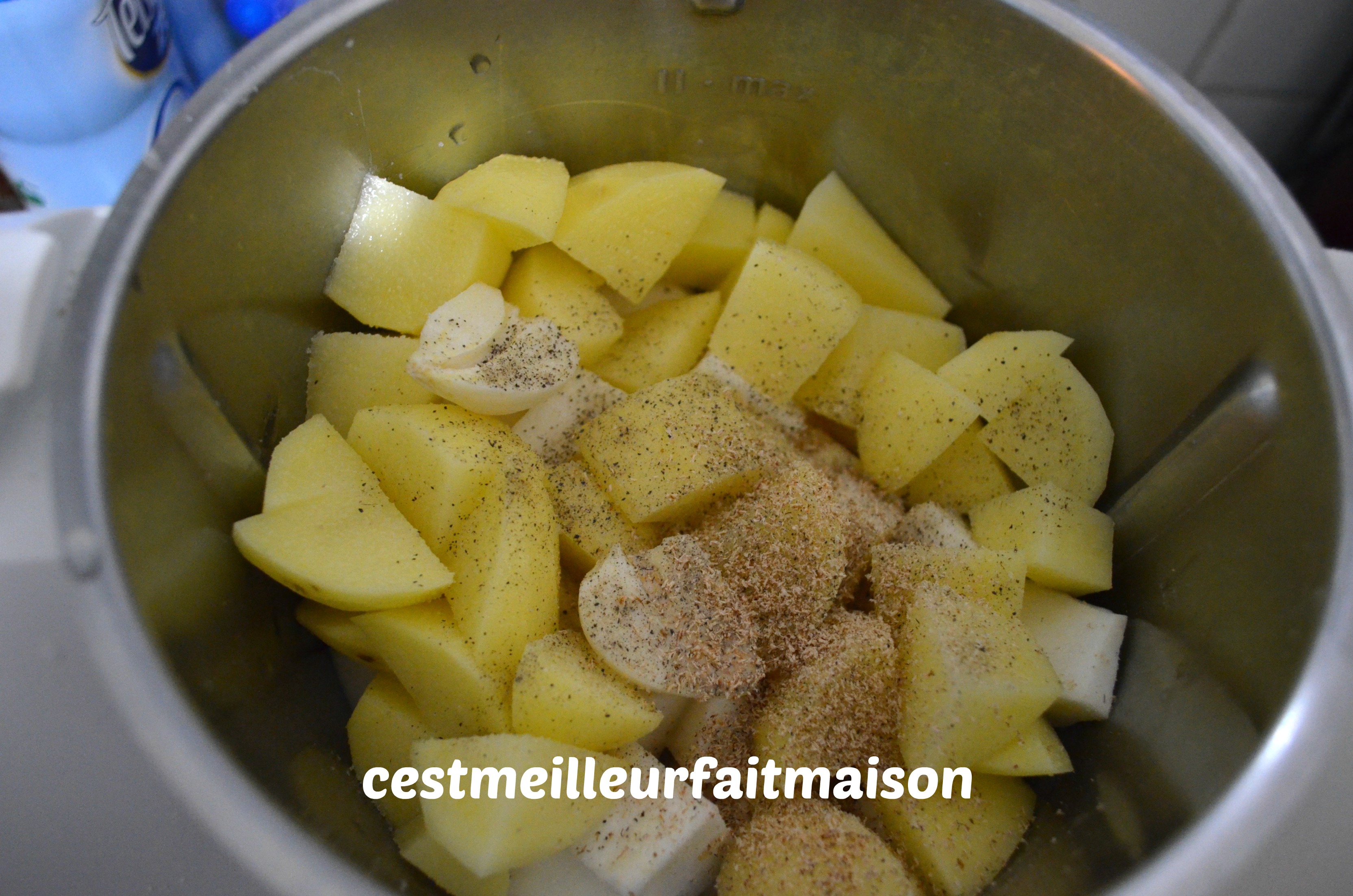 1- Couper en morceaux le céleri et les pommes de terre. Les mettre dans le bol du Thermomix. Ajouter l’ail, le lait, le sel, le poivre et de la noix de muscade râpée. Programmer 20 min/90°C/Vit 3.