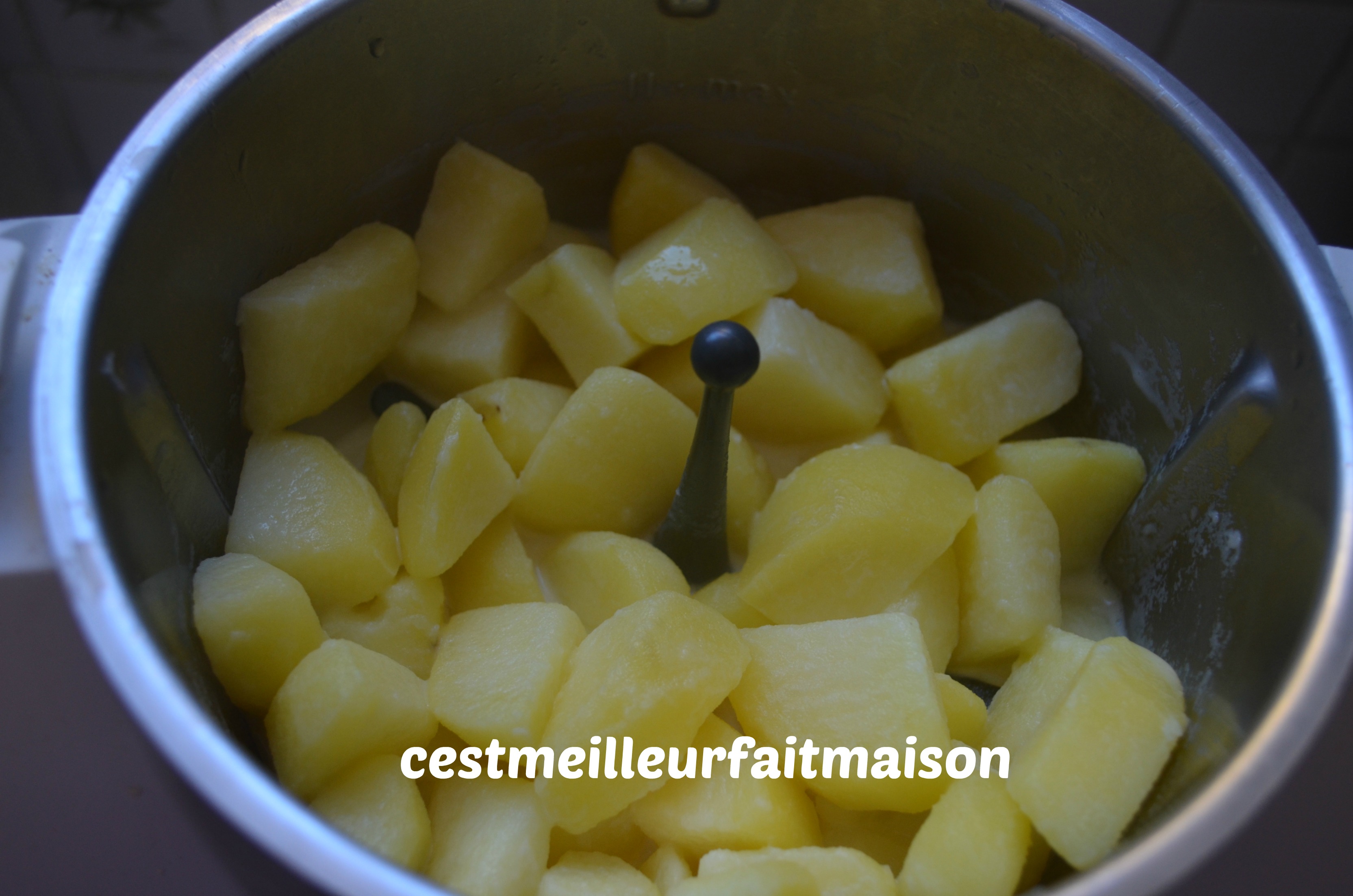1- Éplucher les pommes de terre et les laver. Mettre le fouet dans le bol du Thermomix. Couper les pommes de terre en morceaux et les mettre dans le bol. Ajouter le lait et le sel. Programmer 24 min/ 100°C/ Vit cuillère/ Sens Inverse.