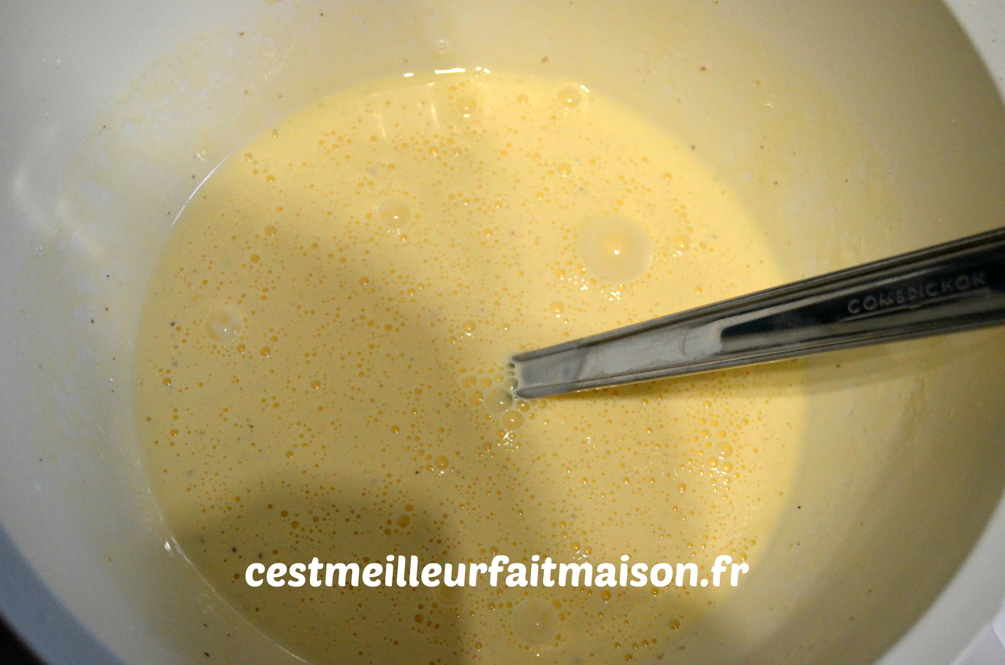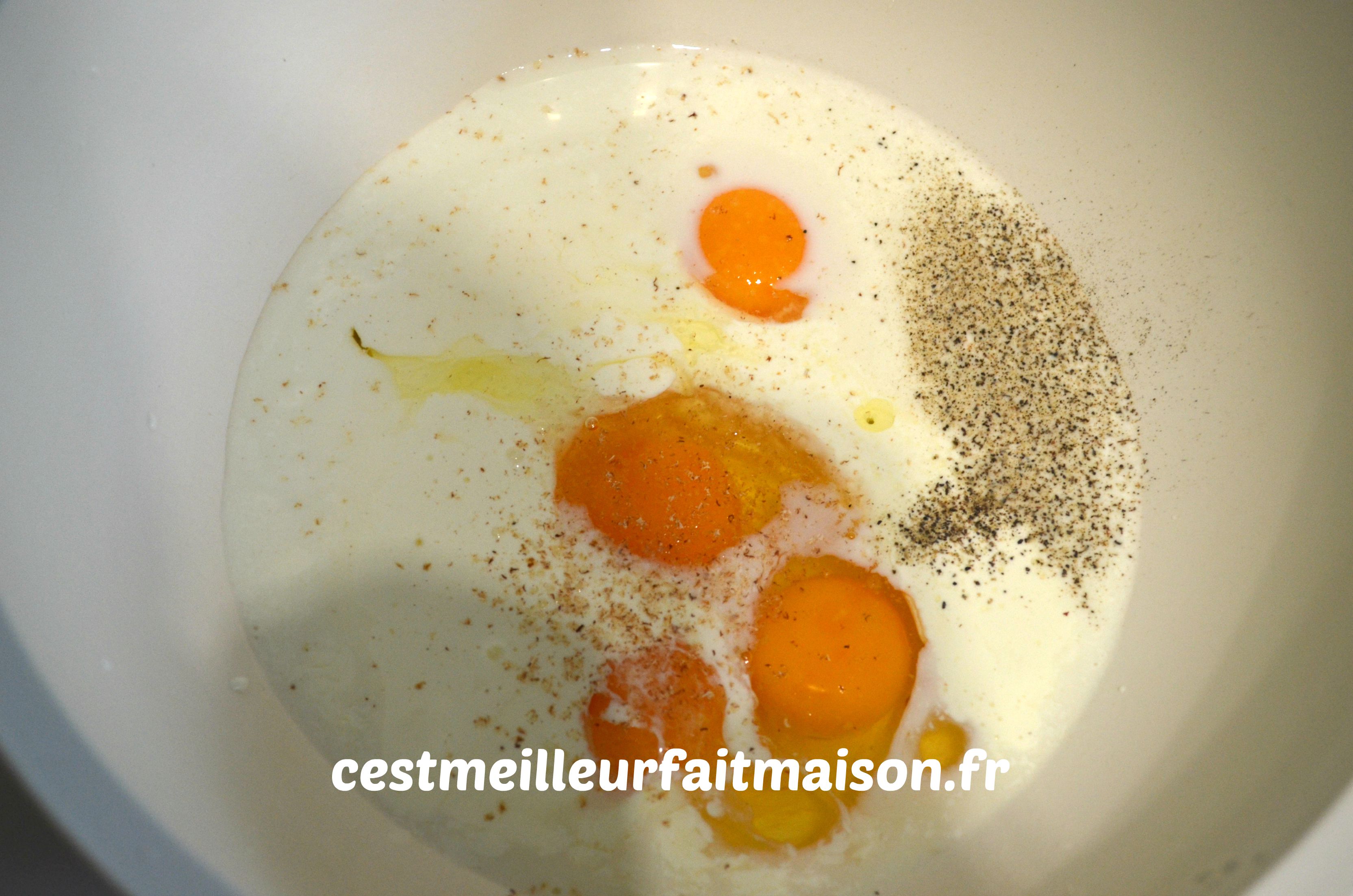 1- Dans un saladier, battre les œufs, les jaunes, la crème, le lait, la noix de muscade, le sel et le poivre.