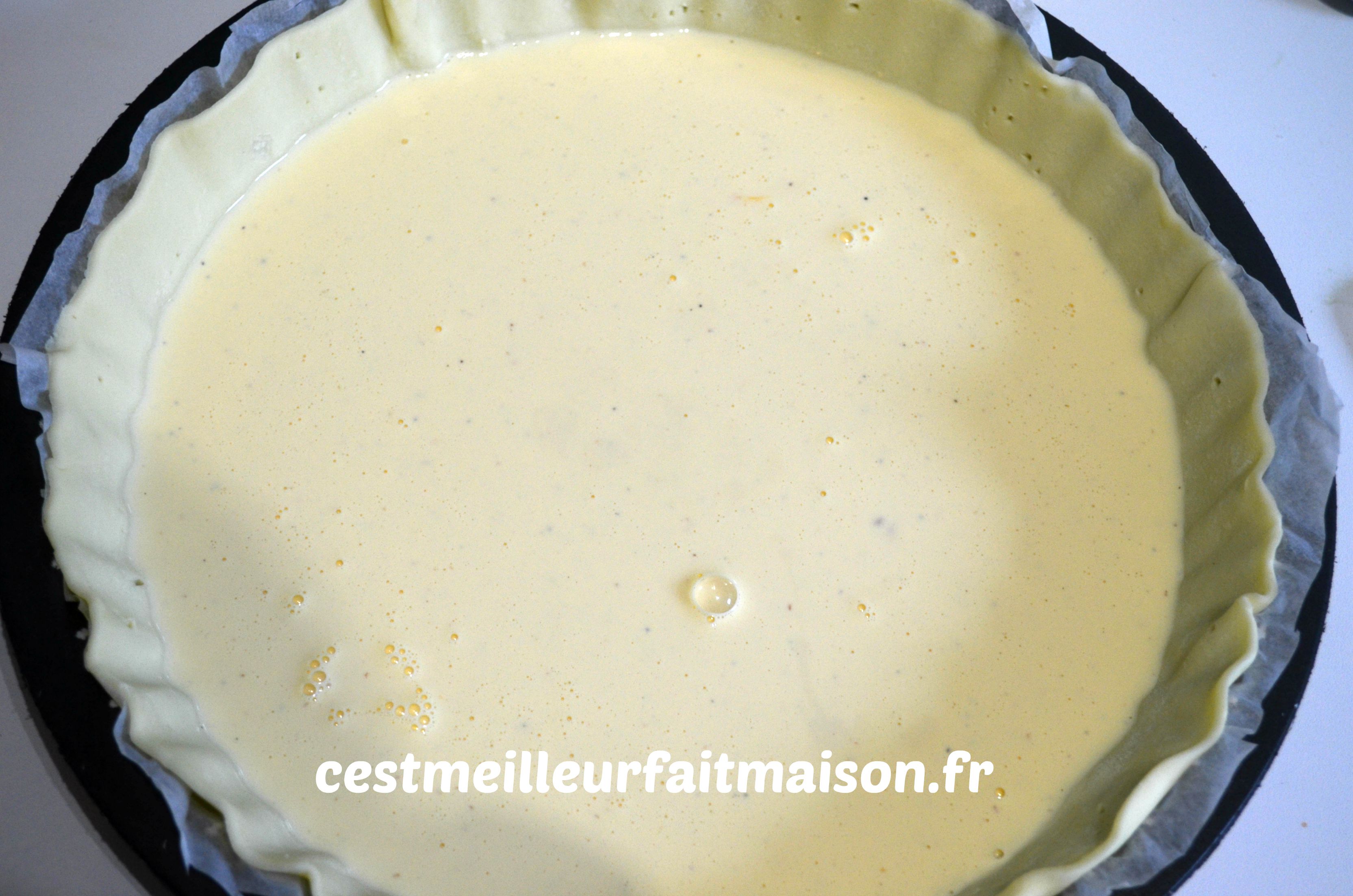 2- Foncer un moule à tarte avec la pâte feuilletée. Piquer la pâte et verser la préparation. Réserver au frais.