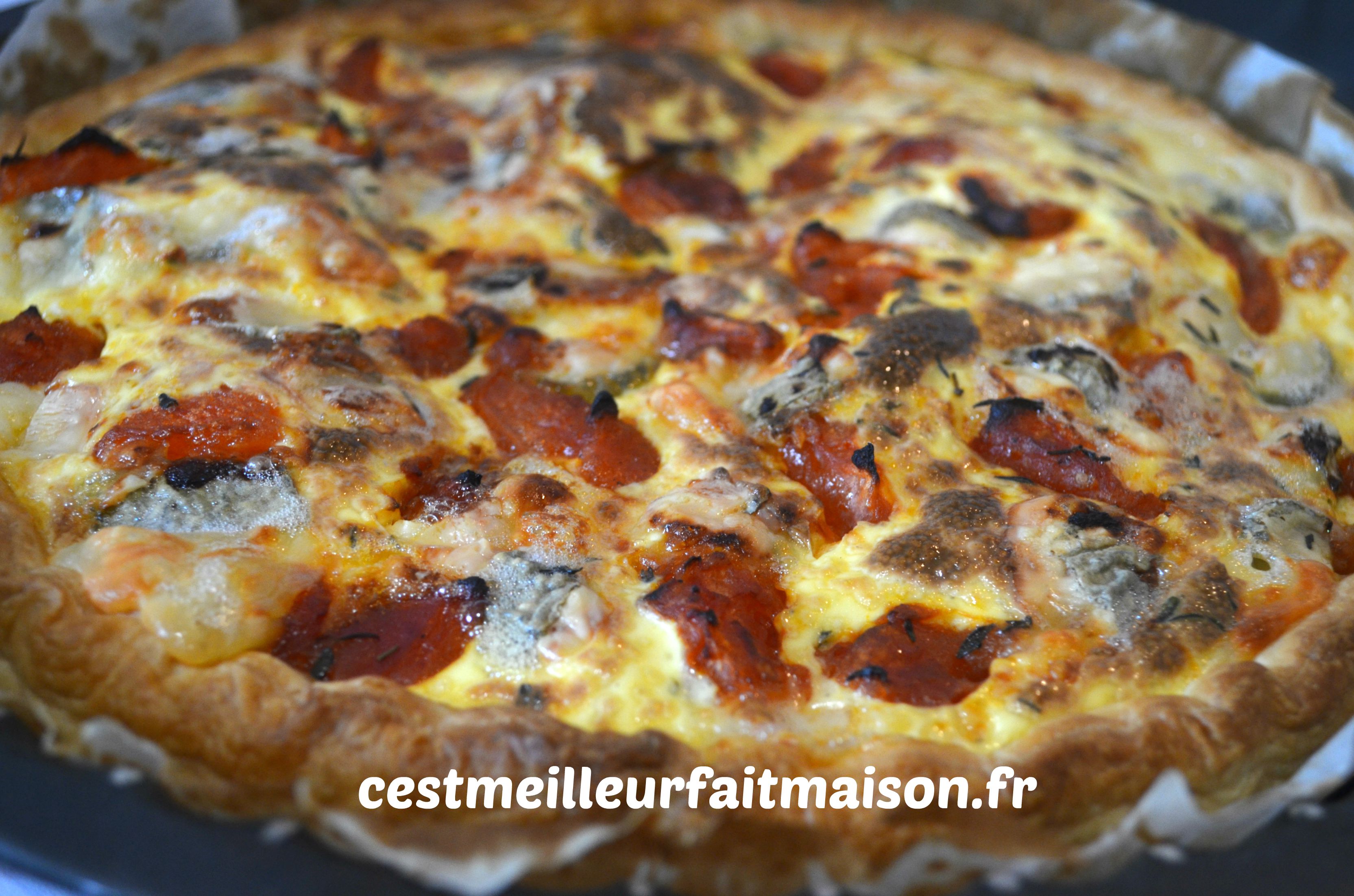 5- Couper le fromage en gros cubes. Mettre les tomates et le fromage dans la quiche et parsemer de thym. Enfourner pour 25 à 30 min.