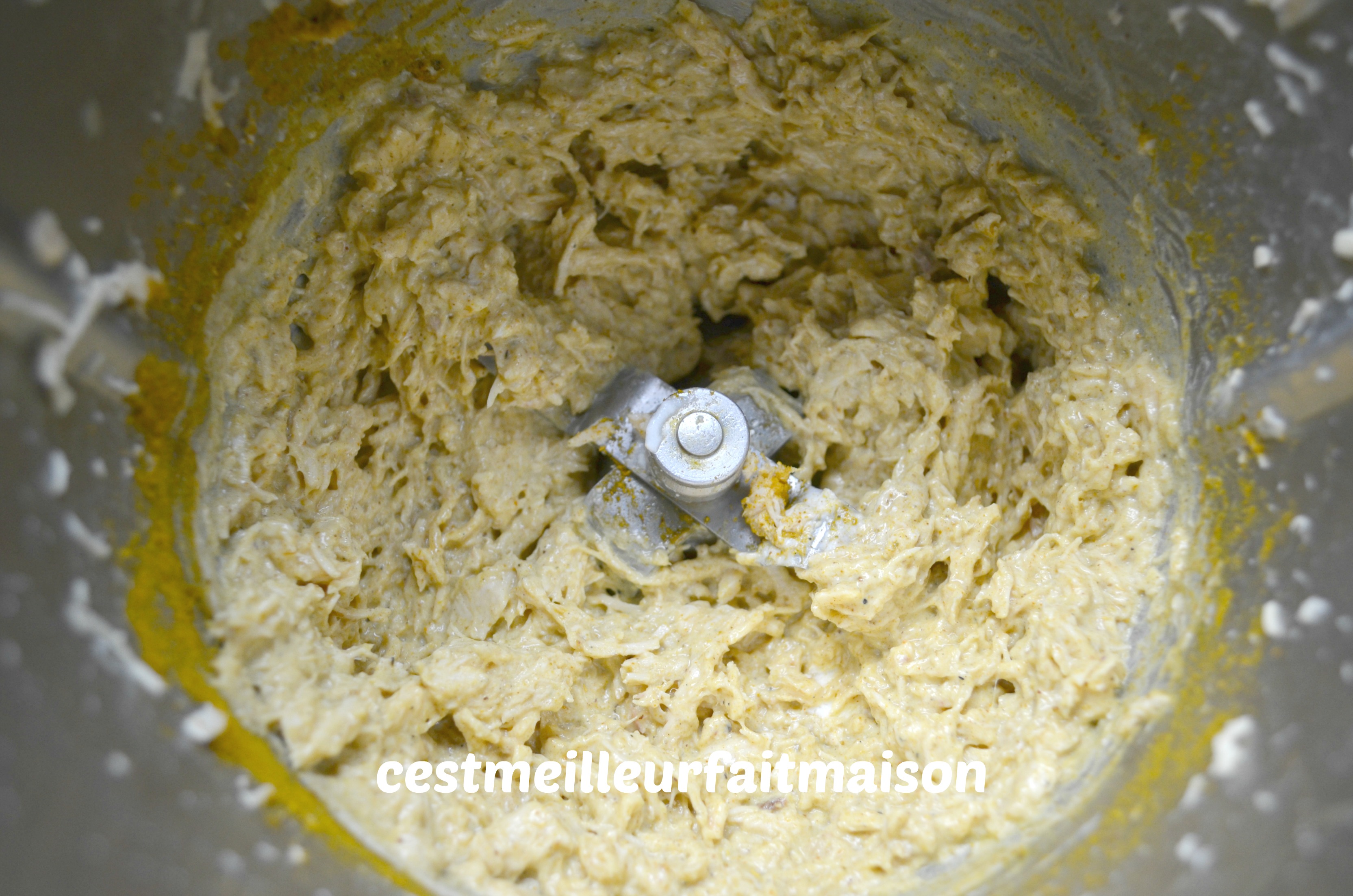 Il me restait deux blancs de poulet trop secs pour être mangé comme ça, alors j’ai eu l’idée de les transformer en rillettes. J’ai trouvé la recette chez PtitChef et c’était parfait. J’ai adapté la recette au Thermomix.