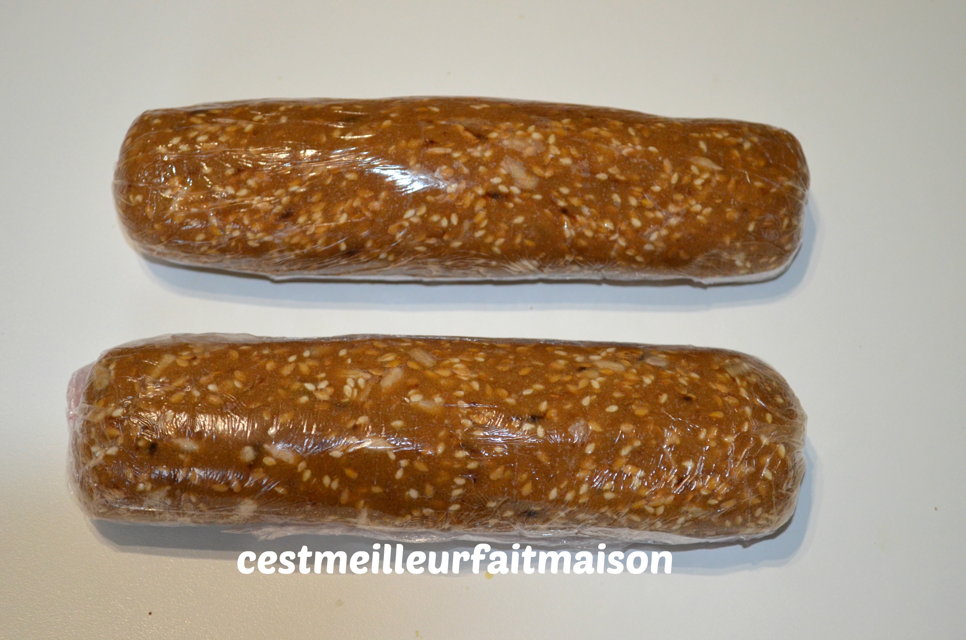 5- A ce moment là, on est sensé étaler la pâte au rouleau pour découper des sablés avec un emporte pièce. J’ai jugé l’opération impossible car la pâte est trop molle et collante. J’ai préféré la partager en deux pour en faire deux rouleaux que j’ai filmés et mis au réfrigérateur 30 min ou jusqu’à ce qu’ils soient assez durs pour être découpés en tranche.