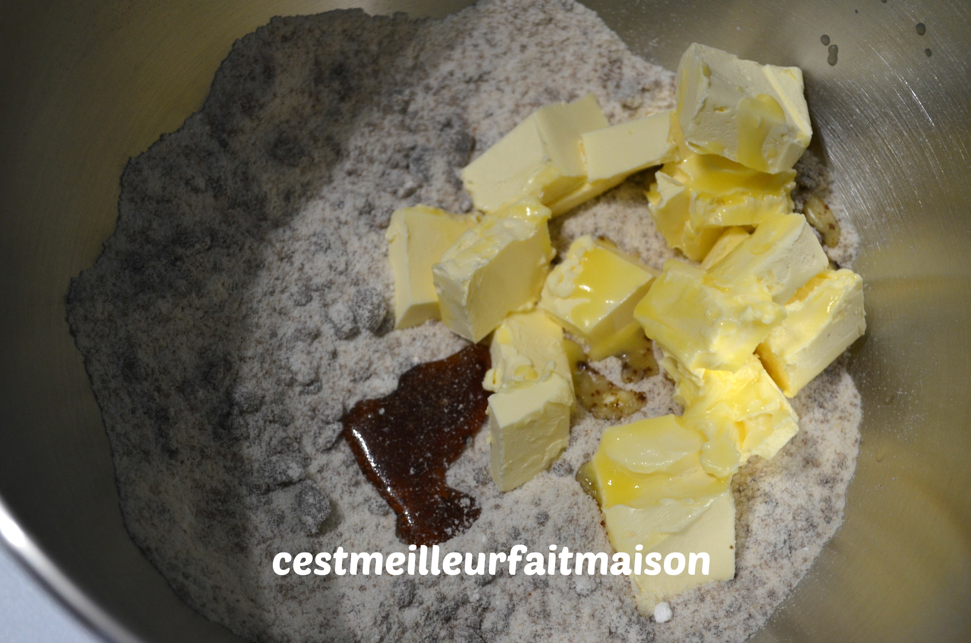 2- Verser la farine dans le bol du robot et ajouter les deux sucres. Mélanger avec la feuille. Le sucre muscovado est humide donc il fait des petites boules. Vous pouvez les écraser un peu en les frottant avec les mains, il va en rester et ce n’est pas grave, ça ne gène pas du tout à la dégustation.