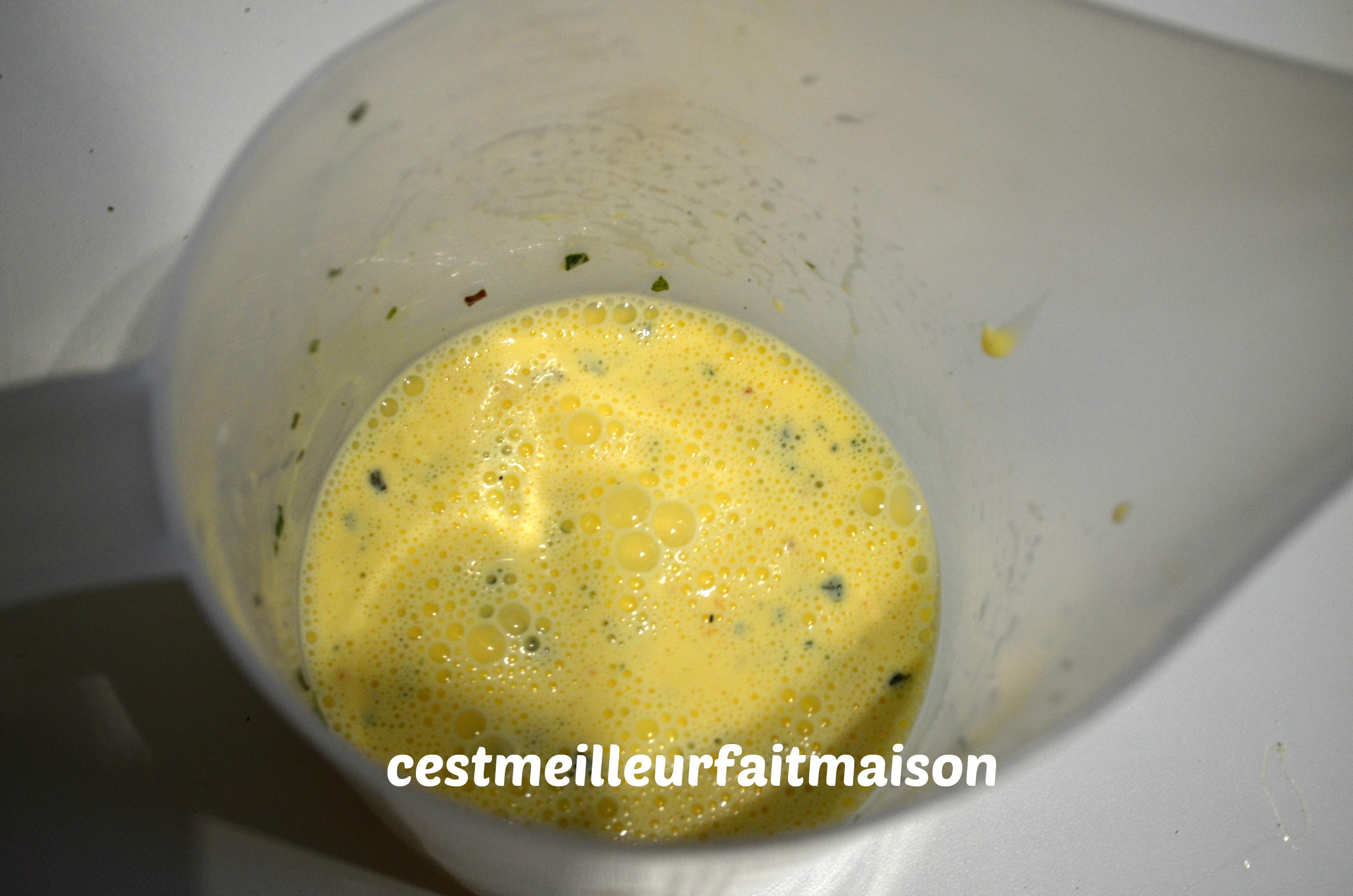 3- Dans le pichet Guy Demarle battre les œufs avec la crème. Ajouter le sel, le poivre, de la noix de muscade et la menthe hachée. A l’aide du bec verseur, verser la préparation dans les barquettes.