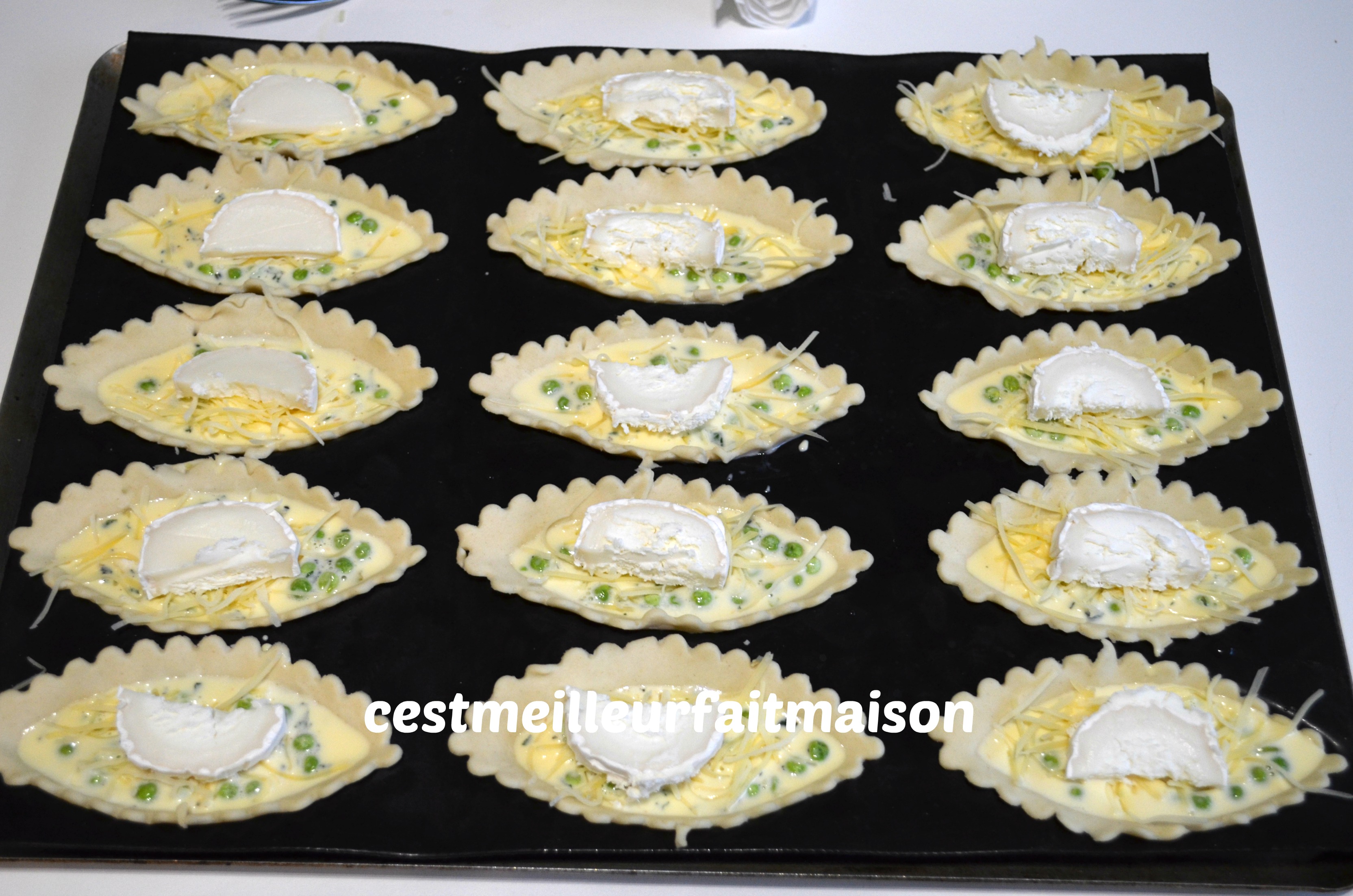 4- Parsemer de comté râpé. Couper la bûche de chèvre en tranche, puis en demi tranches et en déposer deux sur chaque barquette. Sur la photo, il n’y a qu’une demi tranche car j’avais suivi la recette initiale mais depuis, je mets deux demi tranches par barquette. C’est meilleur, on retrouve plus le goût du fromage.