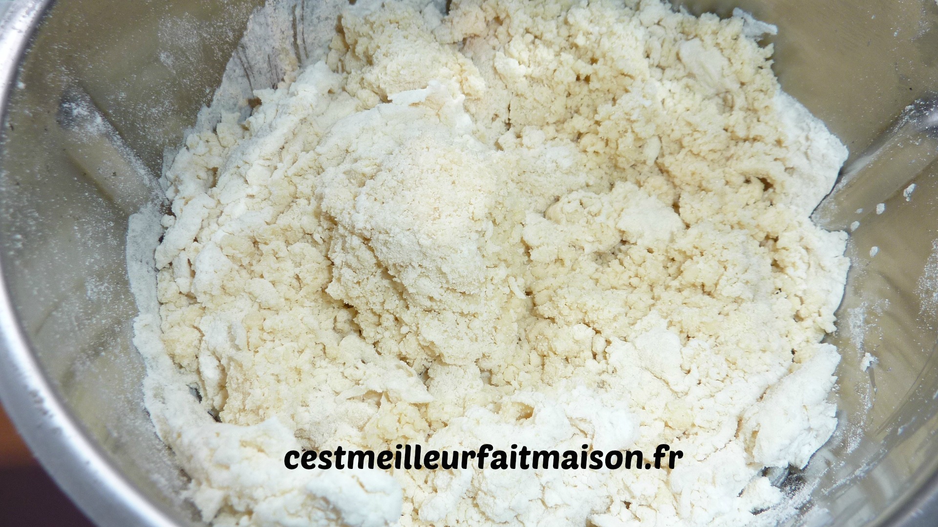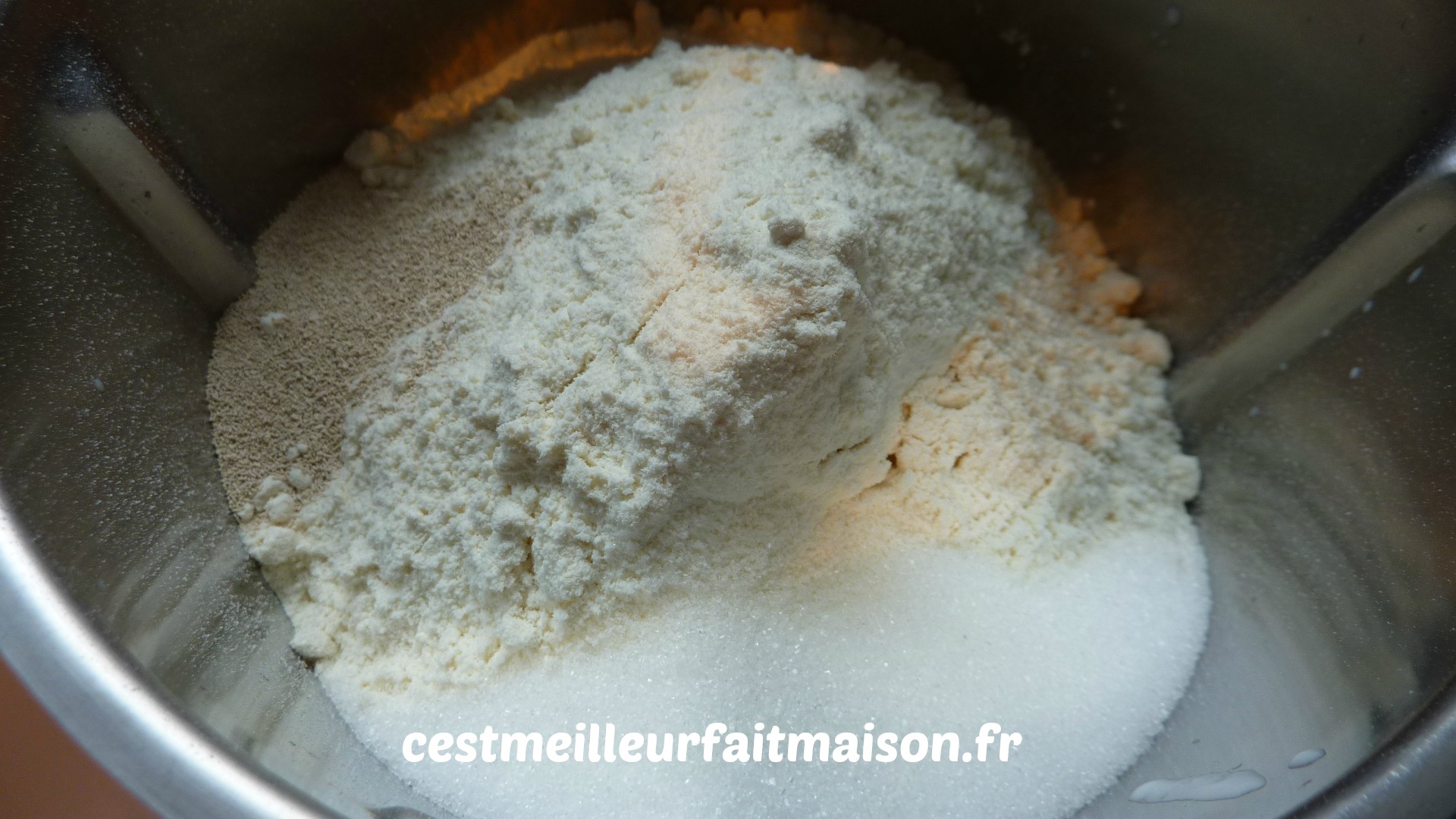 2- Ajouter la farine, le sucre, la levure et le sel. Mixer 50 sec/Vit 4 en aidant avec la spatule.