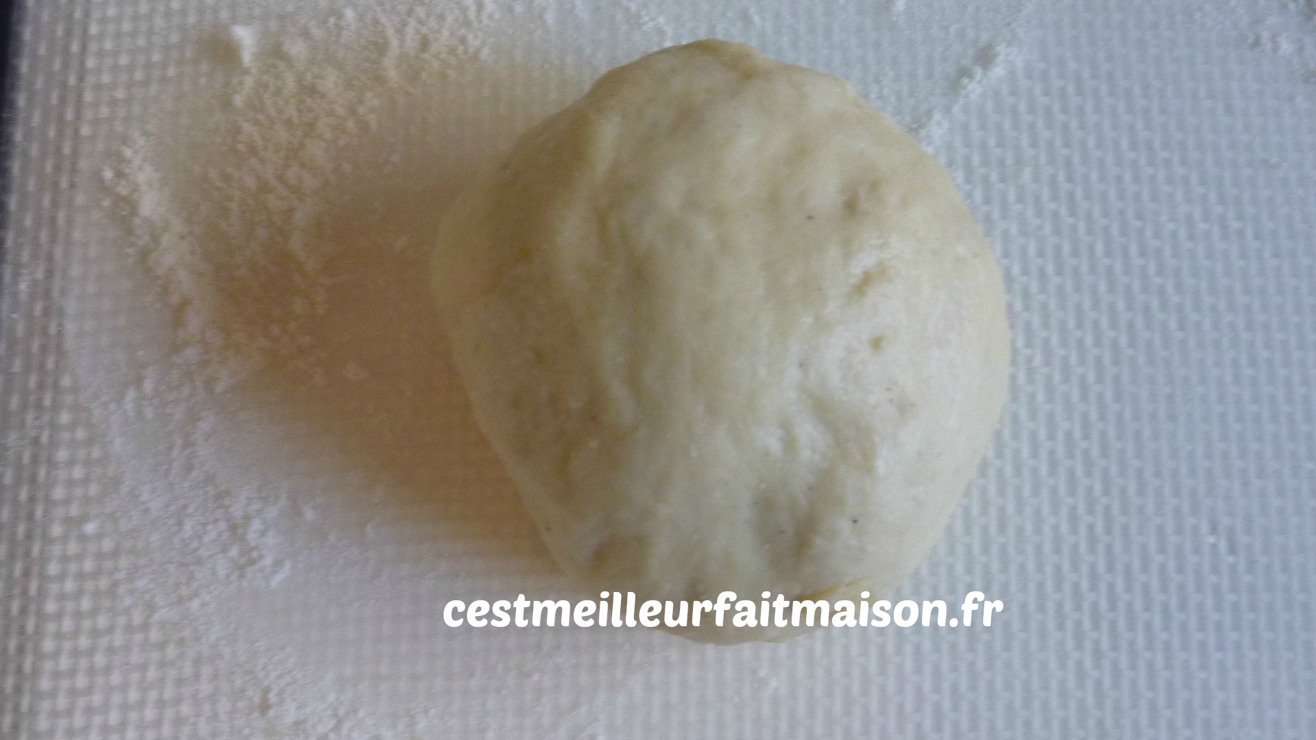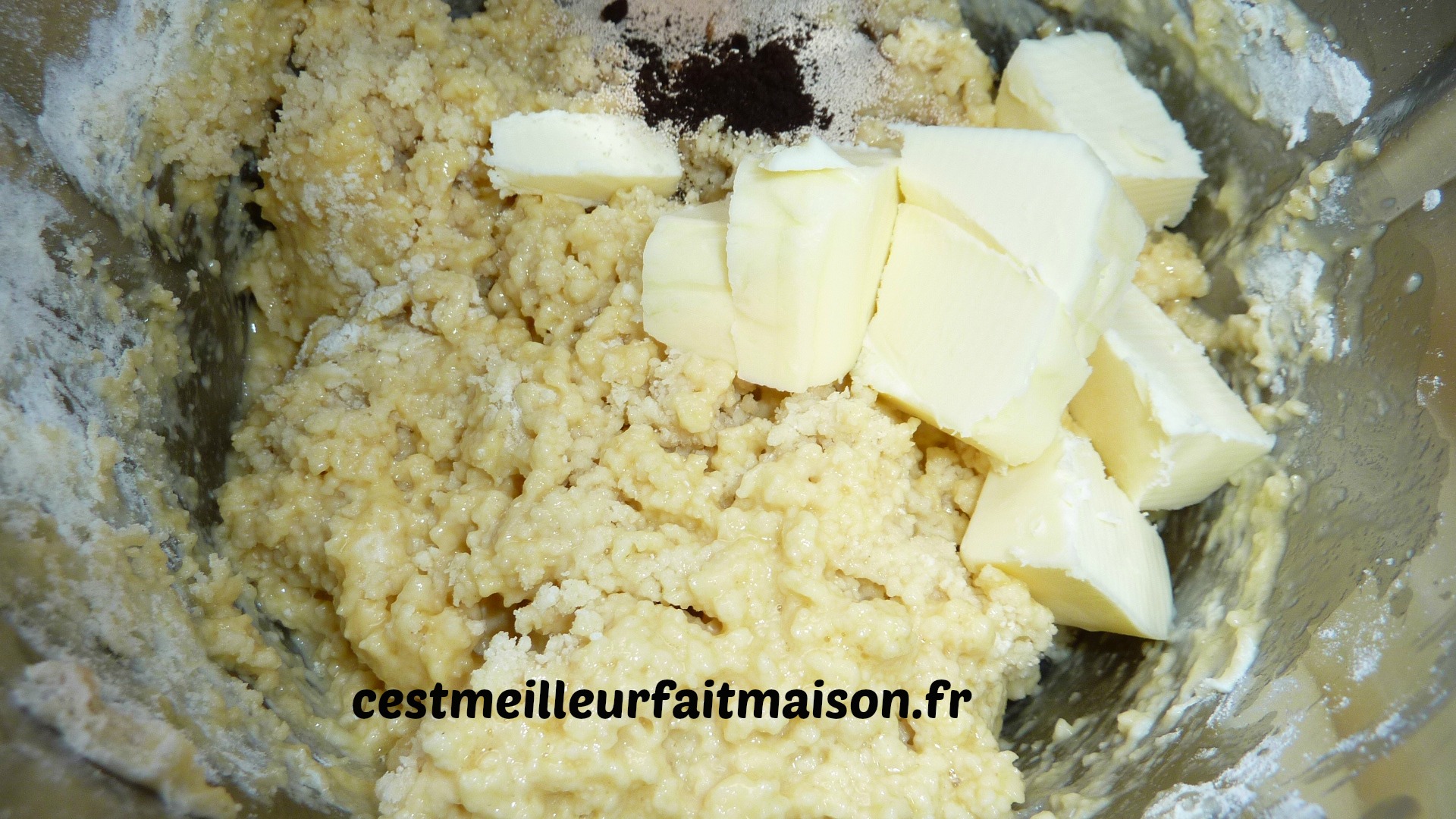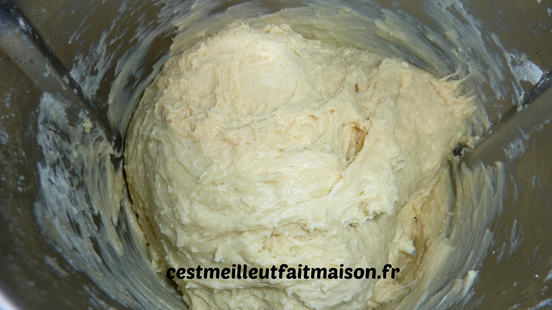 4- Ajouter le beurre coupé en morceaux et la vanille en poudre. Pétrir 4 min. Mettre en boule et laisser pousser dans un saladier recouvert d’un film.