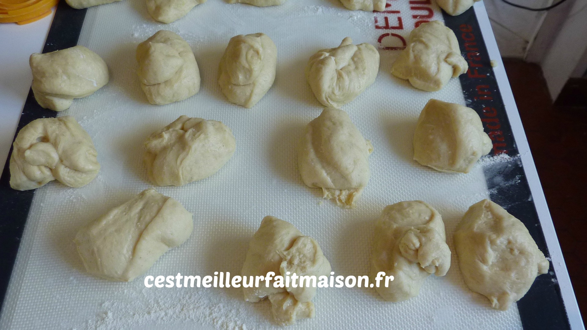 5- Laisser lever pendant au moins 2 heures. Au bout de ce temps, dégazer et diviser la pâte en 24 pâtons d’environ 56/57 g chacun.