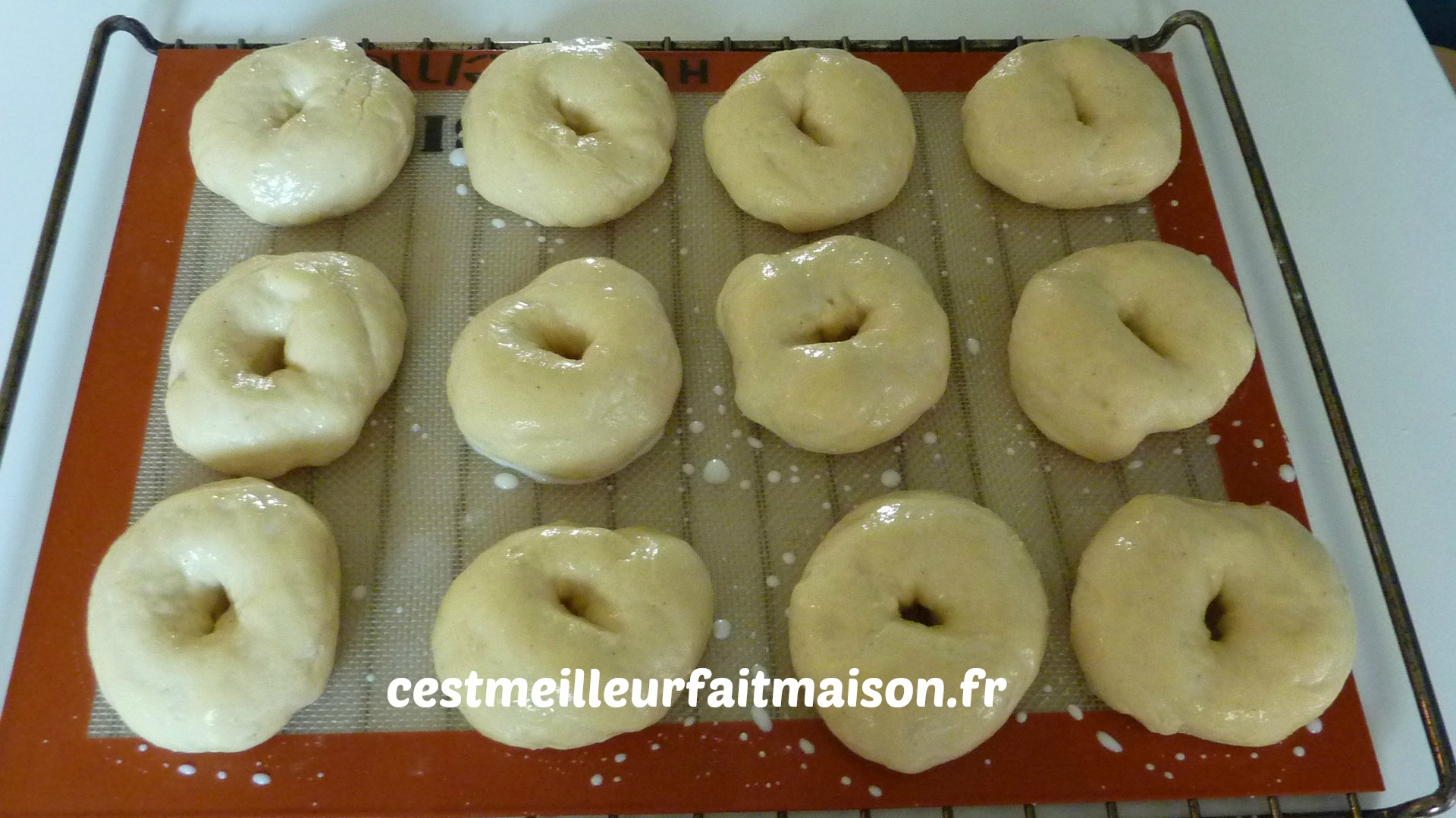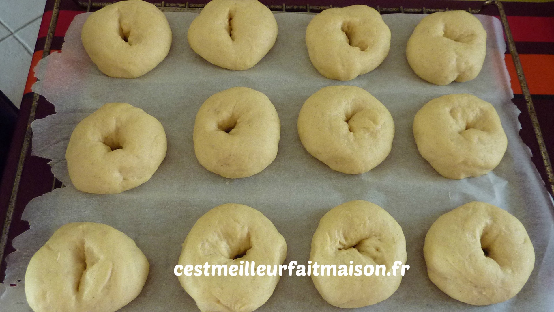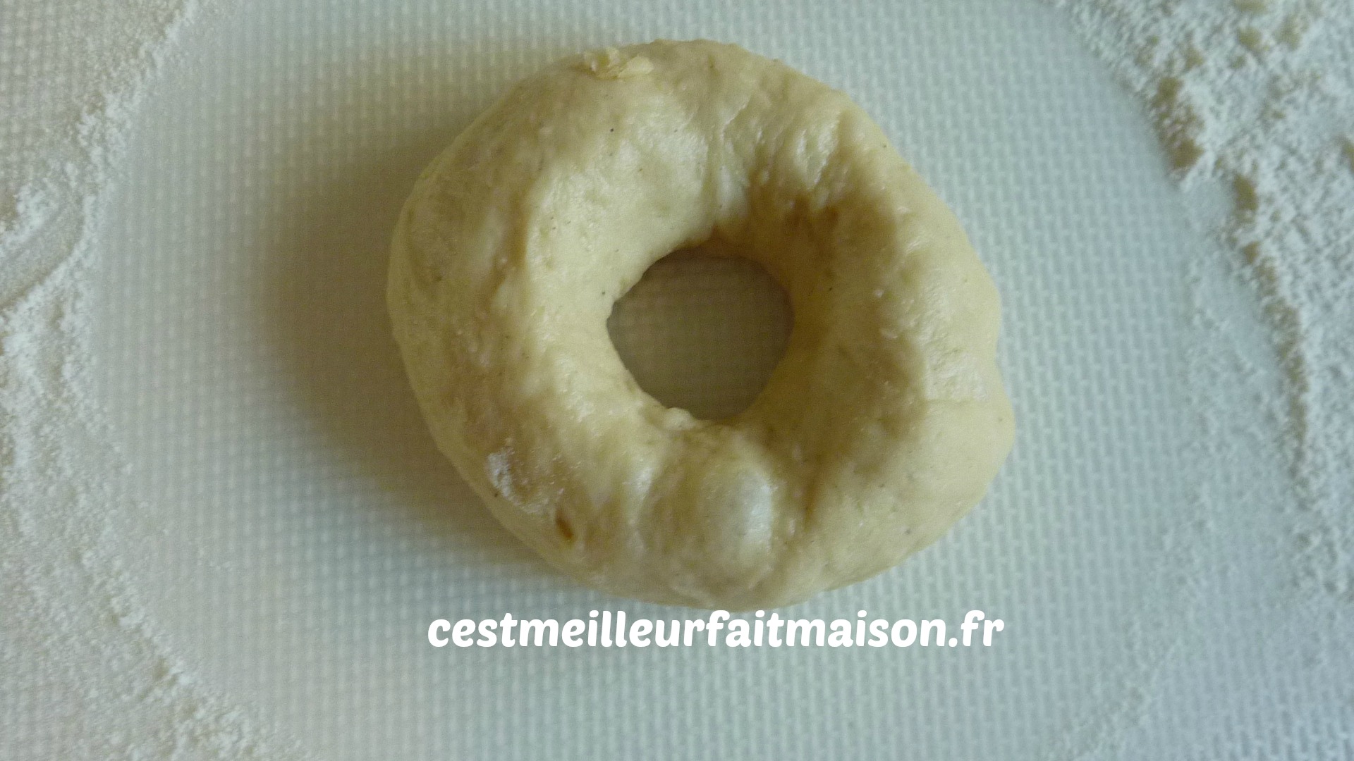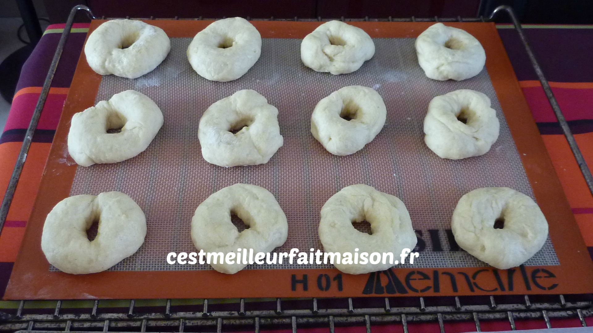 6- Faire une boule avec chaque pâton et faire un trou au milieu. Les poser sur deux plaques et laisser lever environ 45 min. Recouvrir d’un torchon.