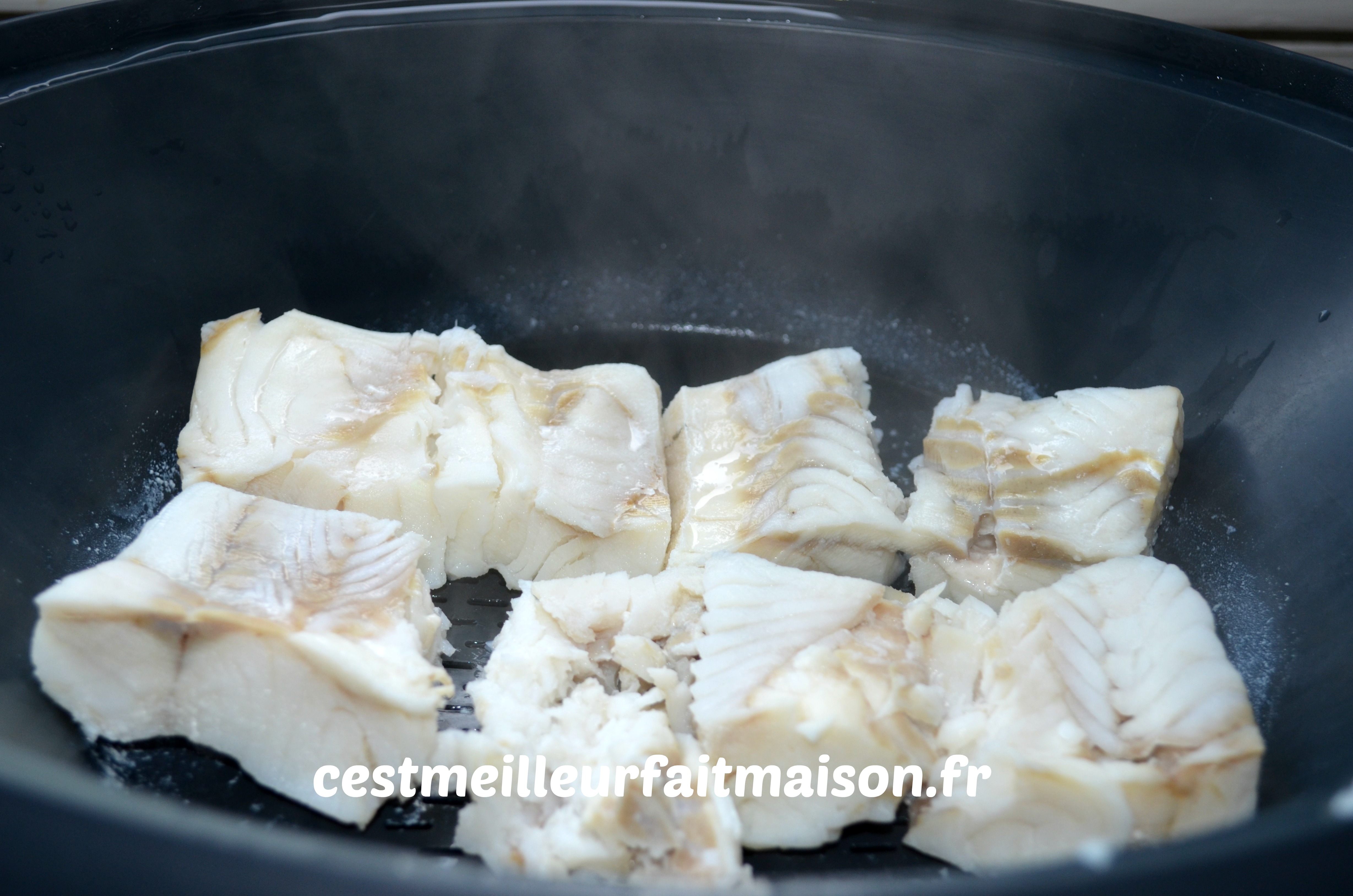 3- Pendant la cuisson du potiron, cuire les filets de cabillaud à la vapeur. J’ai utilisé le Thermomix. J’ai mis de l’eau dans le bol et j’ai programmer 20 min/Varoma/Vit 1. Le temps de cuisson dépend du poisson, le mien était encore congelé.