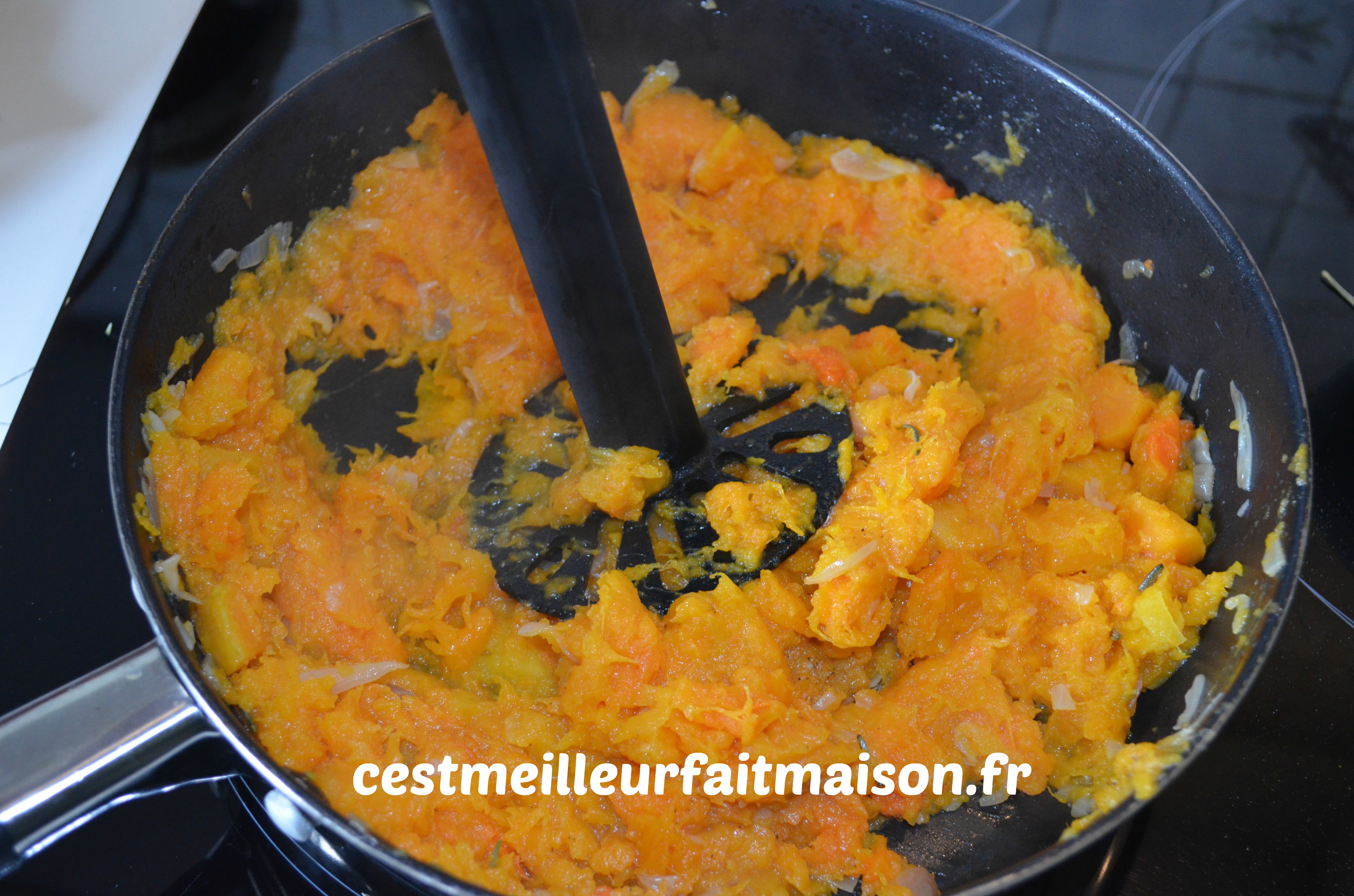 2- Ajouter les cubes de potiron et le romarin. Mélanger et laisser cuire jusqu’à ce que le potiron soit fondant. Remuer de temps en temps.