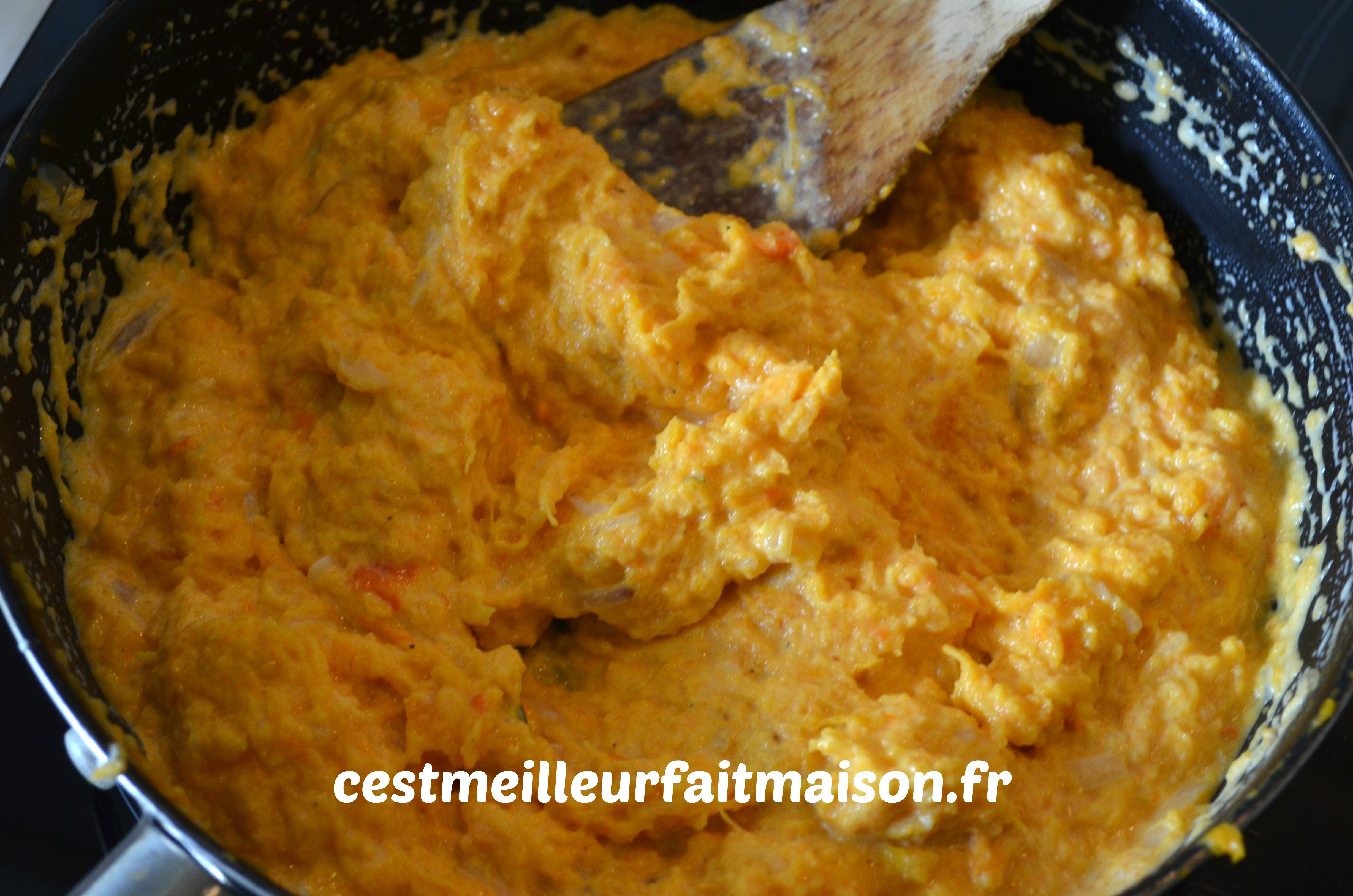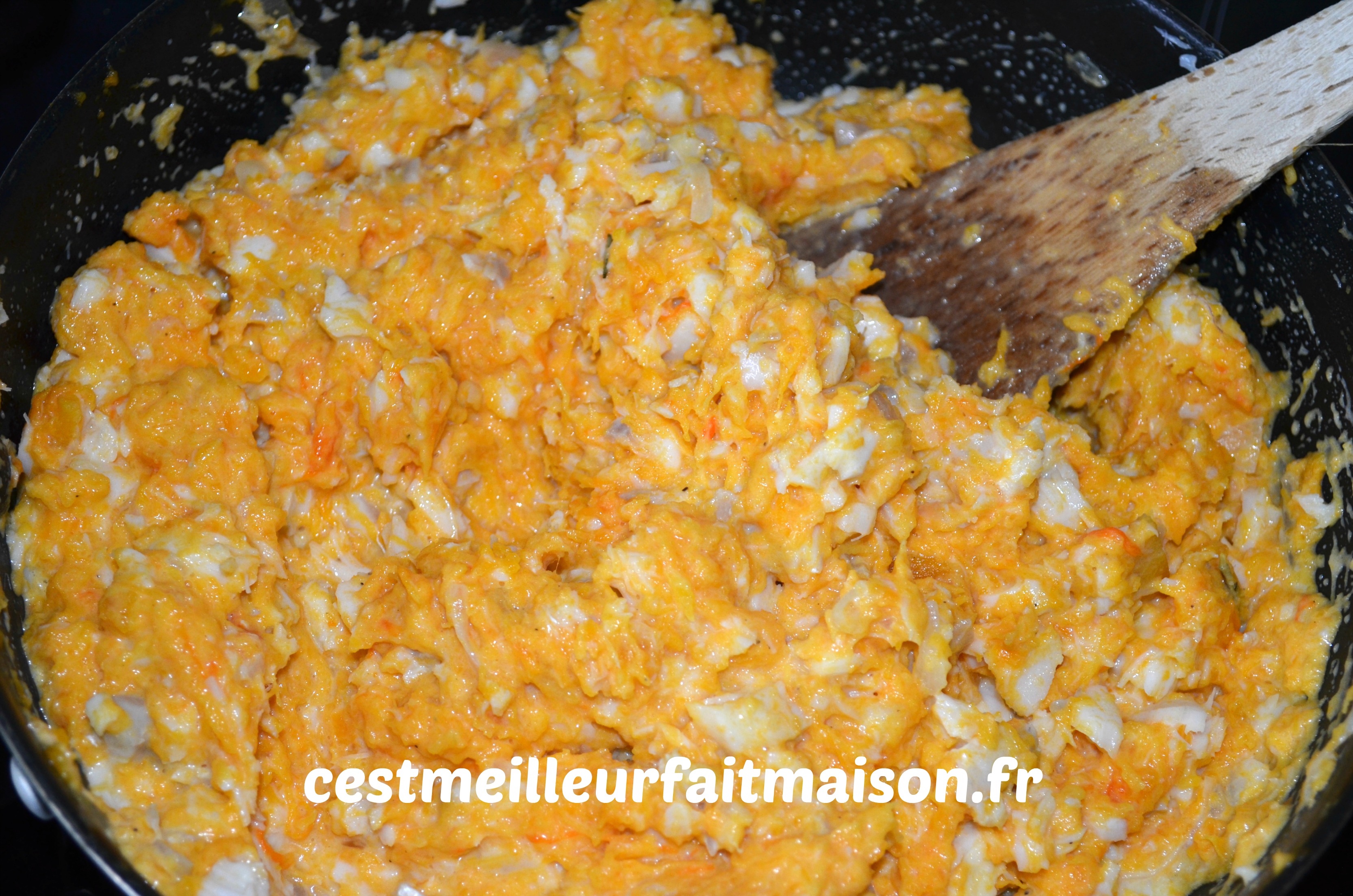7- Mélanger le potiron et le poisson.