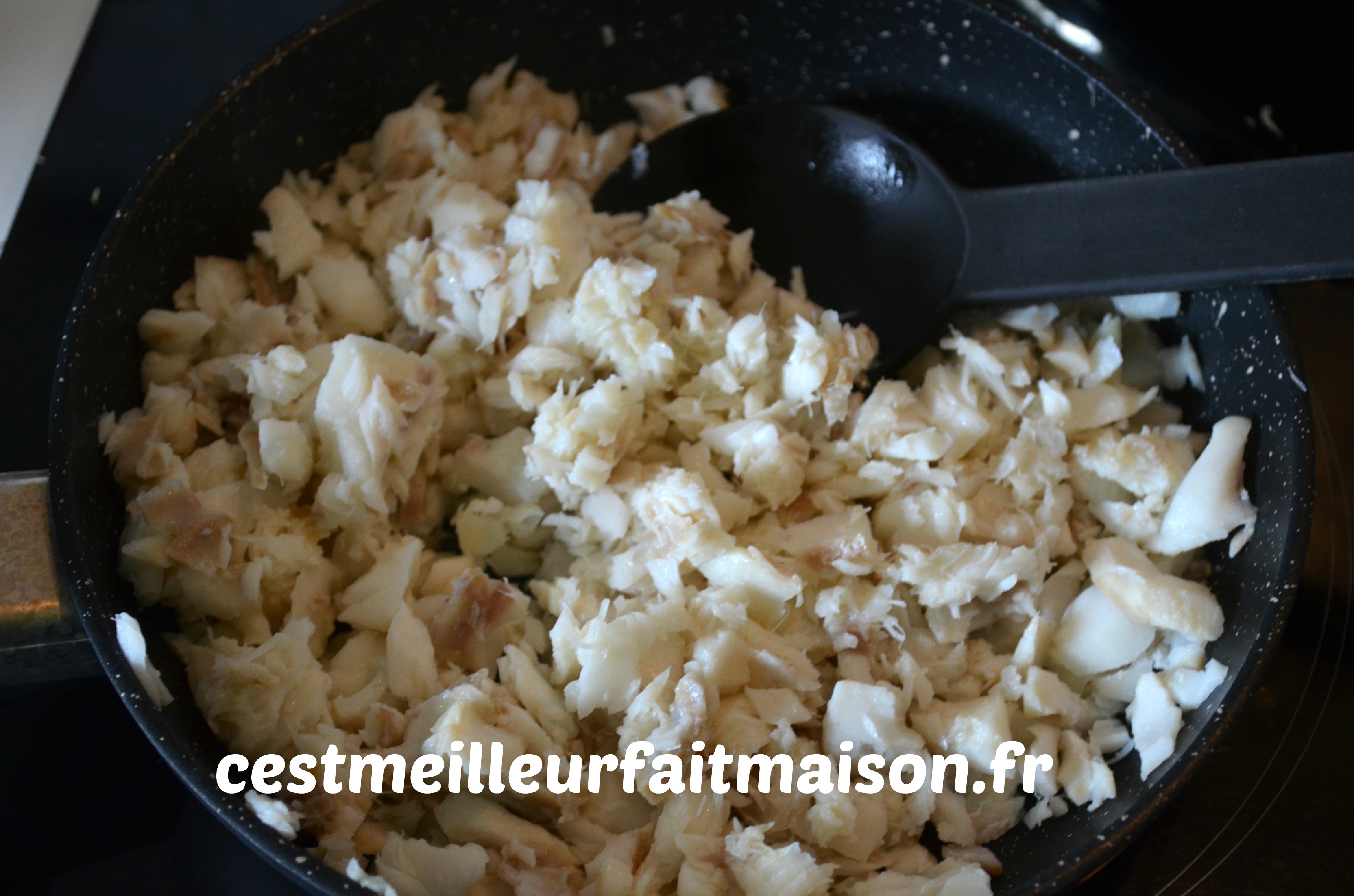 Émietter le poisson et le faire revenir quelques minute dans une poêle, avec l’huile d’olive, à feu vif pendant 2 min.