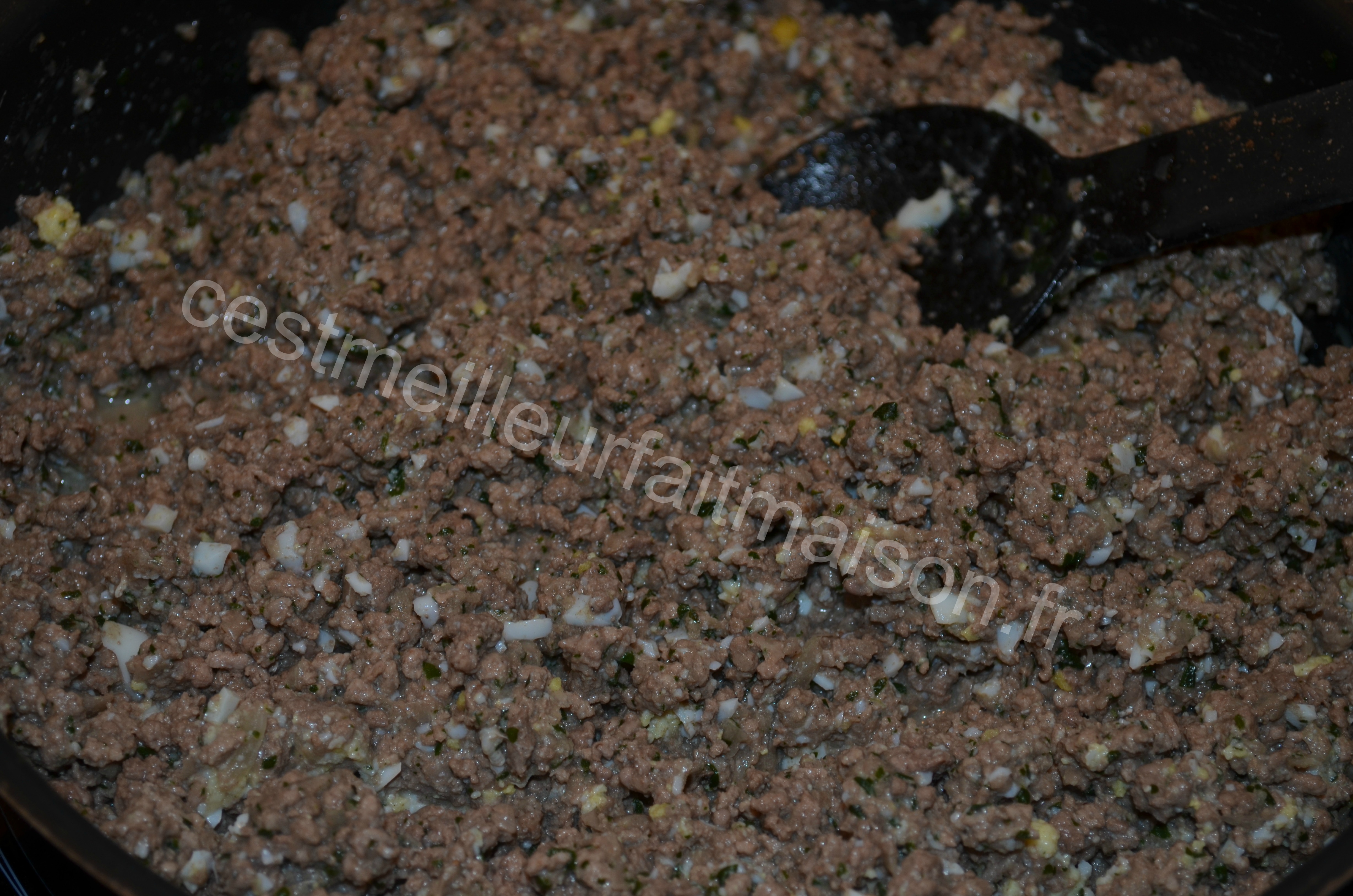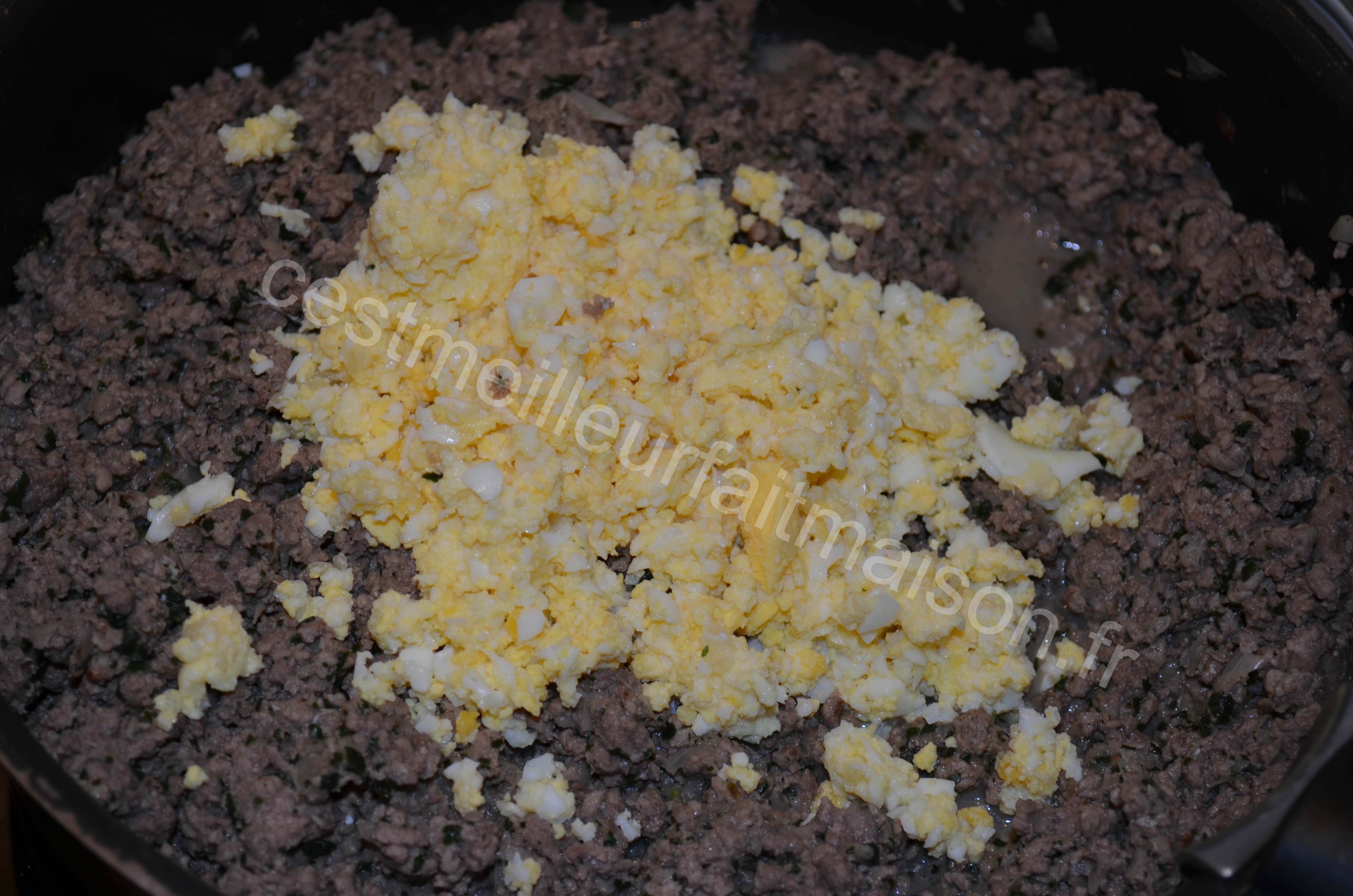 4- Quand la viande est cuite, couper la cuisson et casser un oeuf au-dessus et bien mélanger. Réserver.