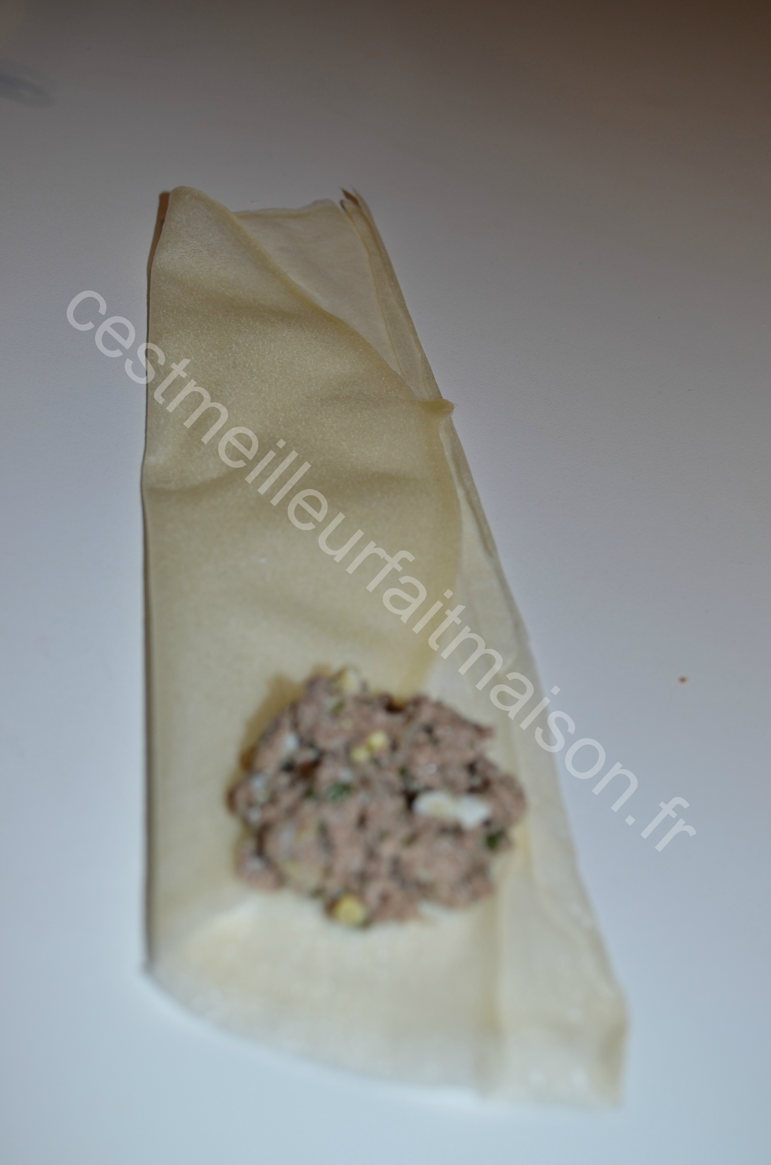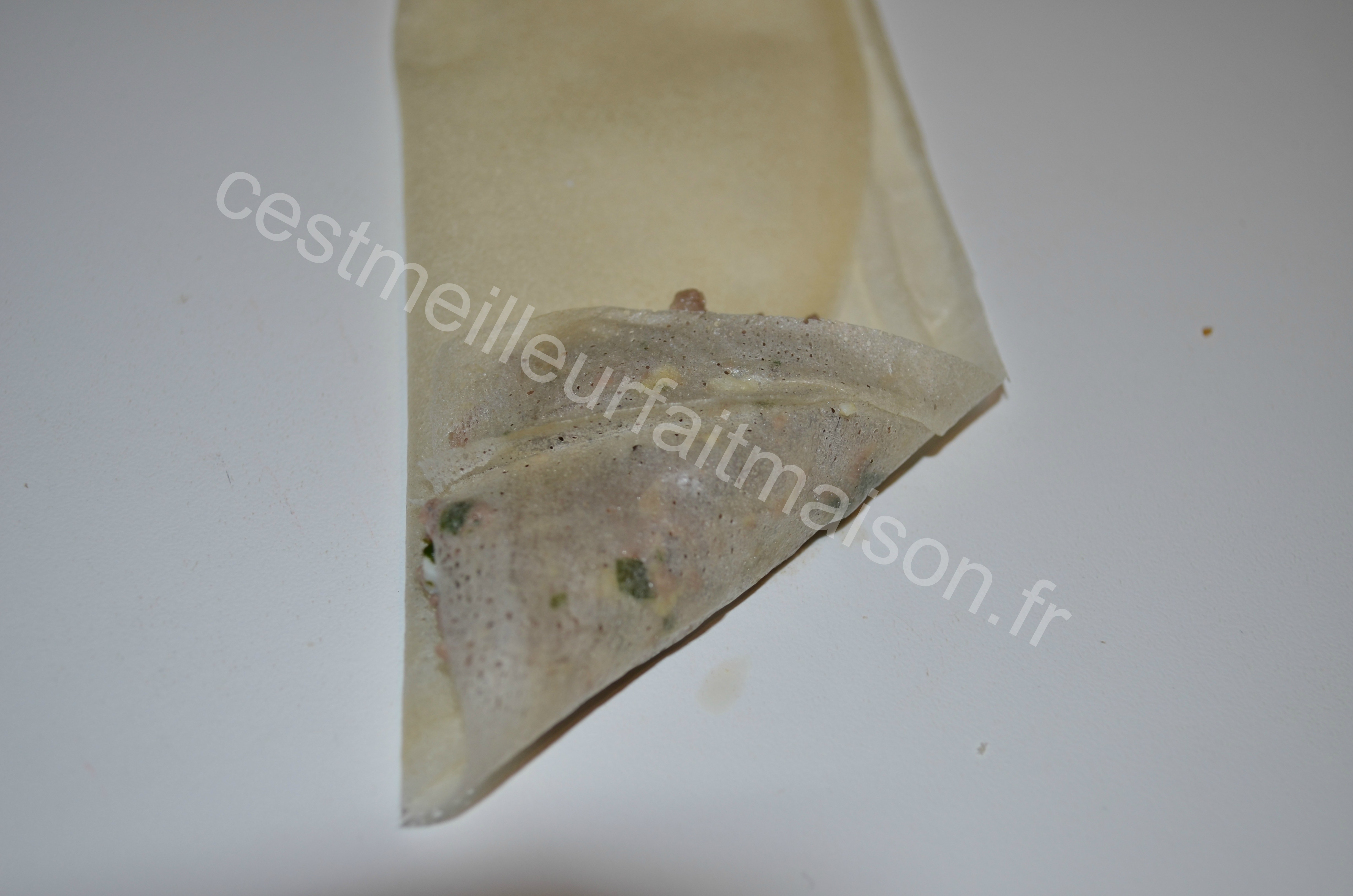 8- Replier chaque moitié de façon à avoir un rectangle. Déposer une cuillère à café de farce en bas et recouvrir avec la feuille en faisant un triangle. Remonter en suivant les bords du rectangle.