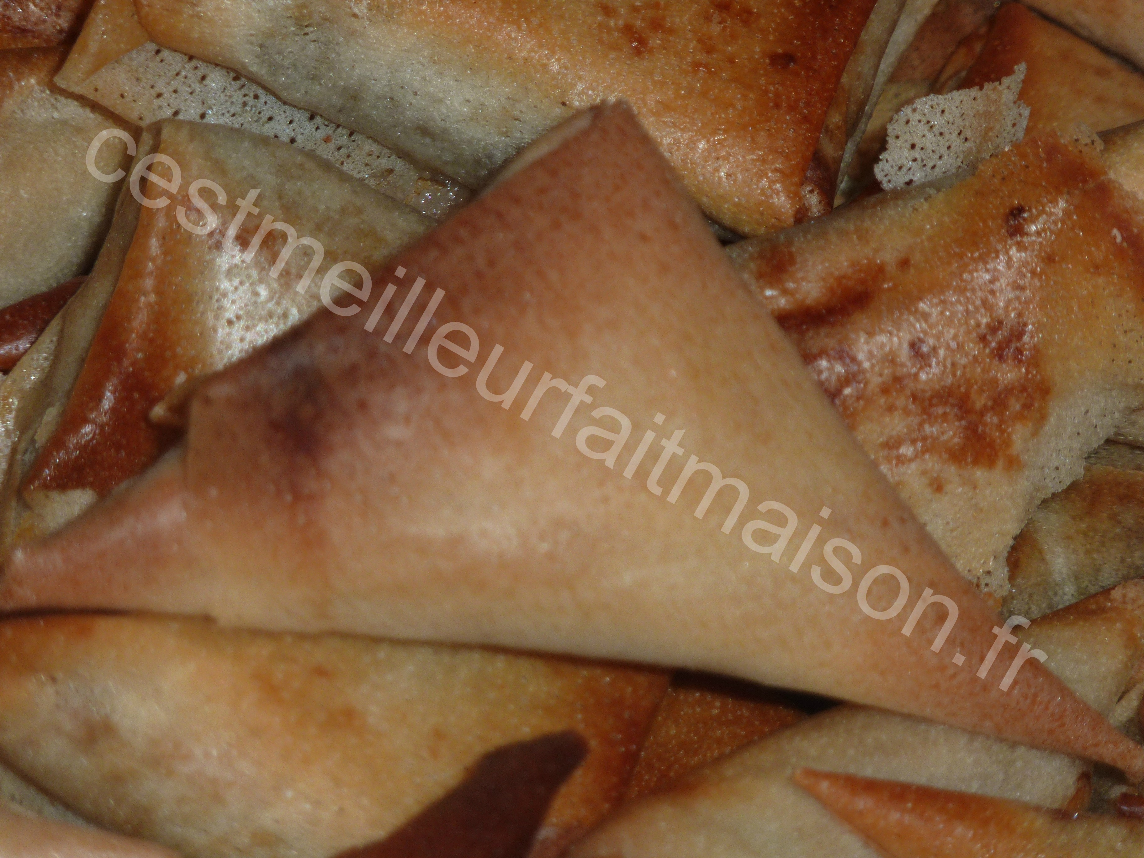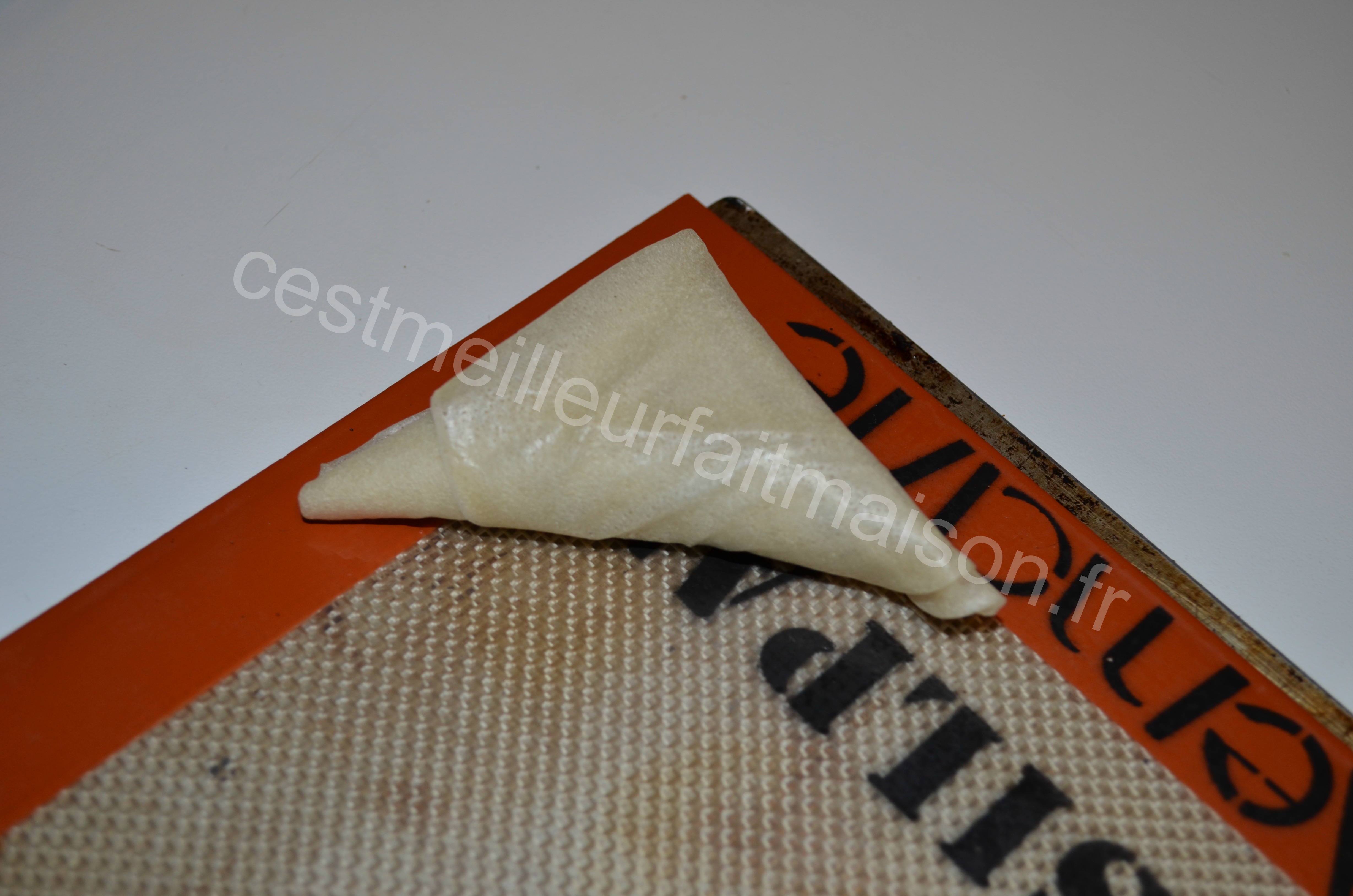 9- Poser chaque triangle (fermeture en dessous) sur une plaque de cuisson recouverte de papier cuisson ou d’une toile Silpat.