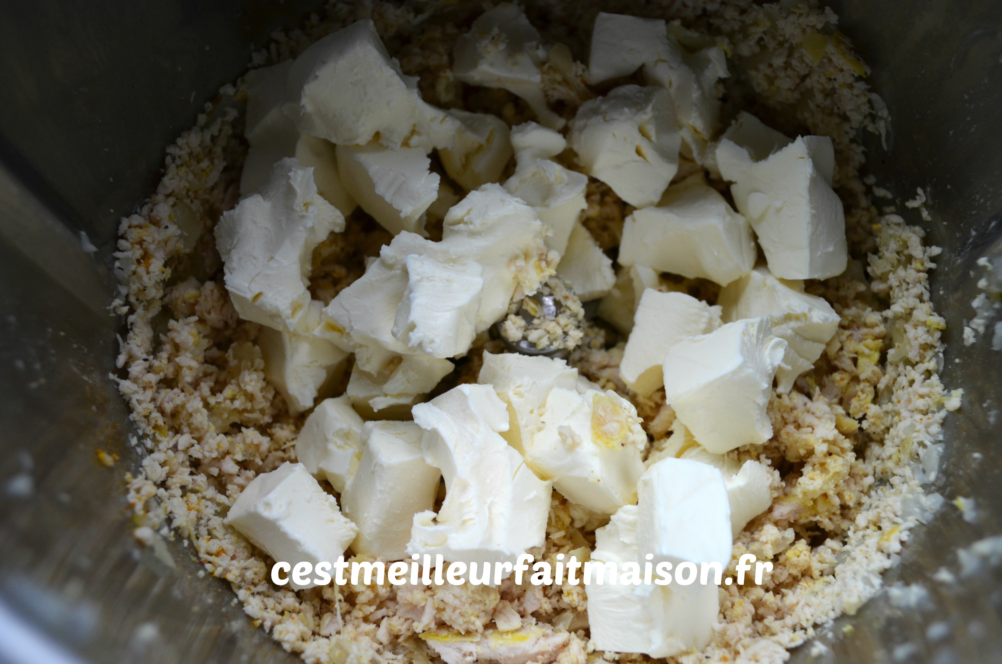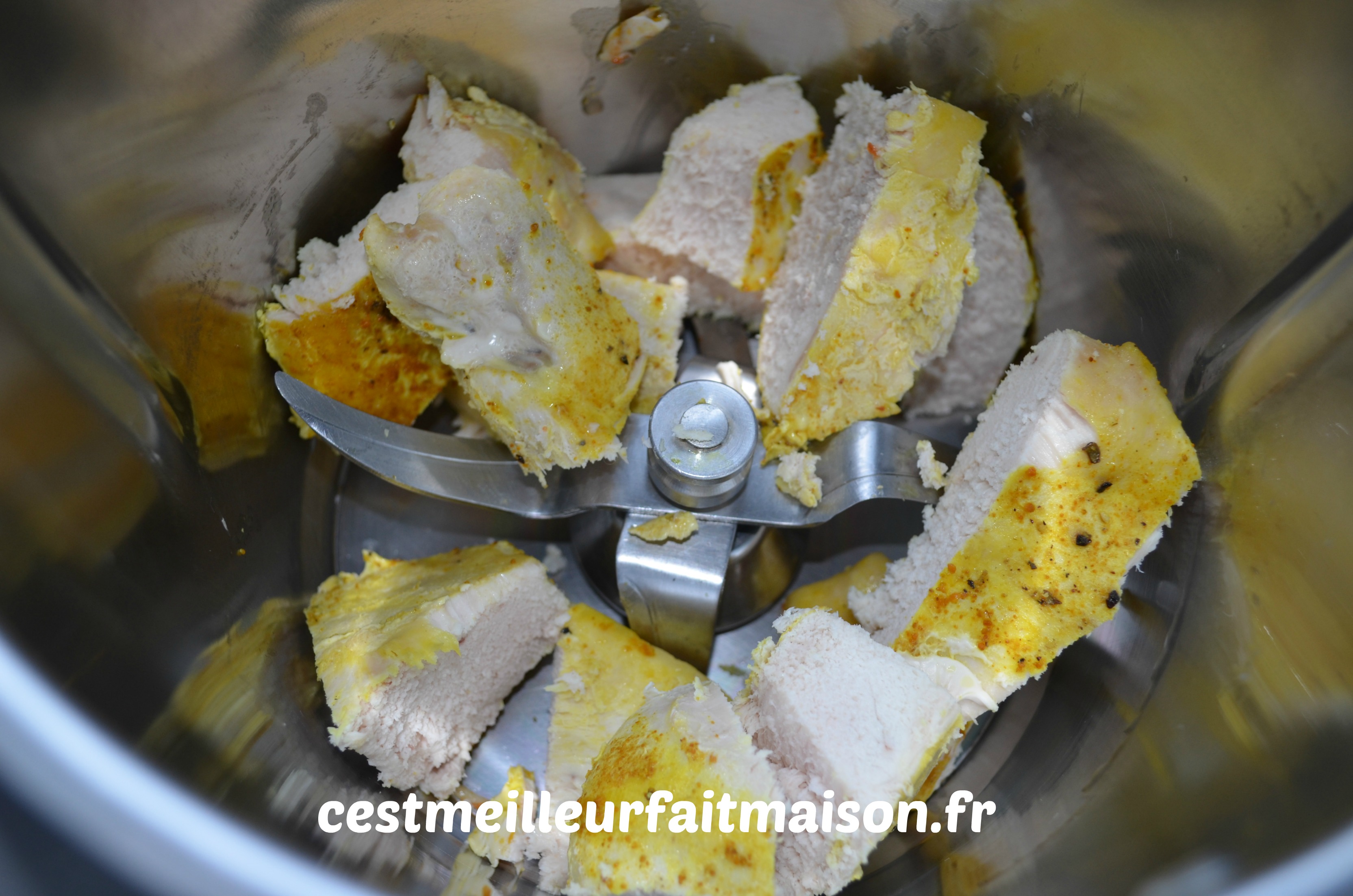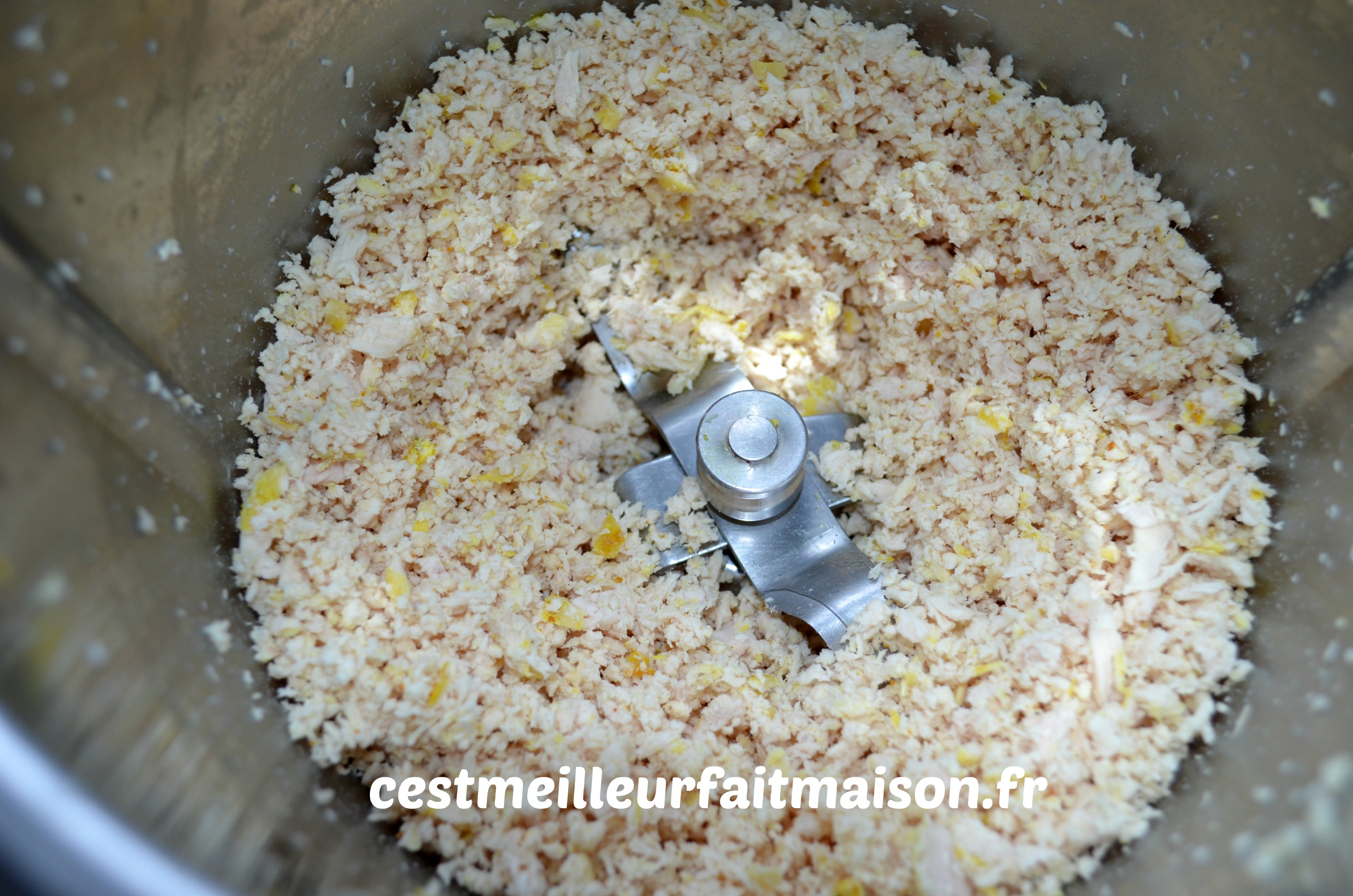 1-  Mixer grossièrement le poulet cuit. Au Thermomix, 2 pulsions Turbo. Réserver.