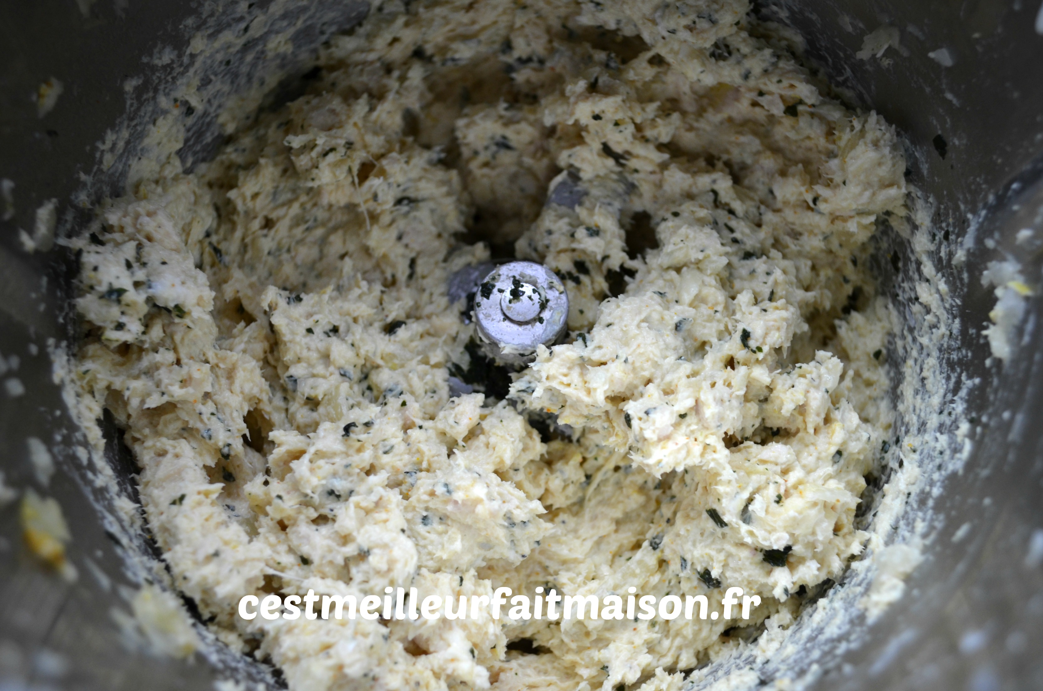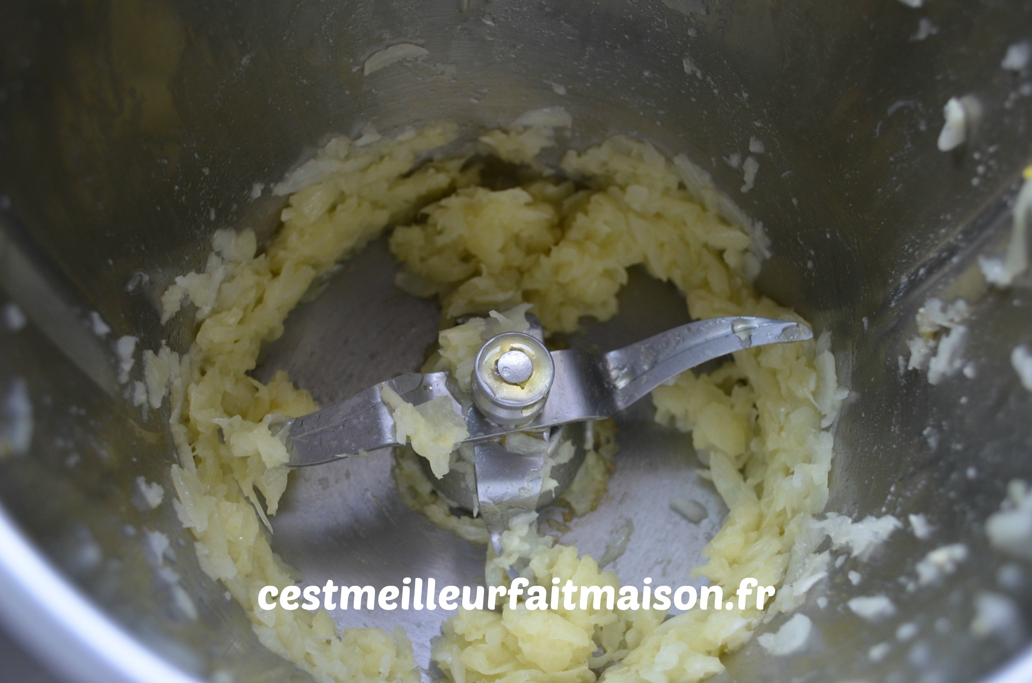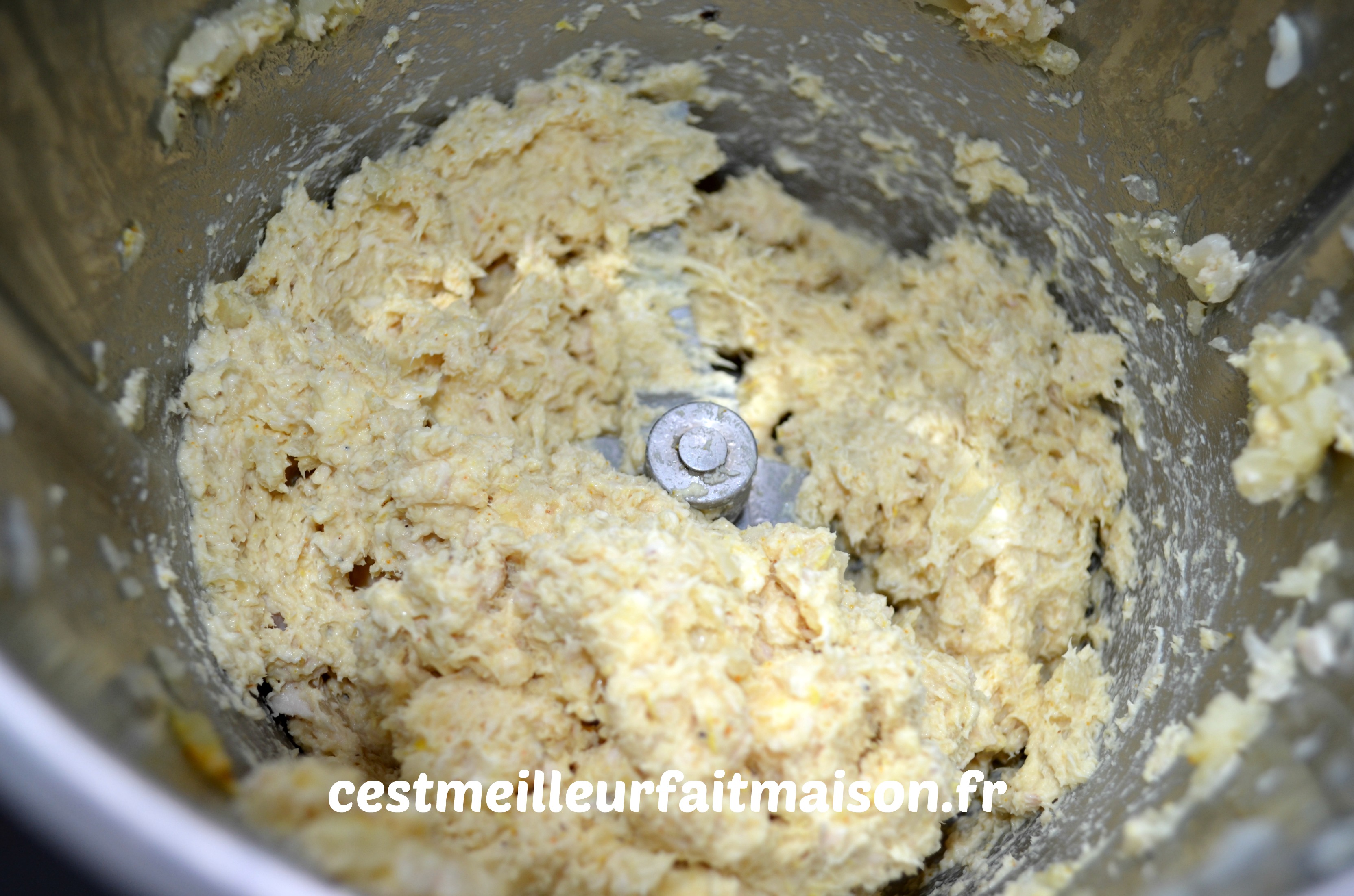 1-  Mixer grossièrement le poulet cuit. Au Thermomix, 2 pulsions Turbo. Réserver.