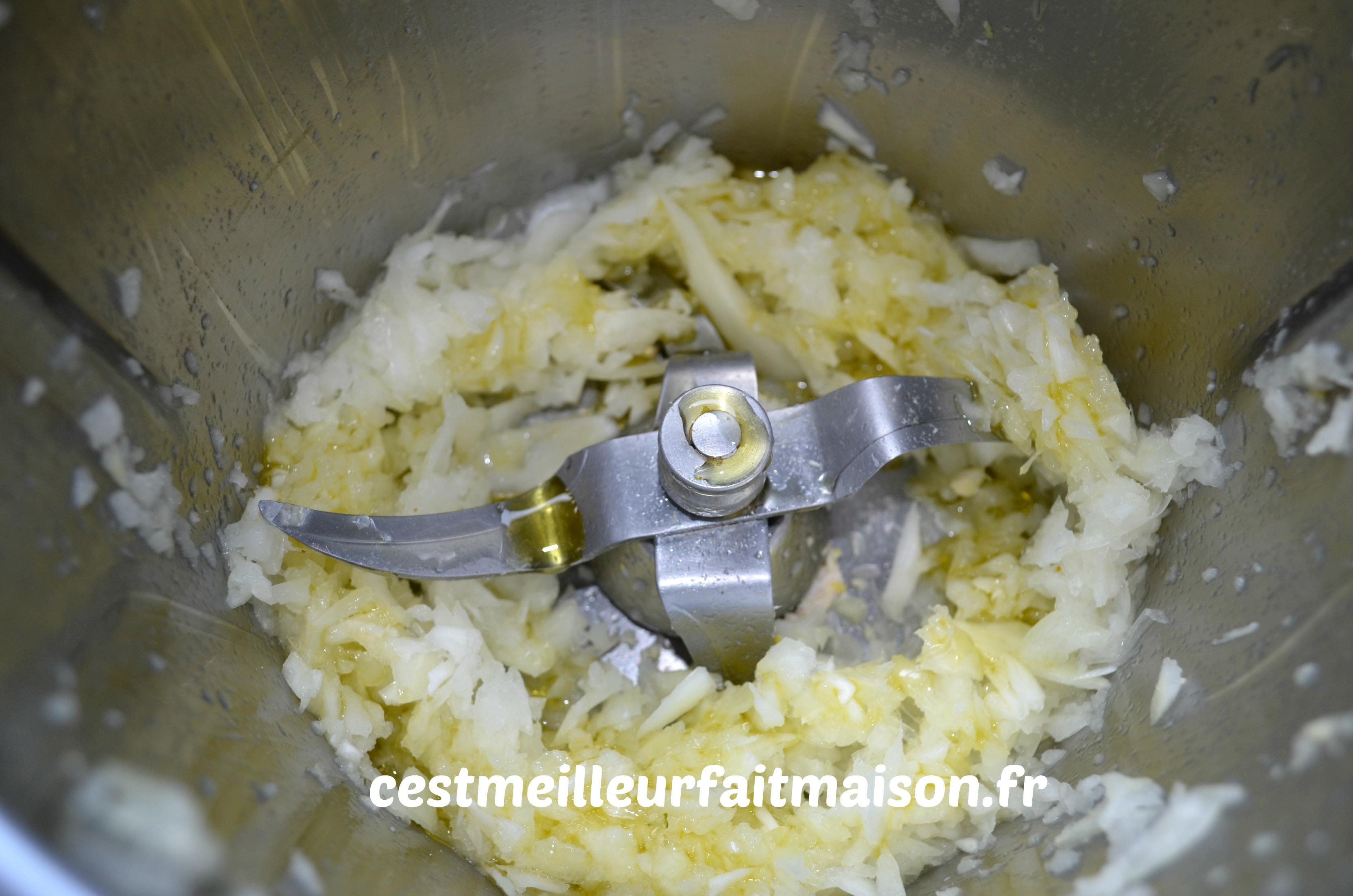 2- Mixer ensuite l’oignon. Le faire revenir 8 min/100°C/Vit 2 sans le gobelet.