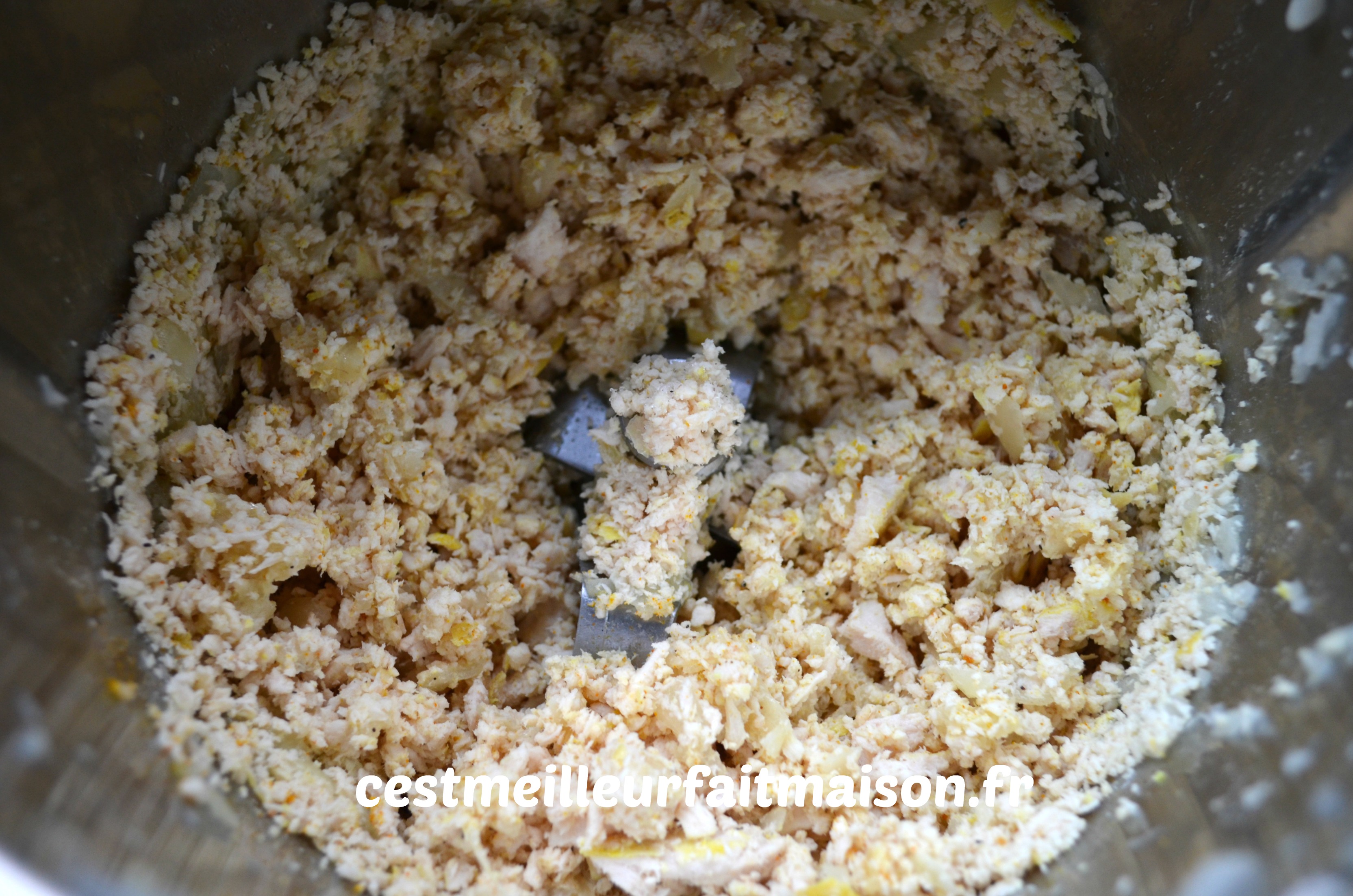 1- Mixer grossièrement le poulet cuit. Au Thermomix, 2 pulsions Turbo. Réserver.