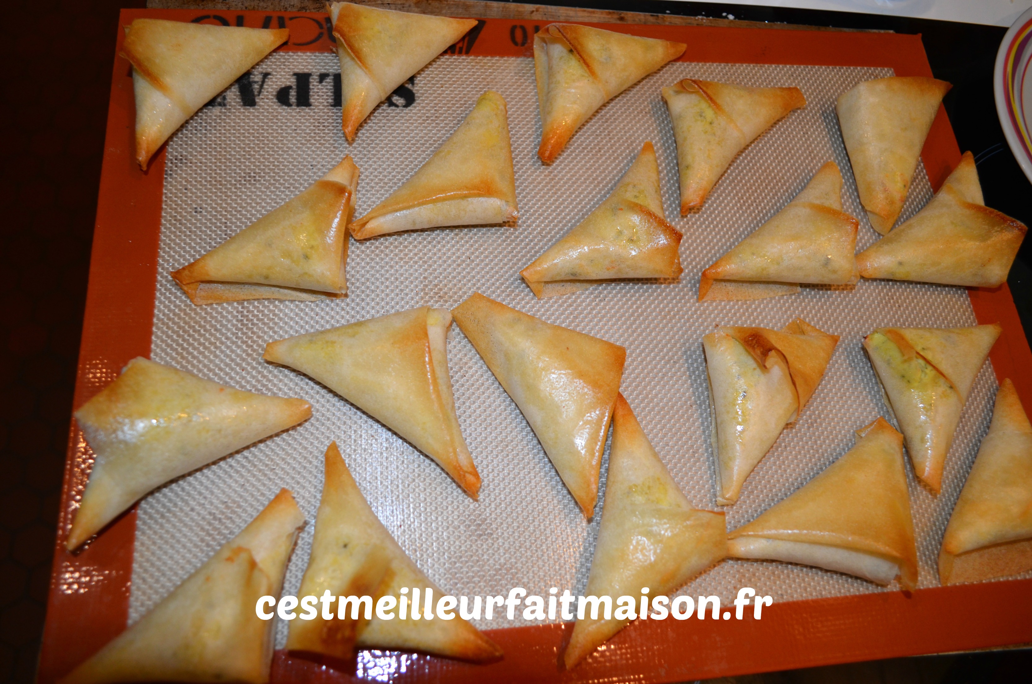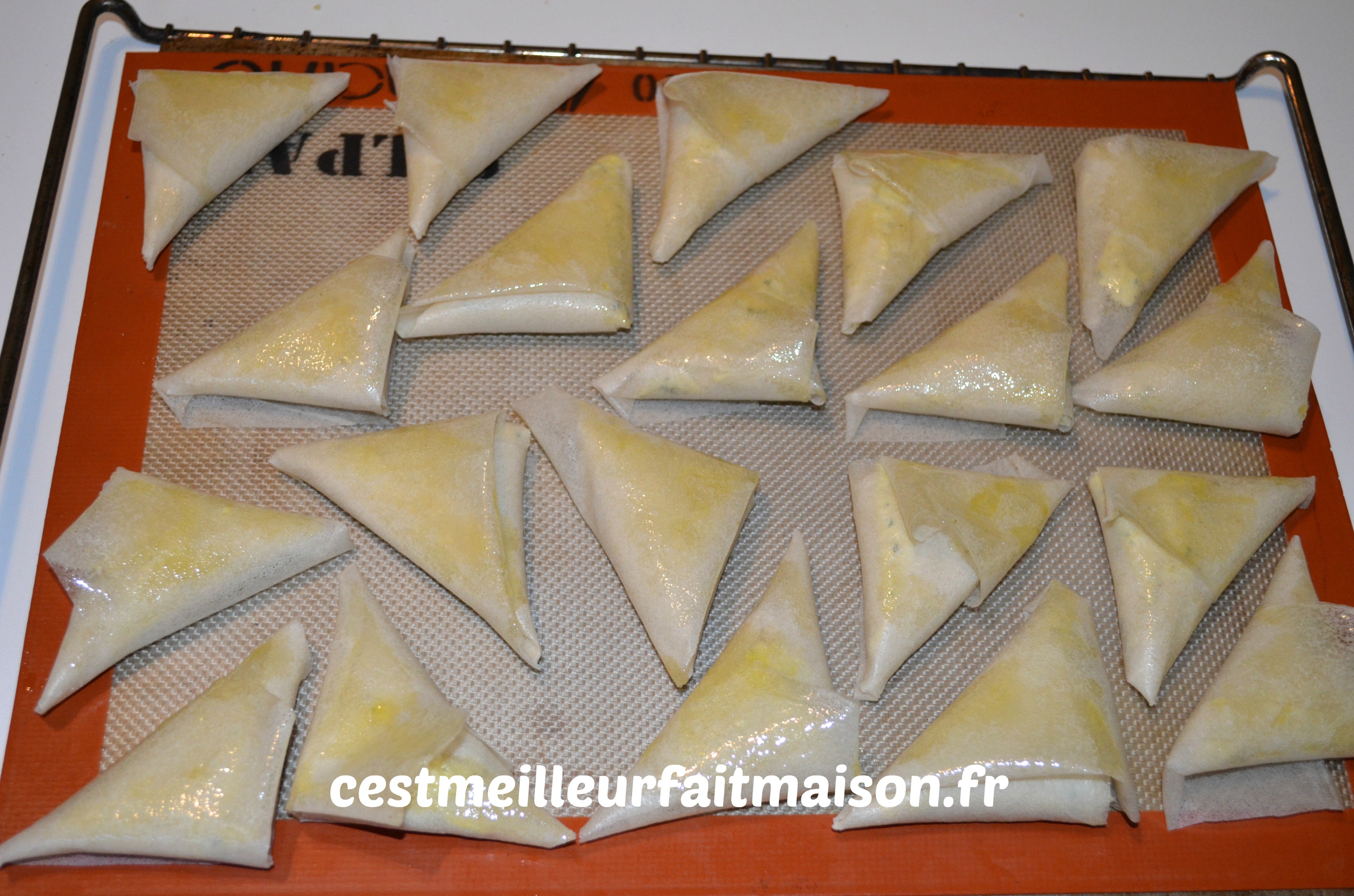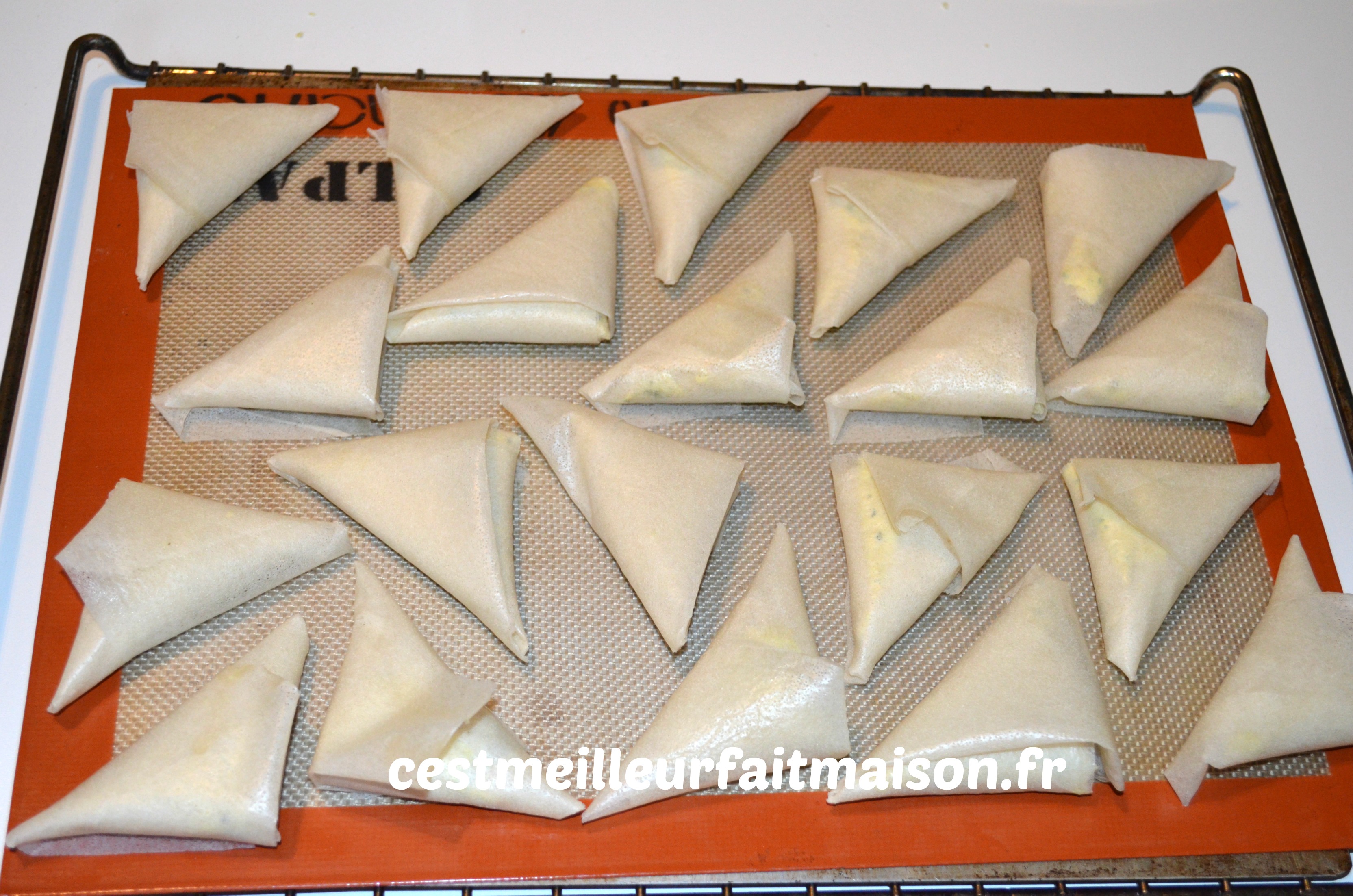 Couper les feuilles de bricks en deux, replier le côté arrondi vers l’autre bord pour obtenir un rectangle. Mettre une belle cuillère à café de farce en bas du rectangle et replier en remontant de façon à former un triangle. Poser les triangles sur une plaque recouverte d’une toile Silpat ou de papier cuisson.