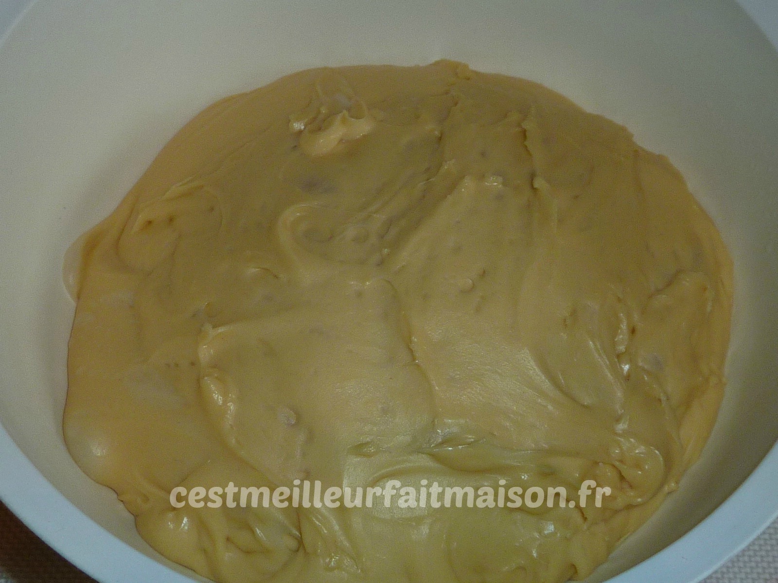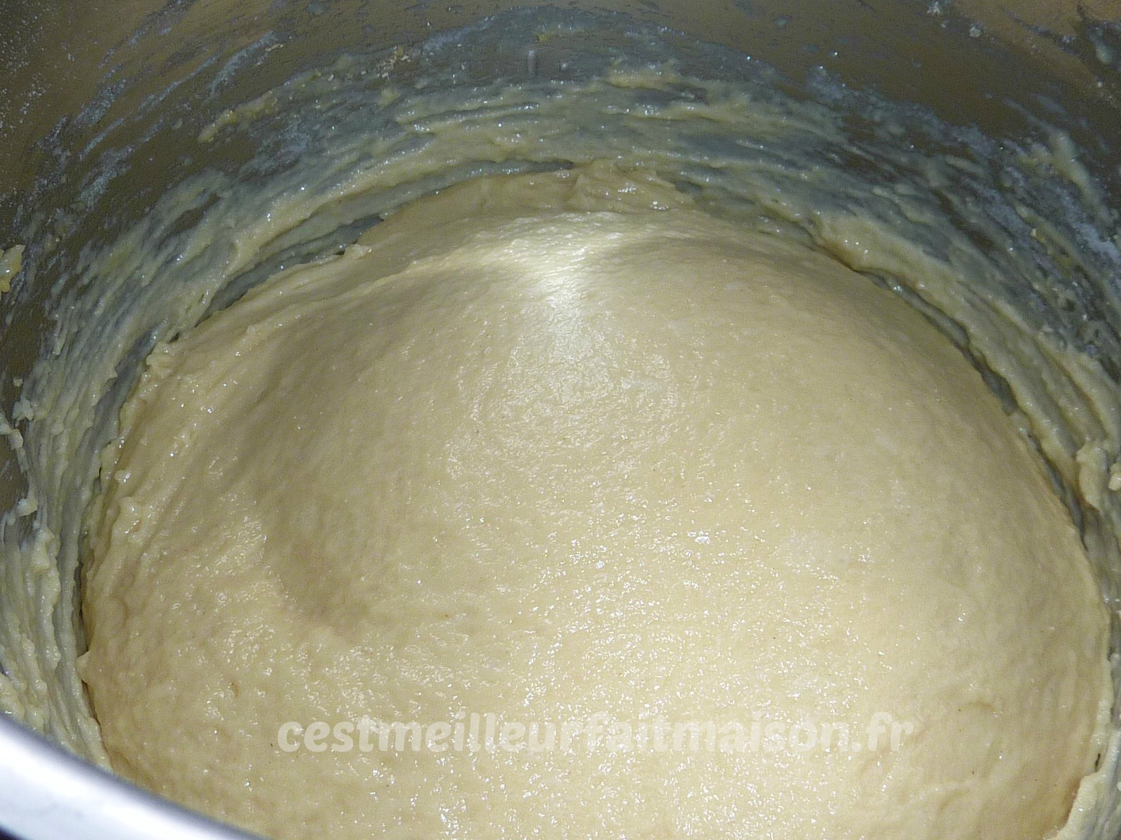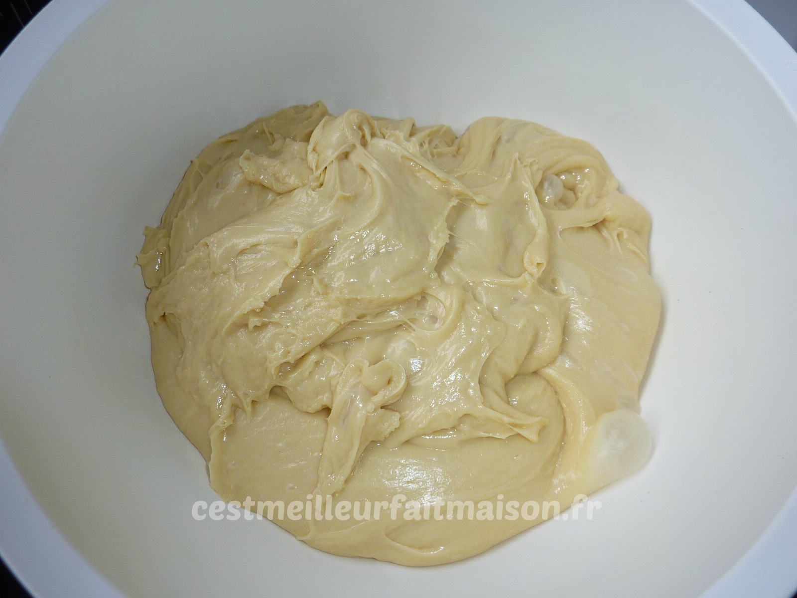 3- Mettre la pâte dans un saladier. Normalement on doit voir des bulles d’air. Recouvrir le saladier et mettre au réfrigérateur au moins une heure.