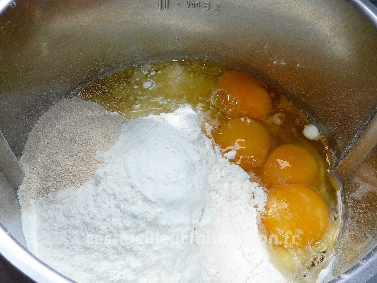 1- Mettre dans le bol du Thermomix le lait, le sucre, la farine, la levure, les oeufs et le sel. Pétrir 5 min.