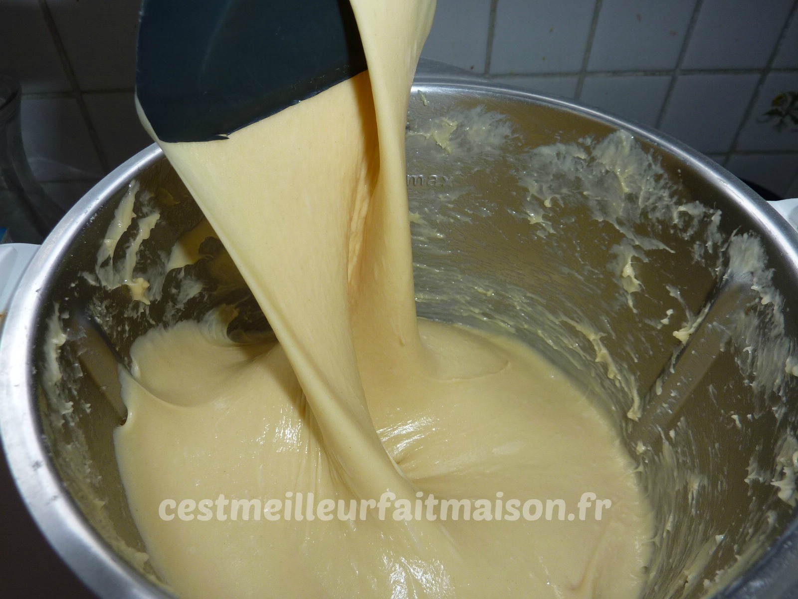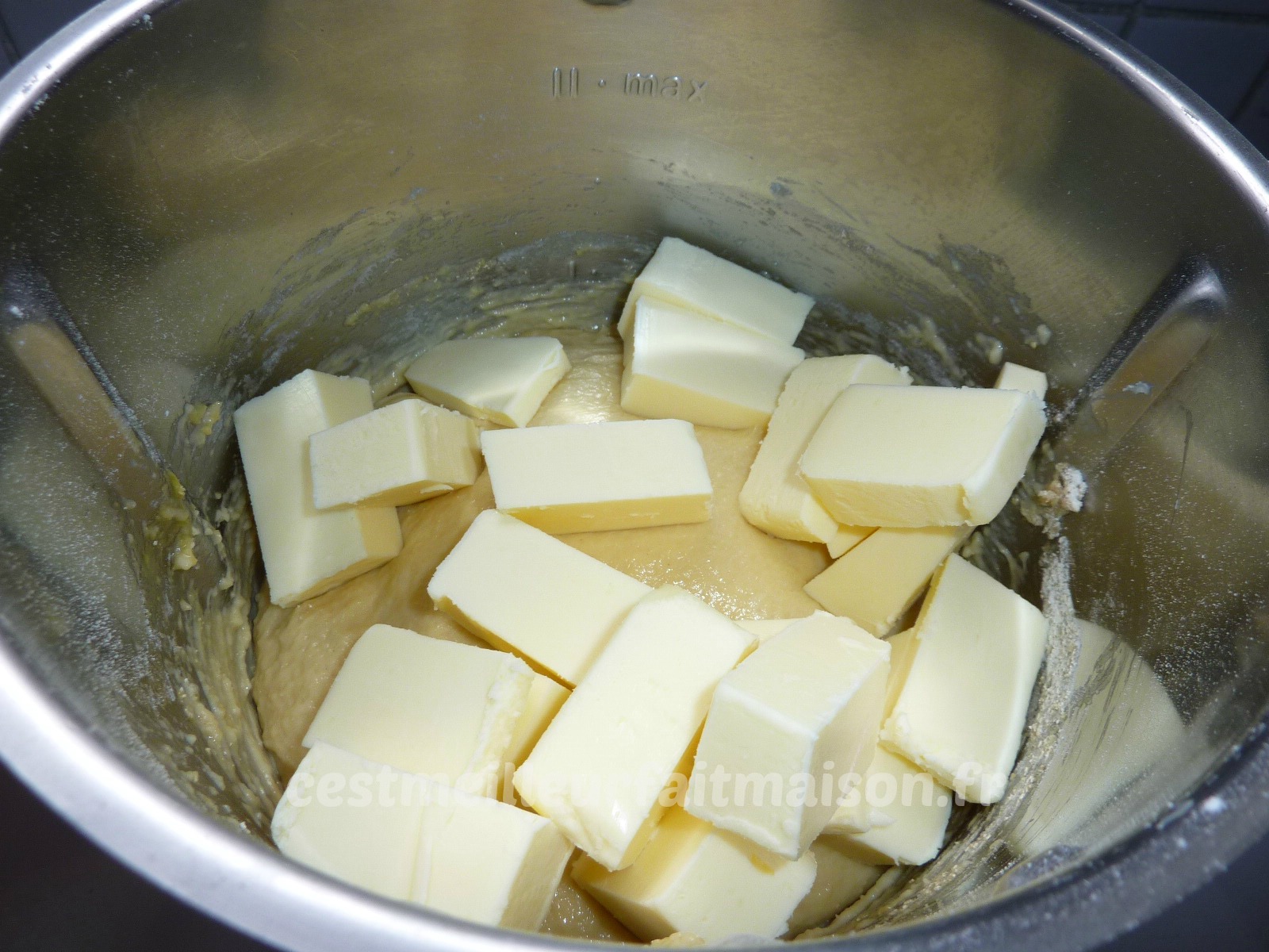 2- Ajouter le beurre et pétrir 15 min. Au bout de ce temps, la pâte est collante et filante.