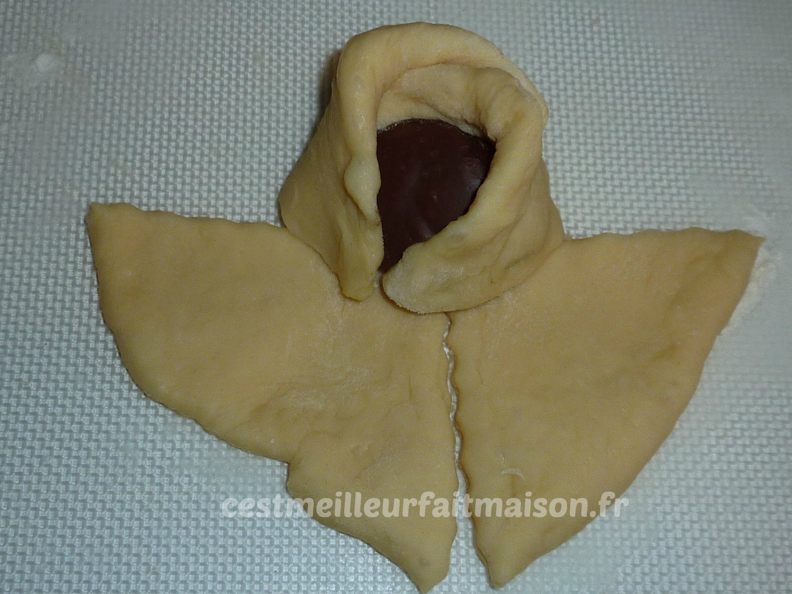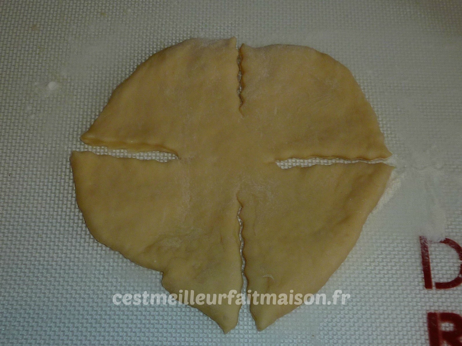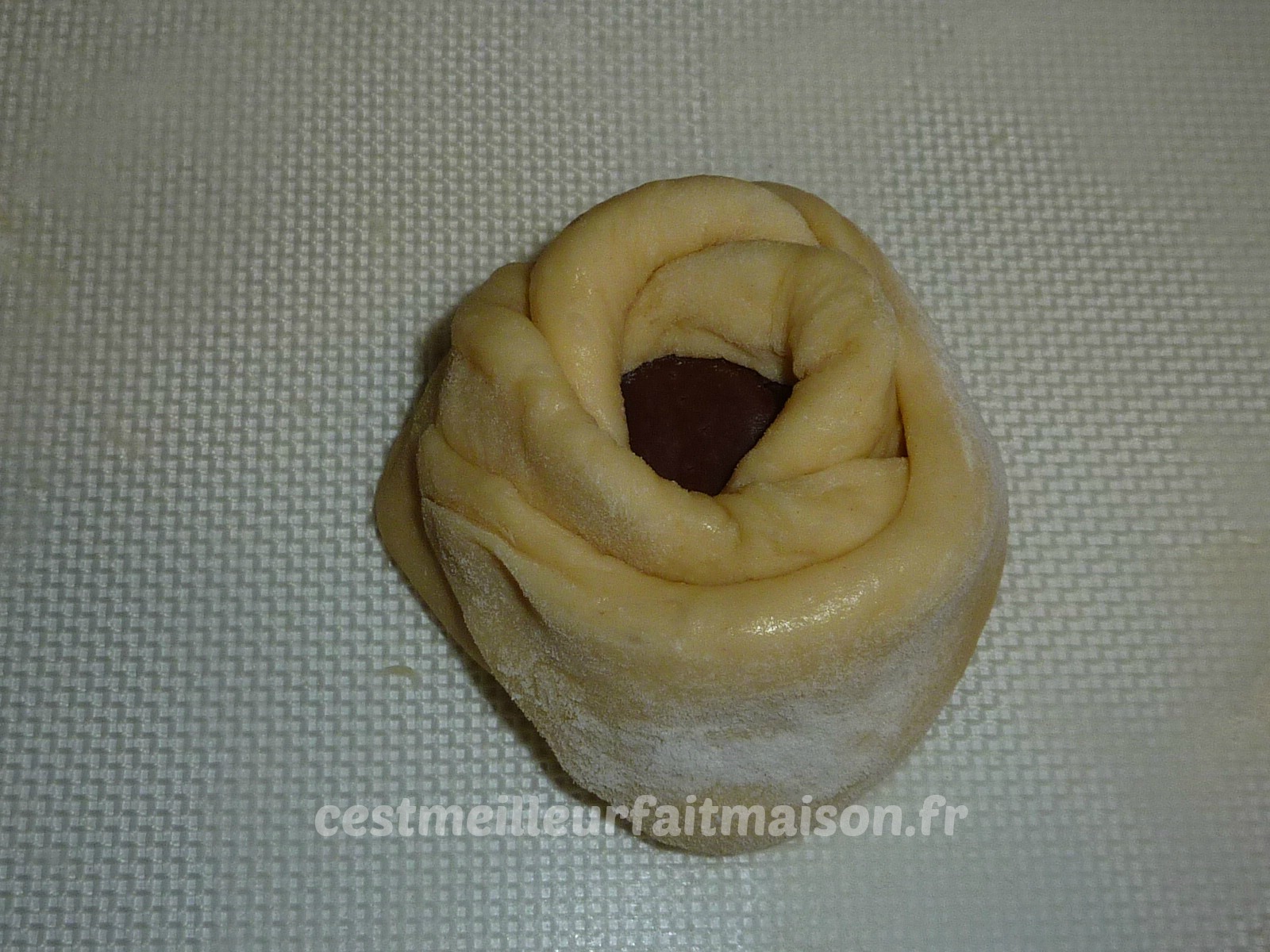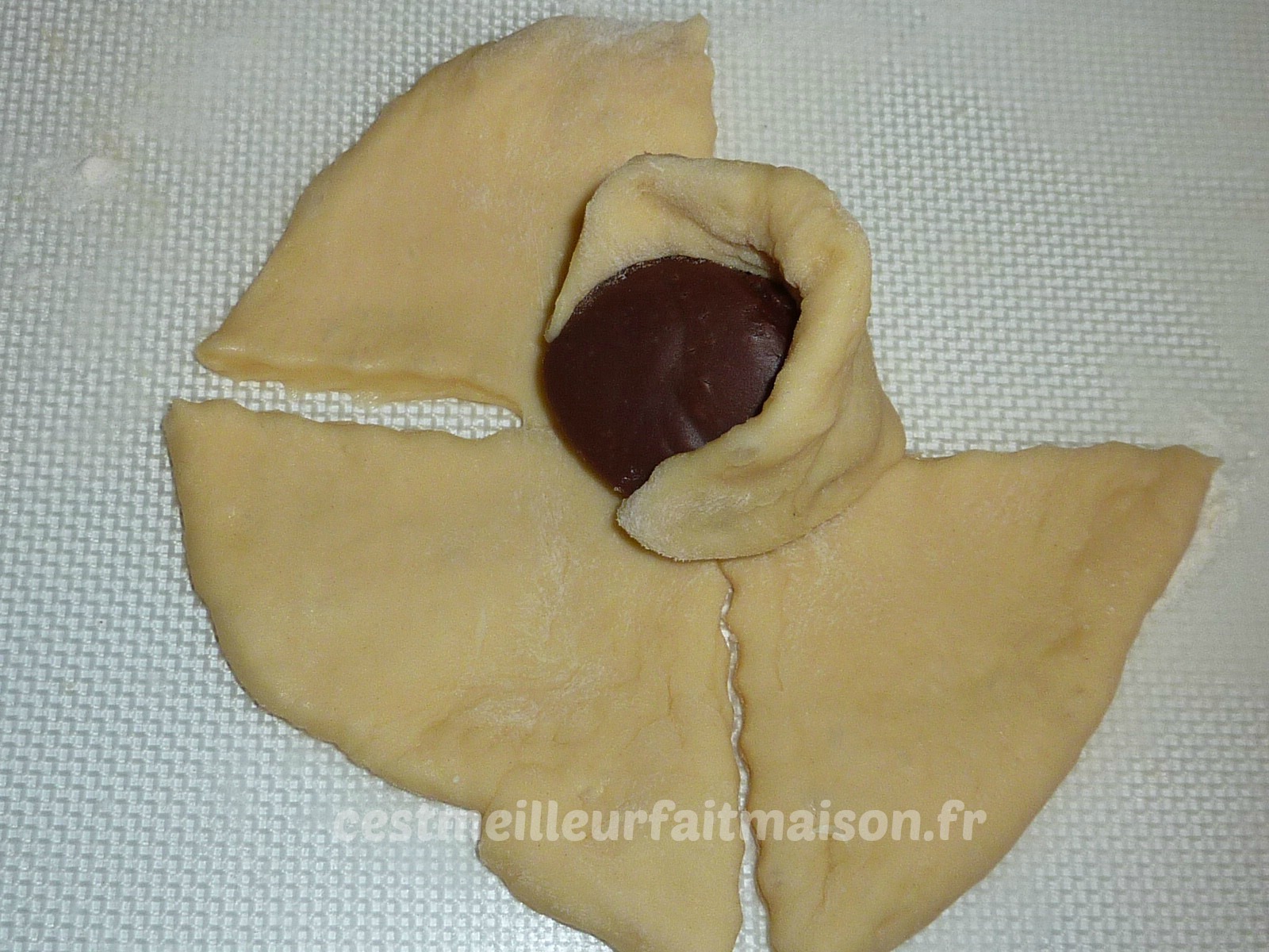 5- Etaler en rond les boules de 90 g. Les couper en 4 sans toucher le milieu. Mettre une boule de pâte à tartiner au milieu et refermer chaque pétale de façon à faire une rose.