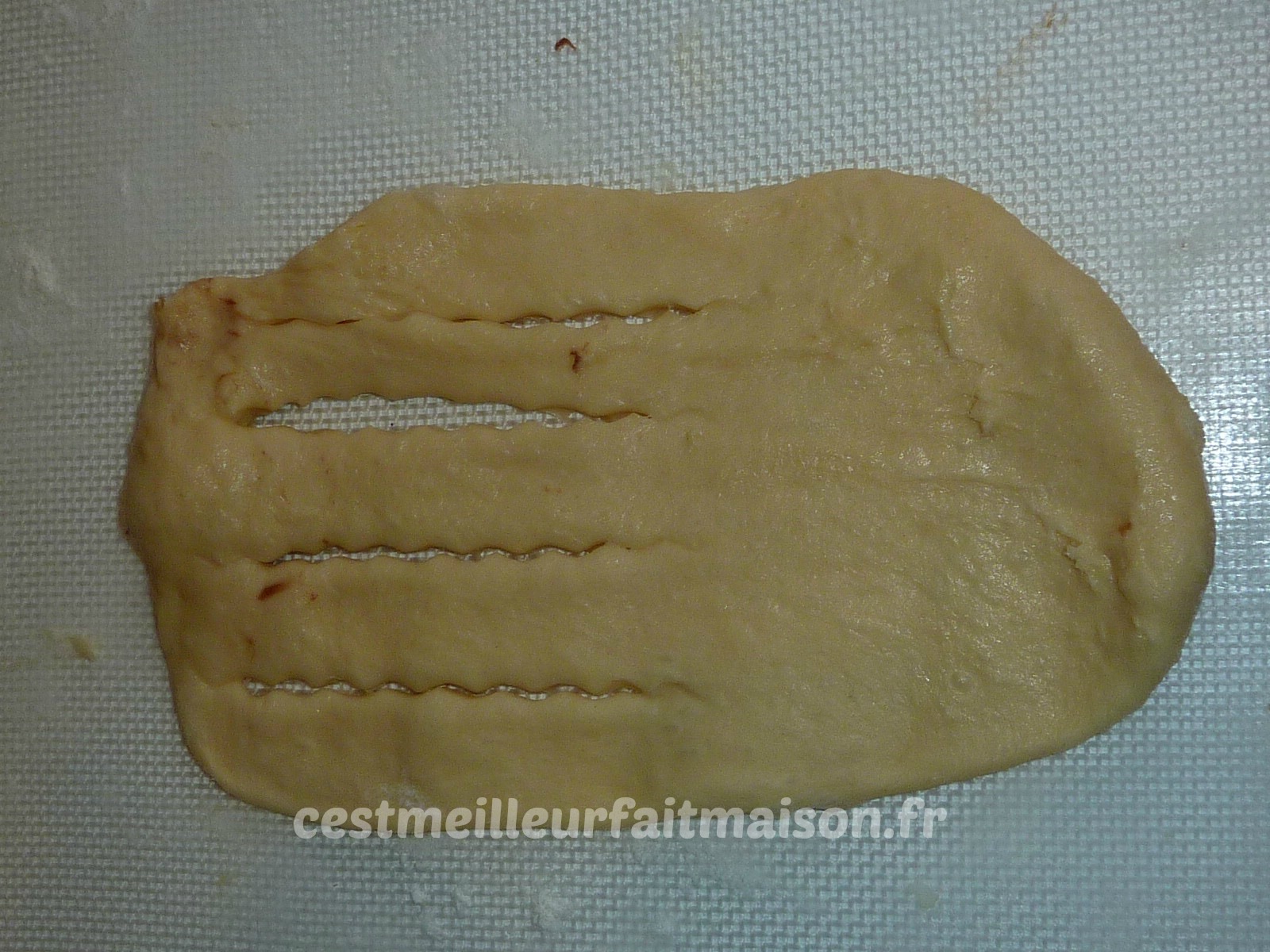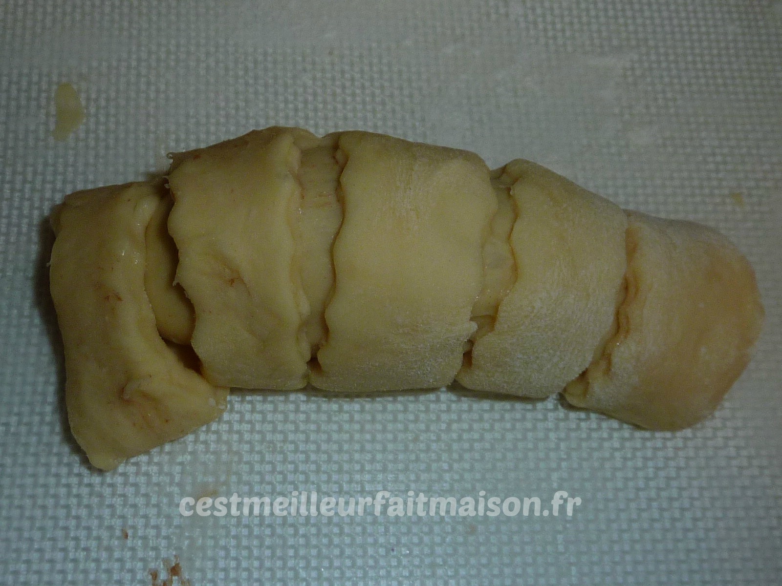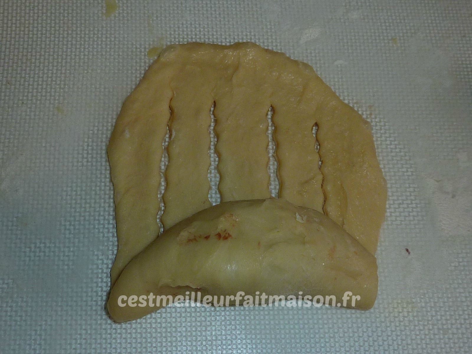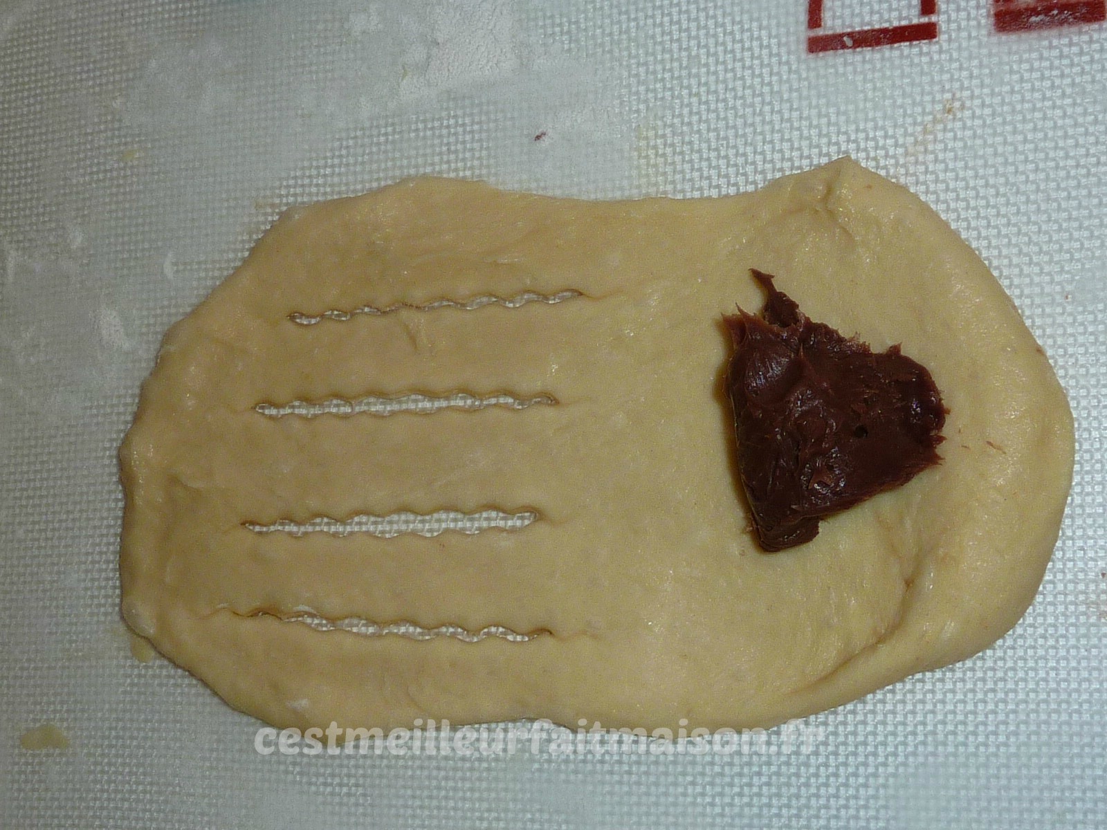 6- Etaler en ovale les 4 boules restantes. Inciser le haut avec une roulette à pâtisserie et mettre une boule de pâte à tartiner en bas. Rouler du bas vers le haut pour faire un boudin.