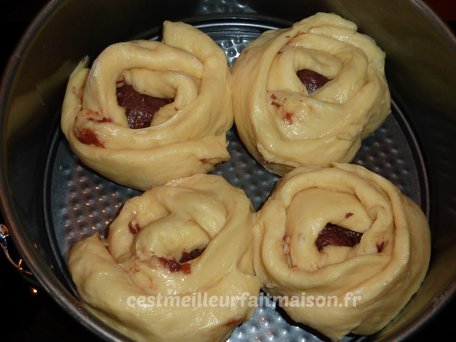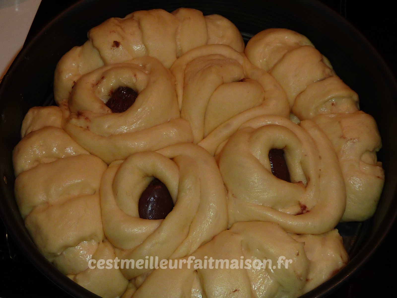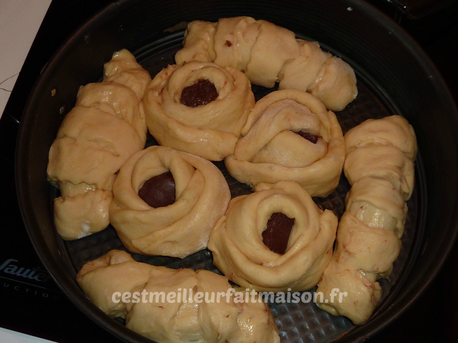 Comme promis, je vous donne cette recette attendue par les personnes qui l’on goûtée la semaine dernière et par les copines qui l’on vue sur mon facebook. D’habitude je fais cette brioche nature mais là j’ai eu envie de la fourrer au chocolat. Pour le façonnage, j’ai pris l’idée sur une page facebook consacrée à Thermomix. Pour le chocolat, j’ai utilisé de la pâte à tartiner maison mais vous pouvez mettre autre chose.