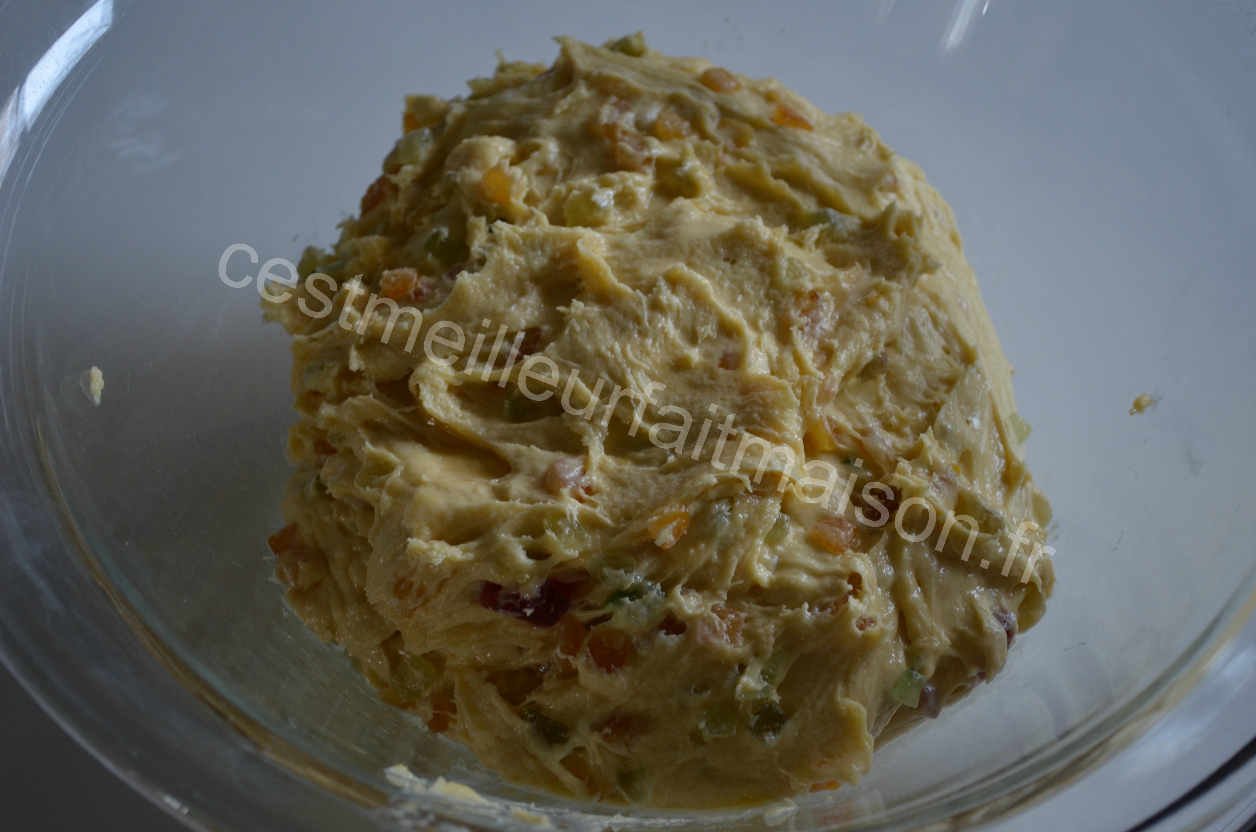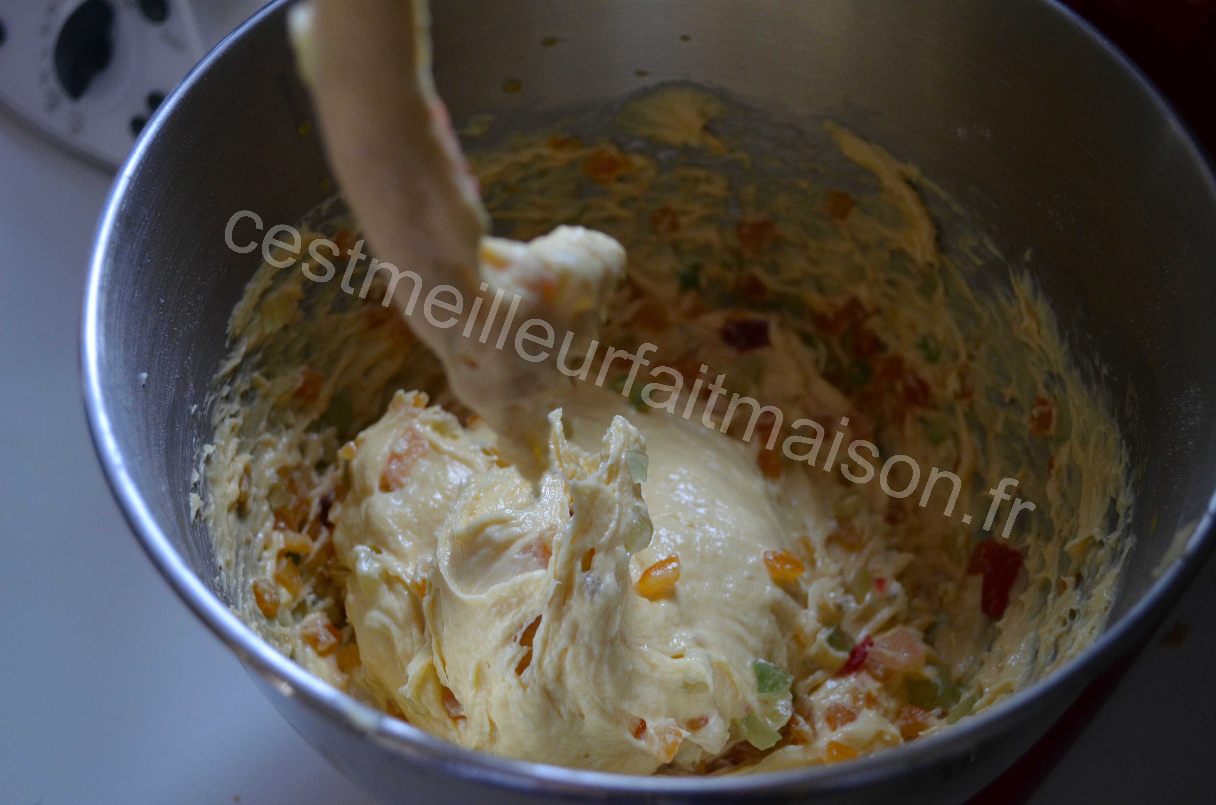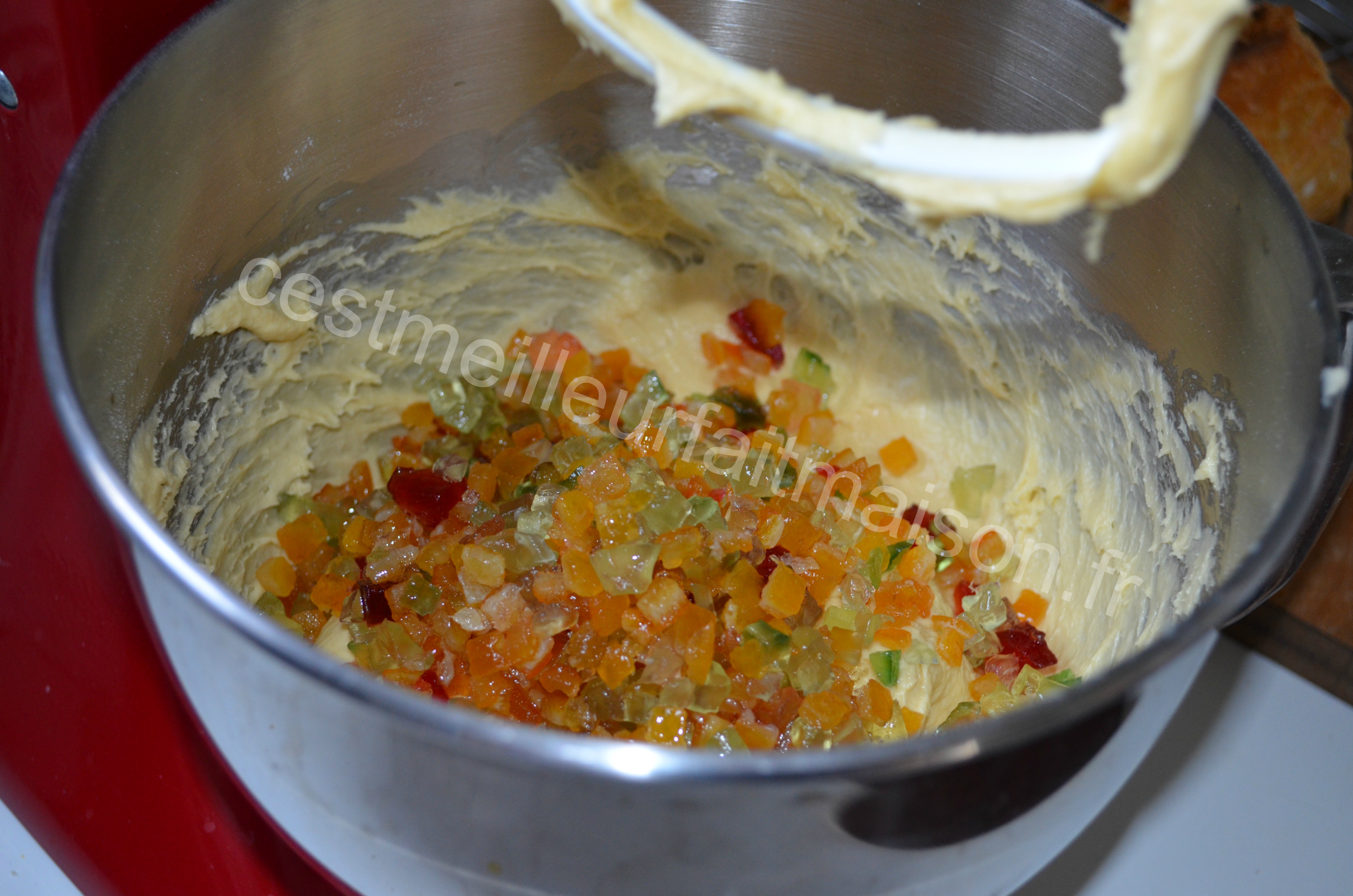 5-Incorporer les fruits confits macérés et mélanger quelques secondes. Débarasser dans un saladier filmé.