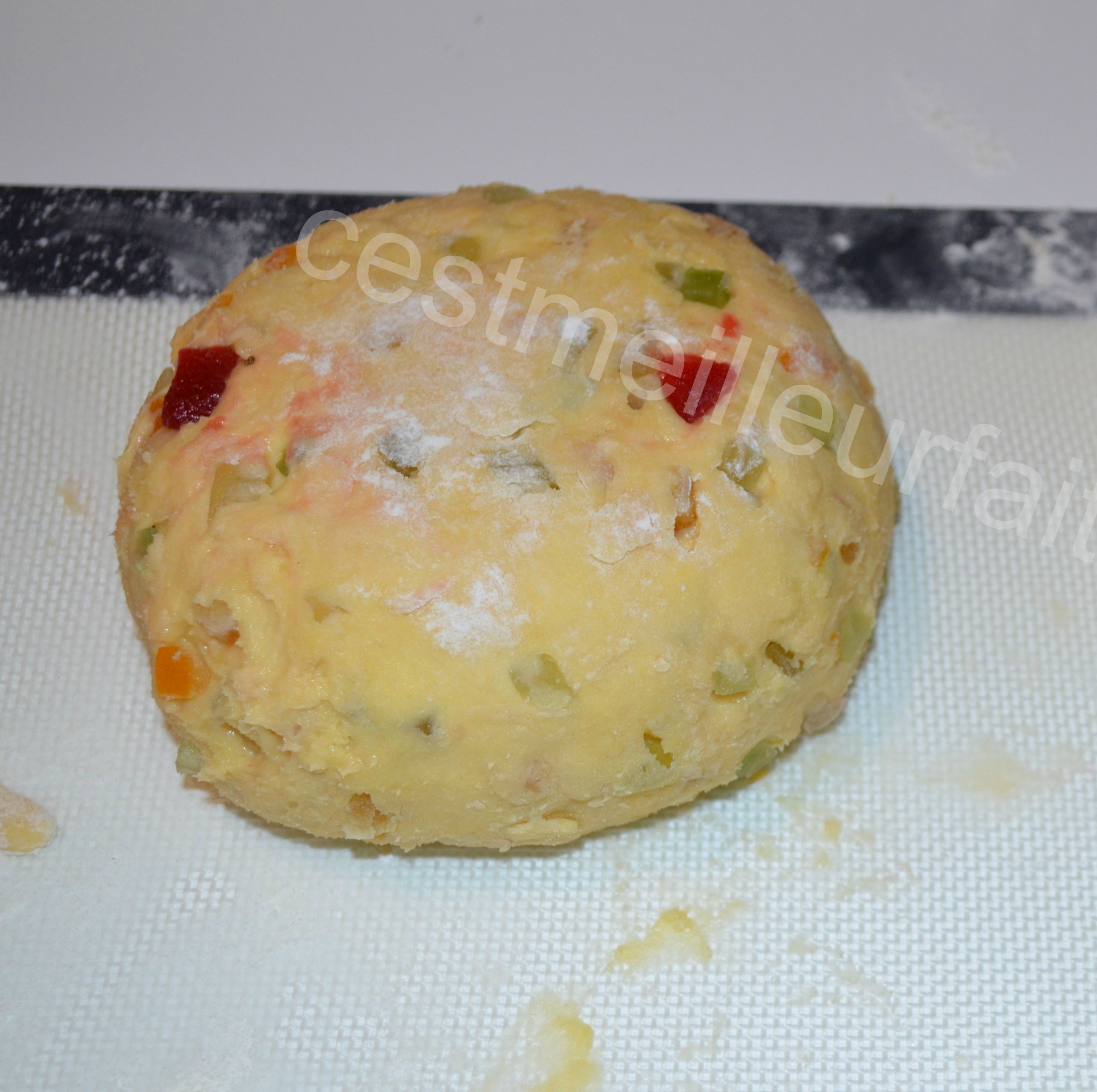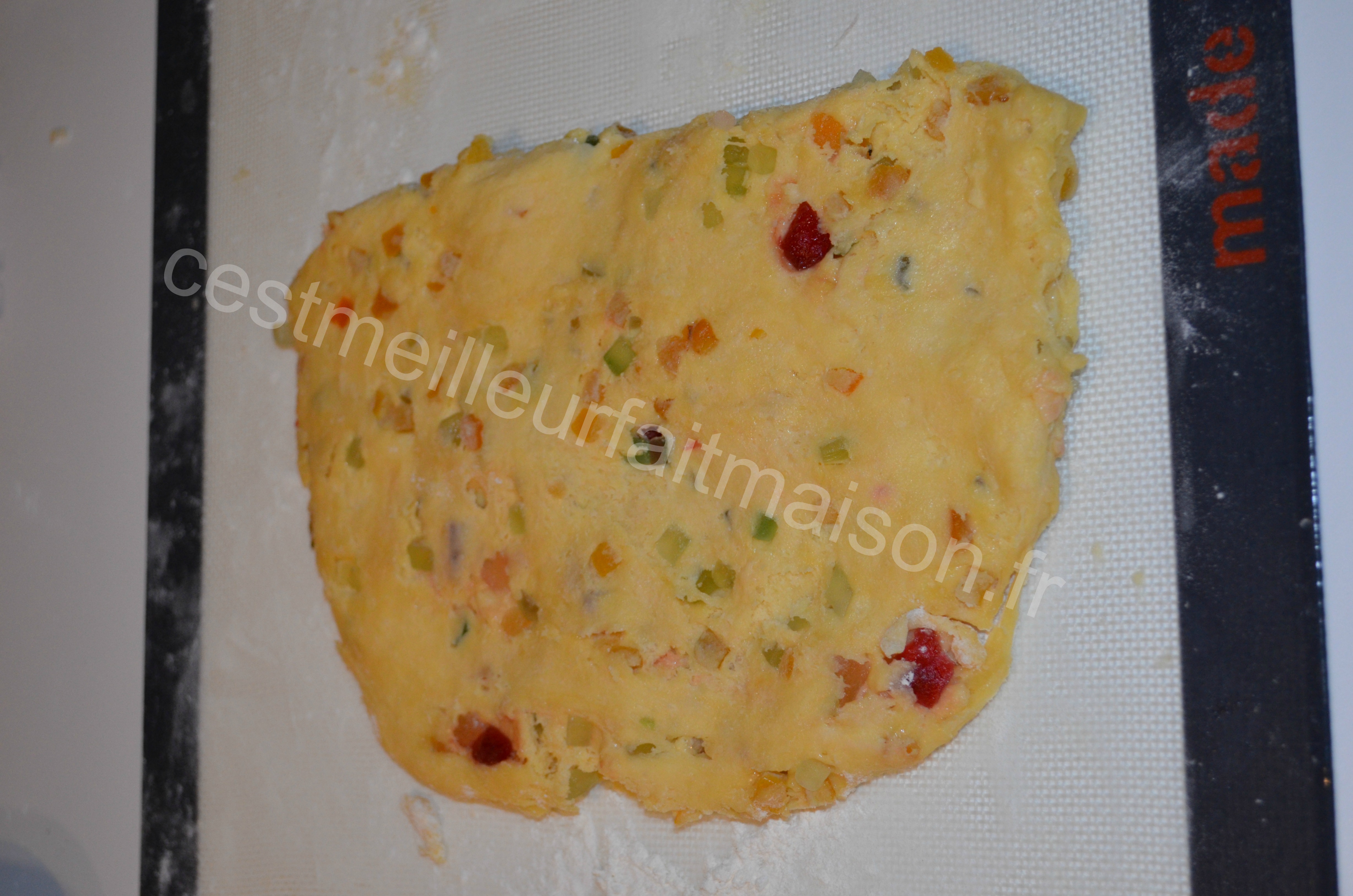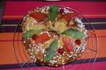 13-Laisser refroidir sur une grille et décorer avec des fruits confits de différentes couleurs.