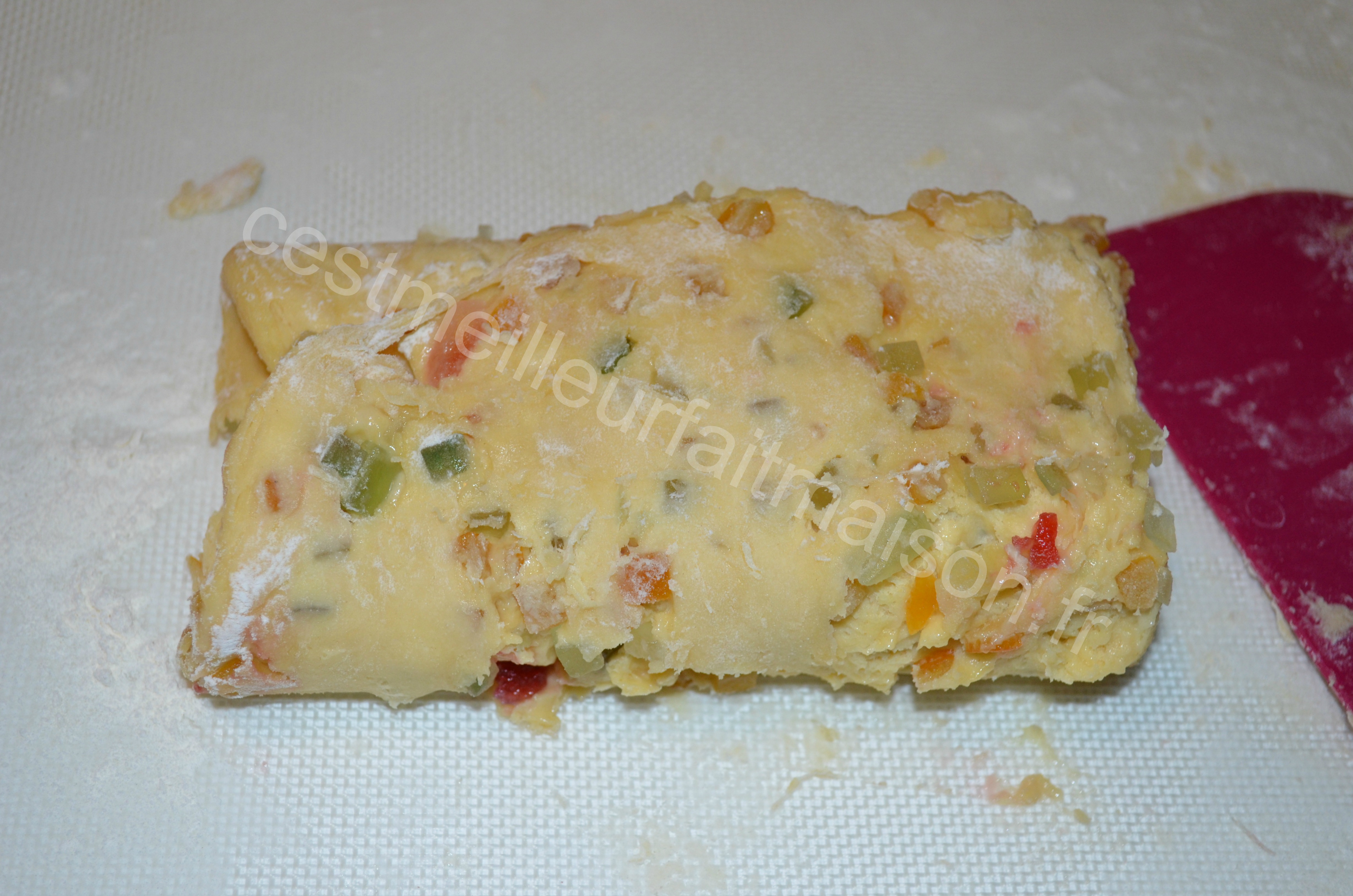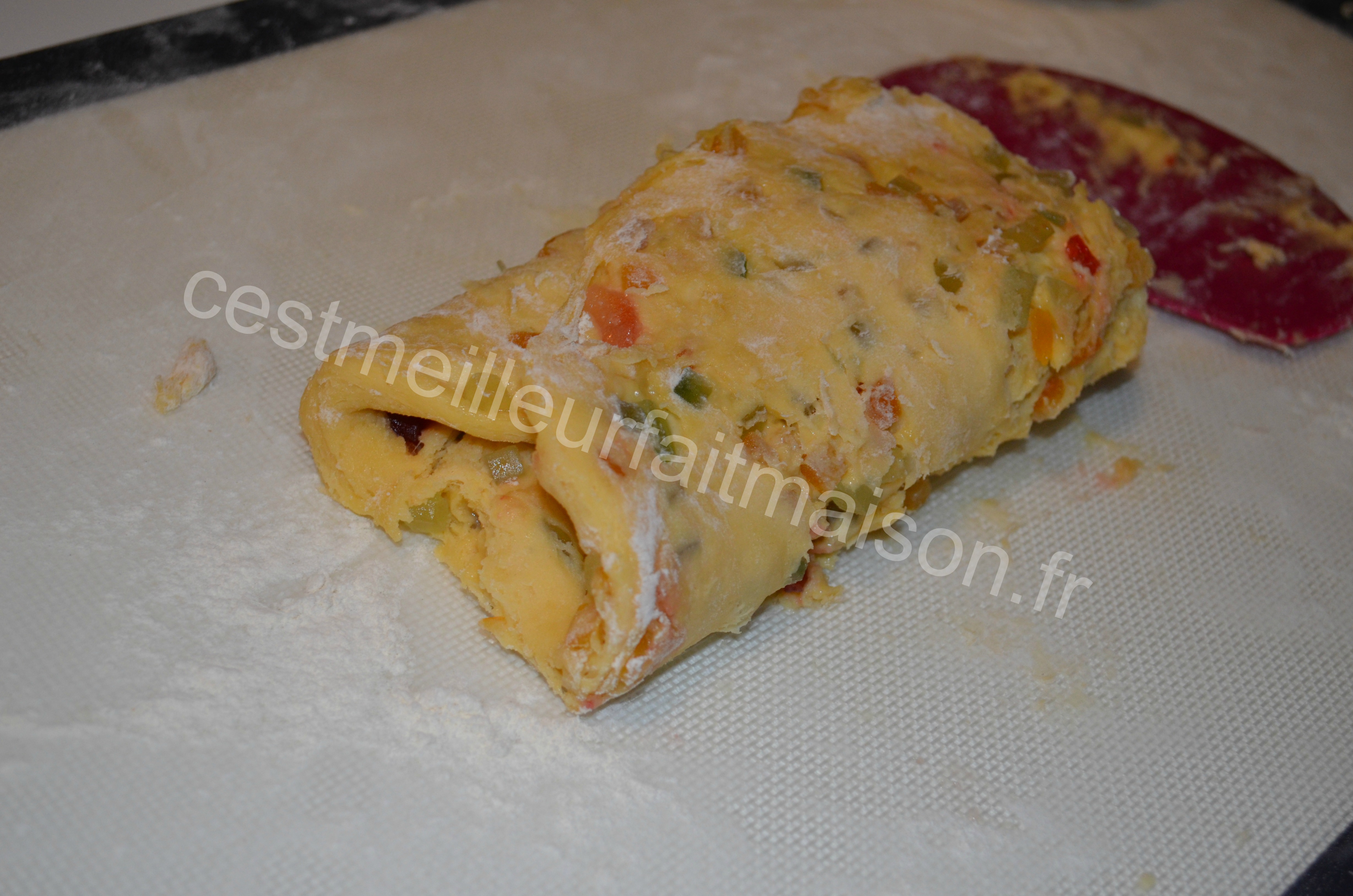 8- Le lendemain, dégazer à nouveau la pâte et la diviser en deux. Applatir chaque pâton au rouleau et le plier en trois. Refaire l’opération 2 fois. Ca colle donc il faut bien fariner à chaque fois. J’avoue que l’utilisation du Roul’pat de Guy Demarle facilite la tâche.