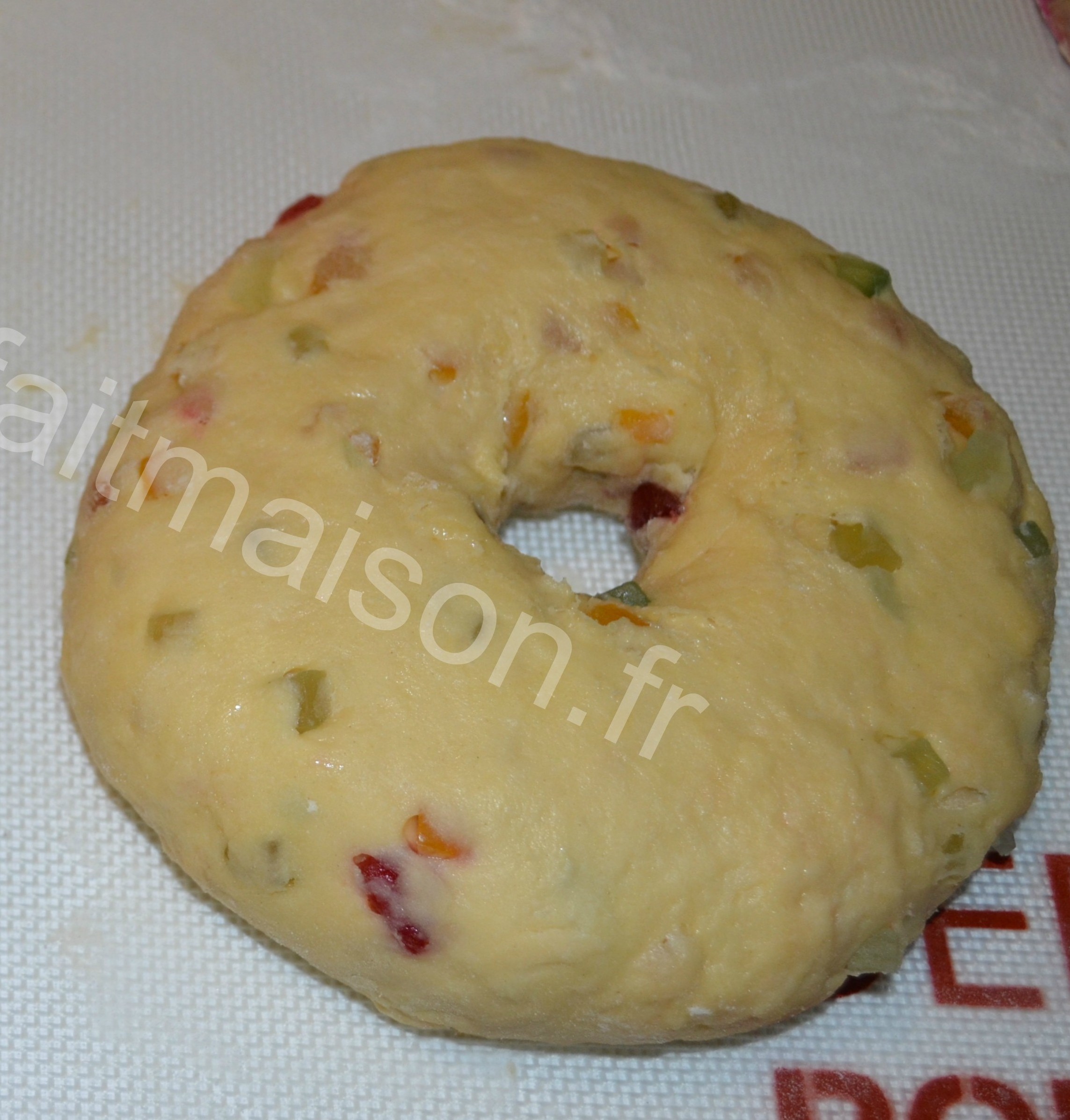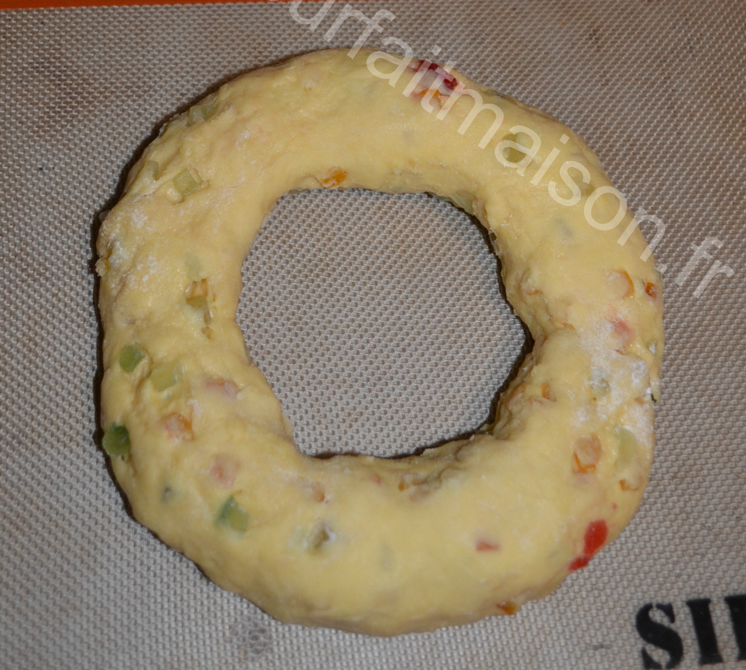10-Faire un trou et l’agrandir. J’ai utilisé la méthode de Mercotte pour les bagels (vue dans l’émission Le meilleur pâtissier). Je mets deux doigts au centre et je tourne en faisant des cercles pour agrandir. Du coup, je mets de la farine partout mais la méthode est pratique.