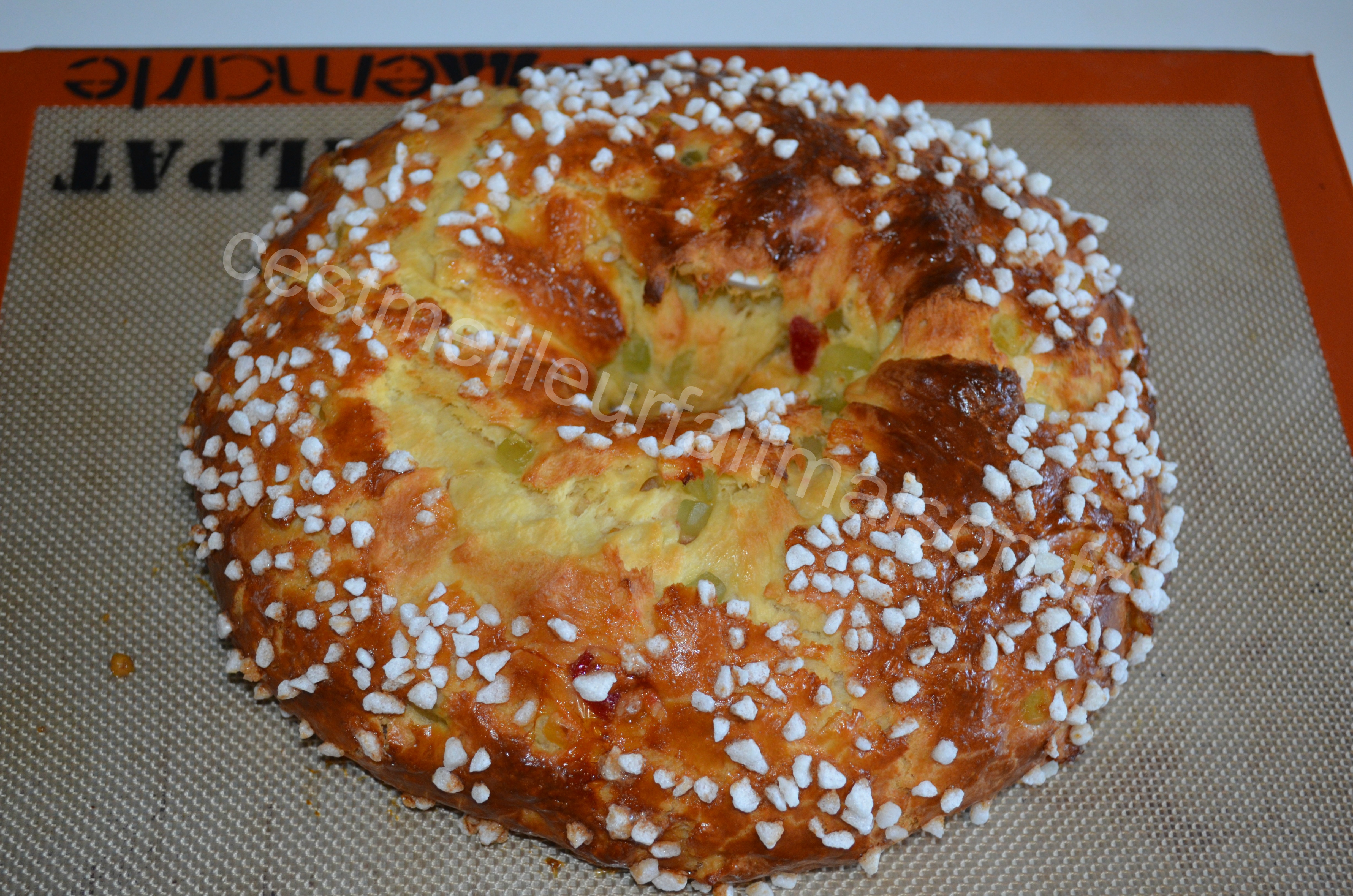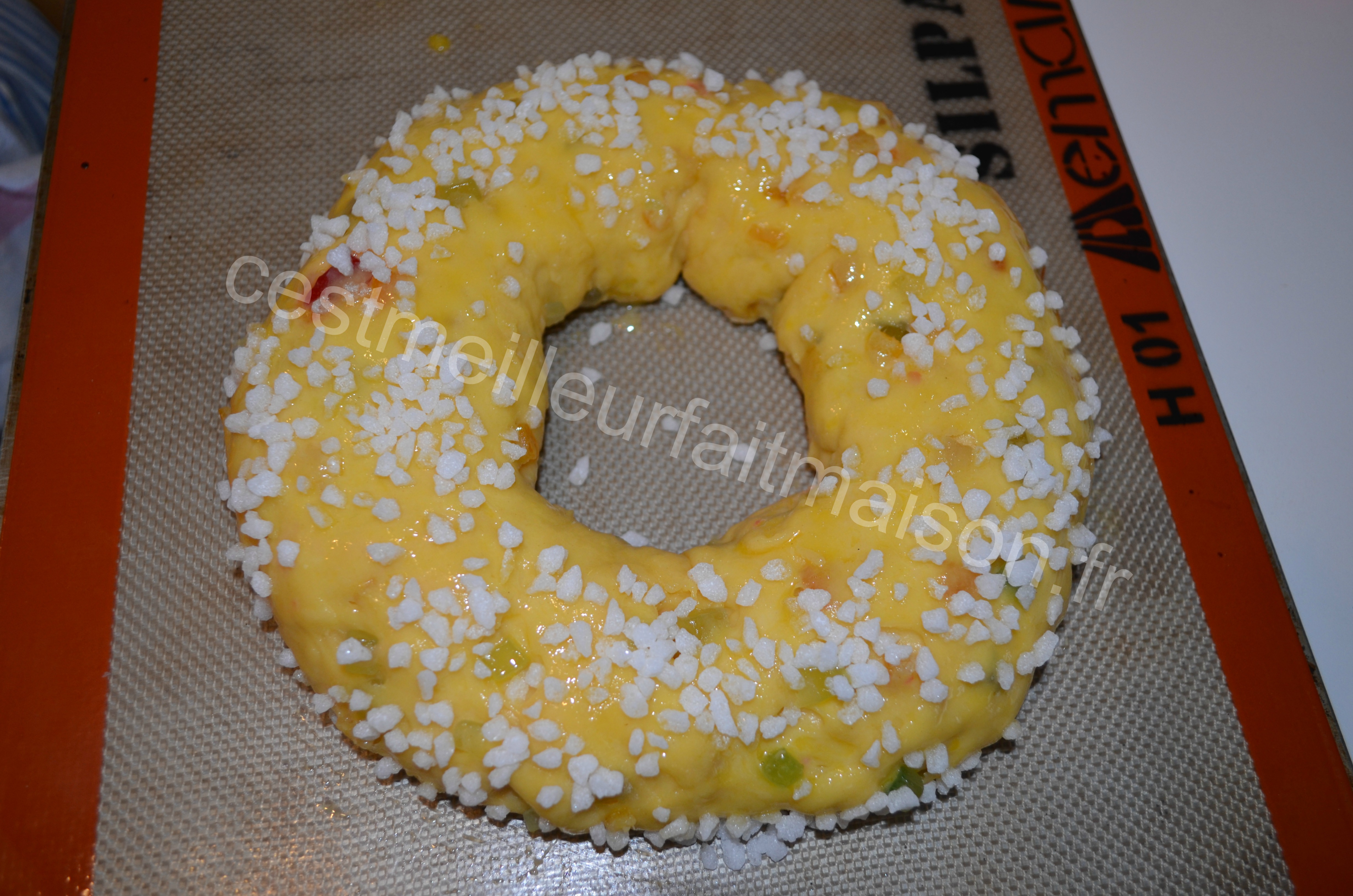 12- Au bout de ce temps, préchauffer le four à 170°C. Battre un oeuf avec un pincée de sel et dorer les couronnes. Parsemer de sucre en grains. Enfourner pour 30 min à surveiller.