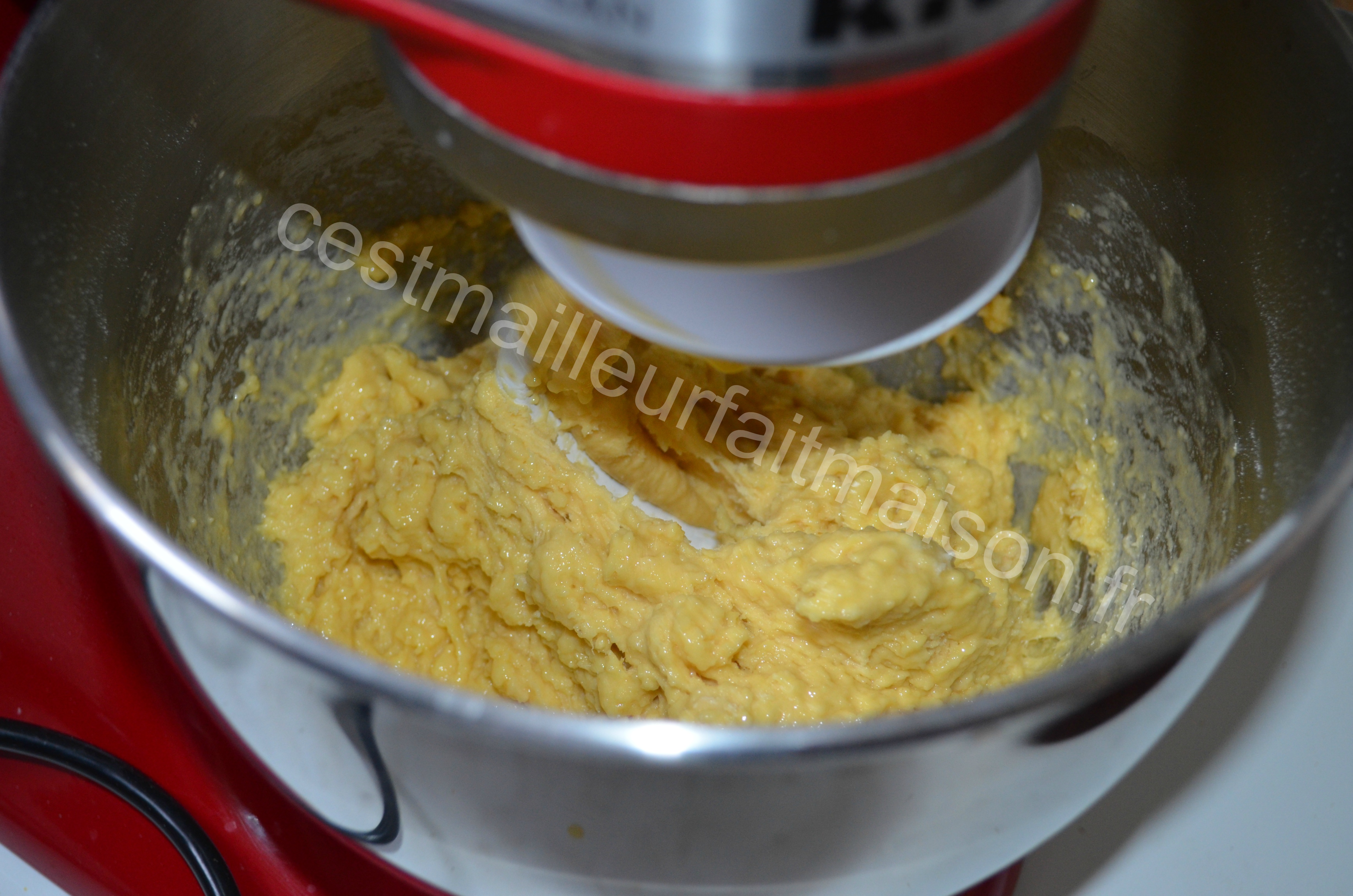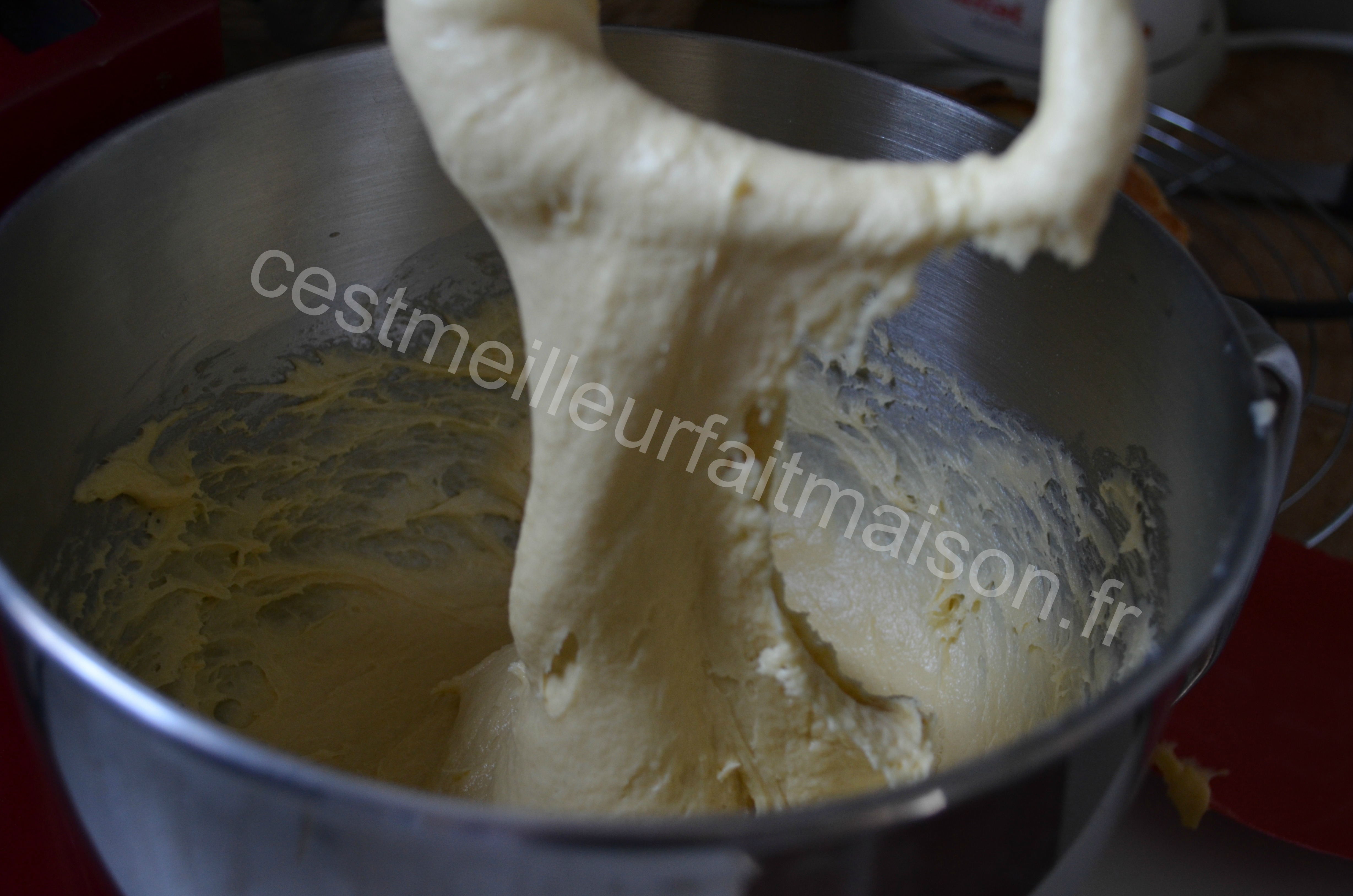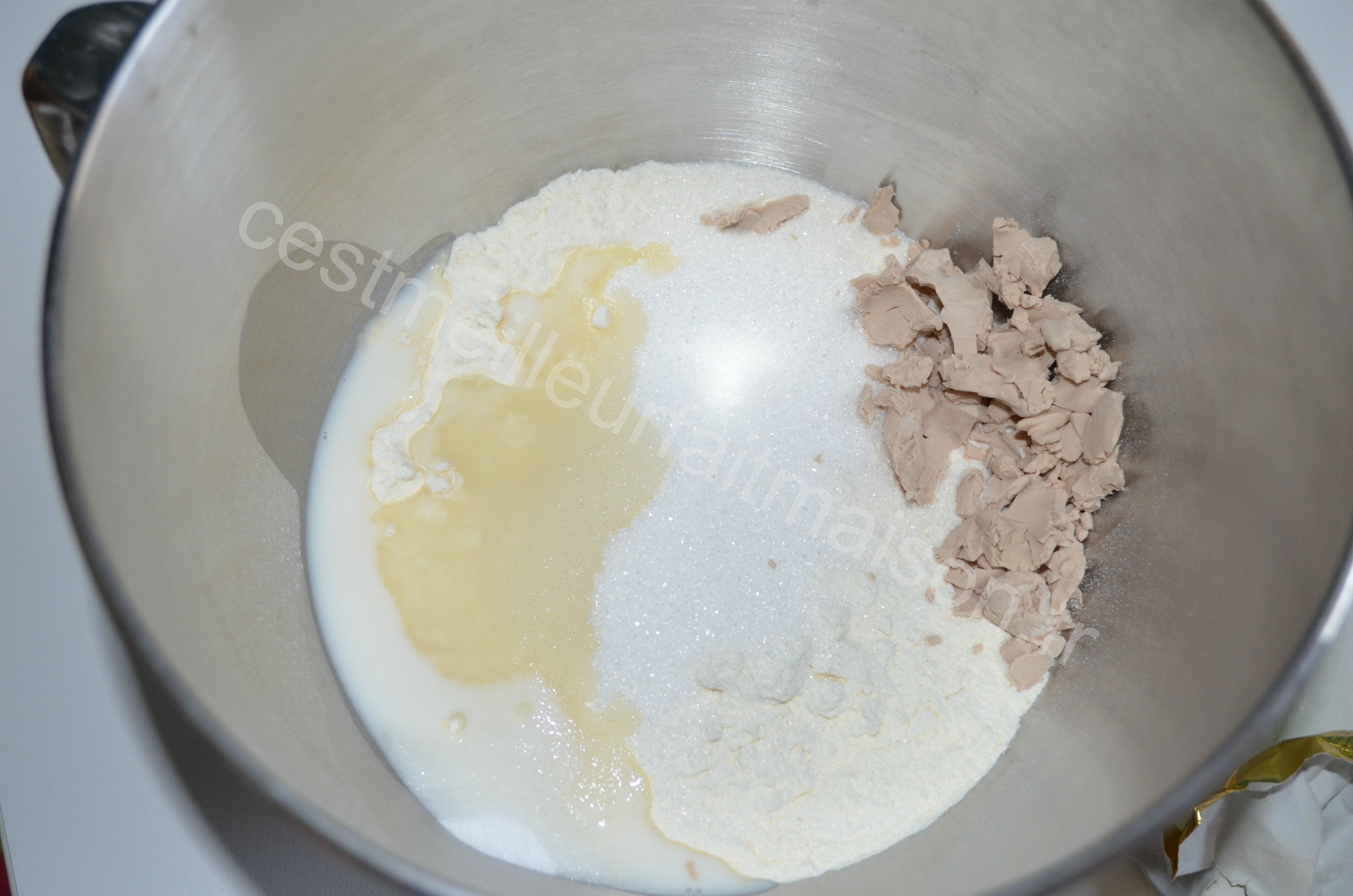 3-Mettre dans le bol du Kitchenaid la farine, la levure émiettée, le sel (qui ne doit pas toucher la levure), le lait et le sucre. Pétrir pendant 8 min avec le crochet pétrisseur en ajoutant les oeufs battus en deux fois.