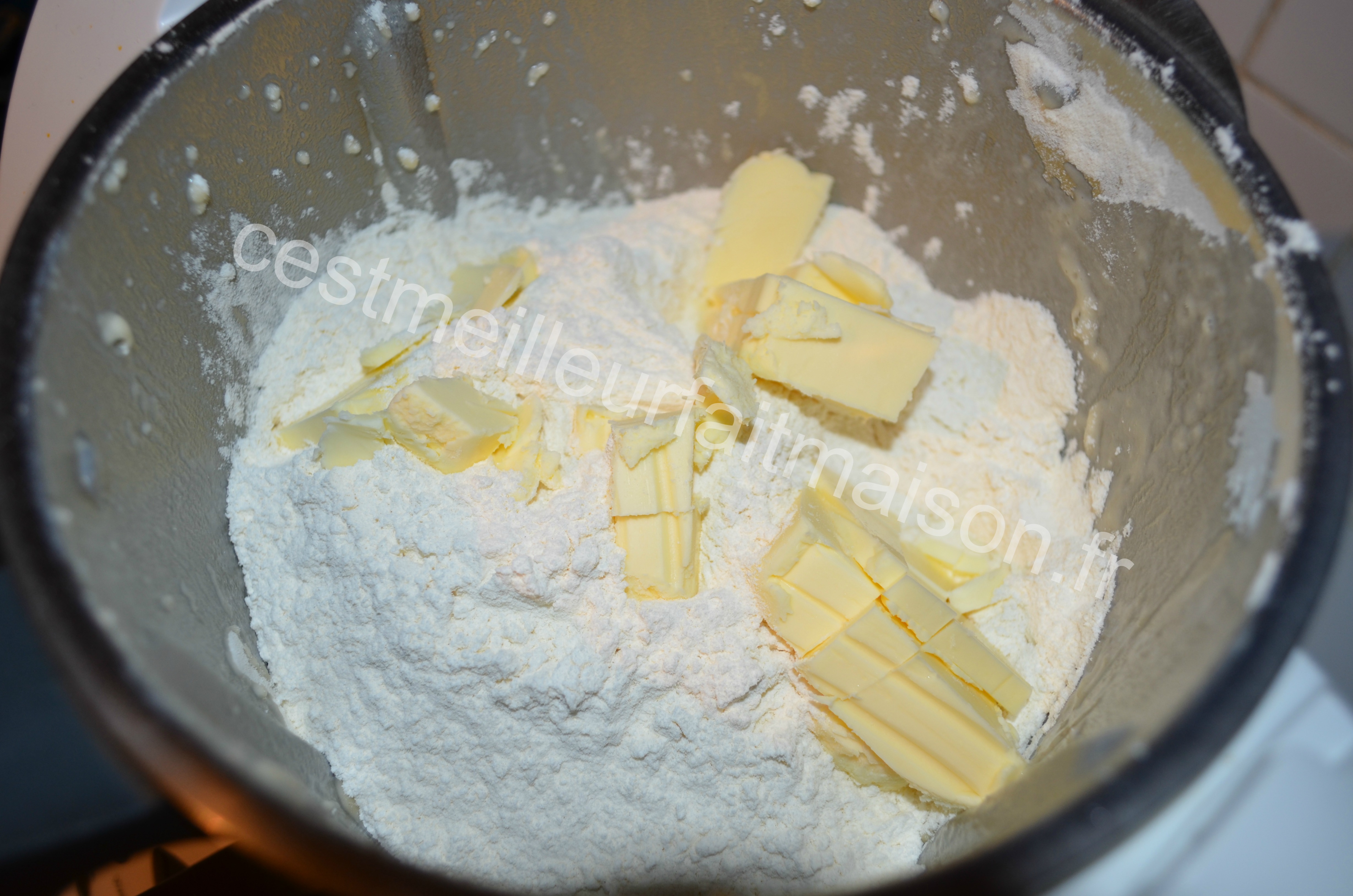 2-Ajouter 350g de farine et les oeufs. Mélanger 15 sec Vitesse 5. Ajouter les 300g restant de farine et le beurre coupé en morceaux. Pétrir 3 min.