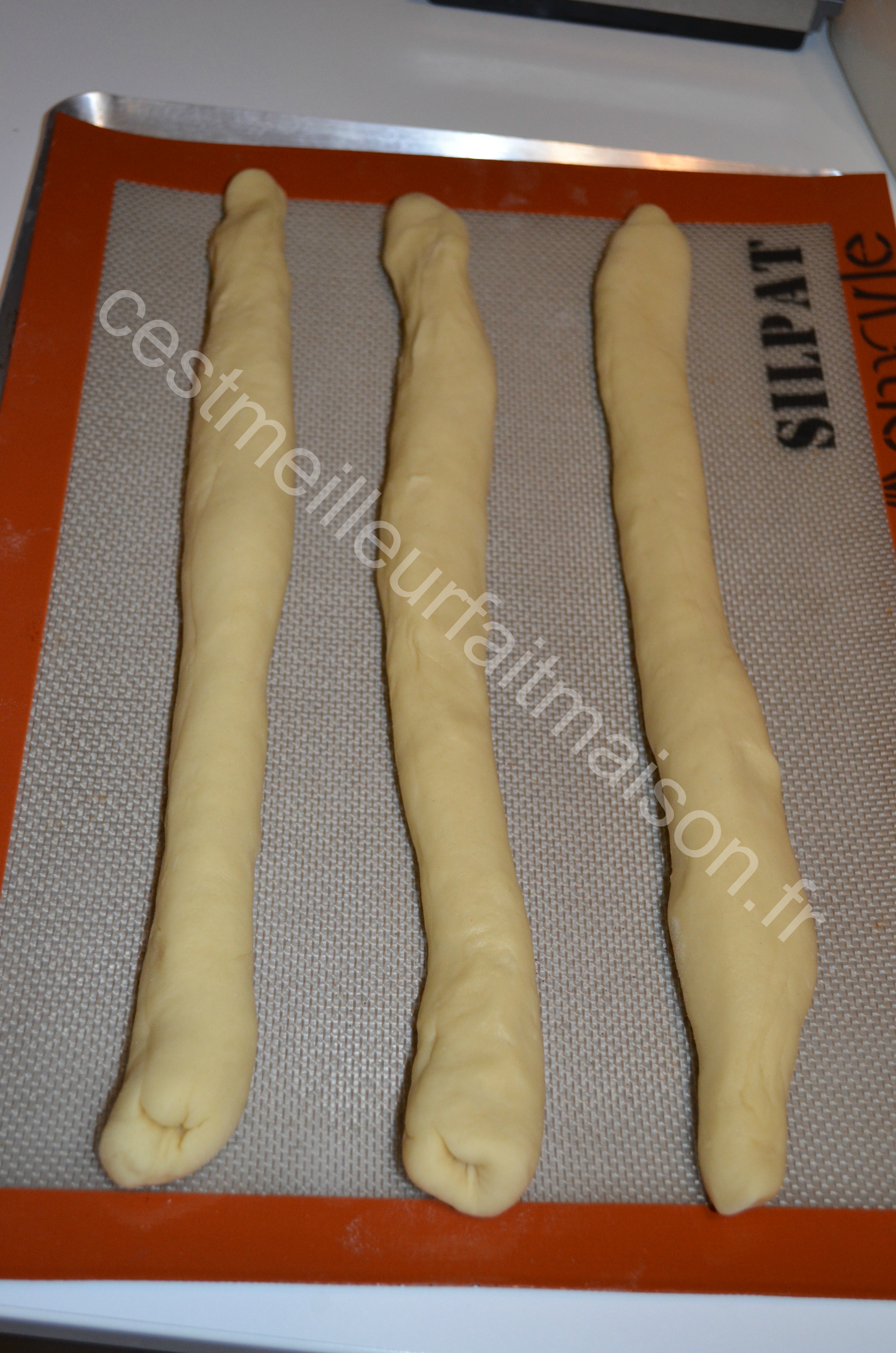 3-Sortir le pâte du bol et diviser le paton en deux. Diviser chaque paton en trois pour une tresse ou en quatre pour une brioche dans un moule à cake. Former les brioches. Dorer au jaune d’oeuf et parsemer de sucre en grains.